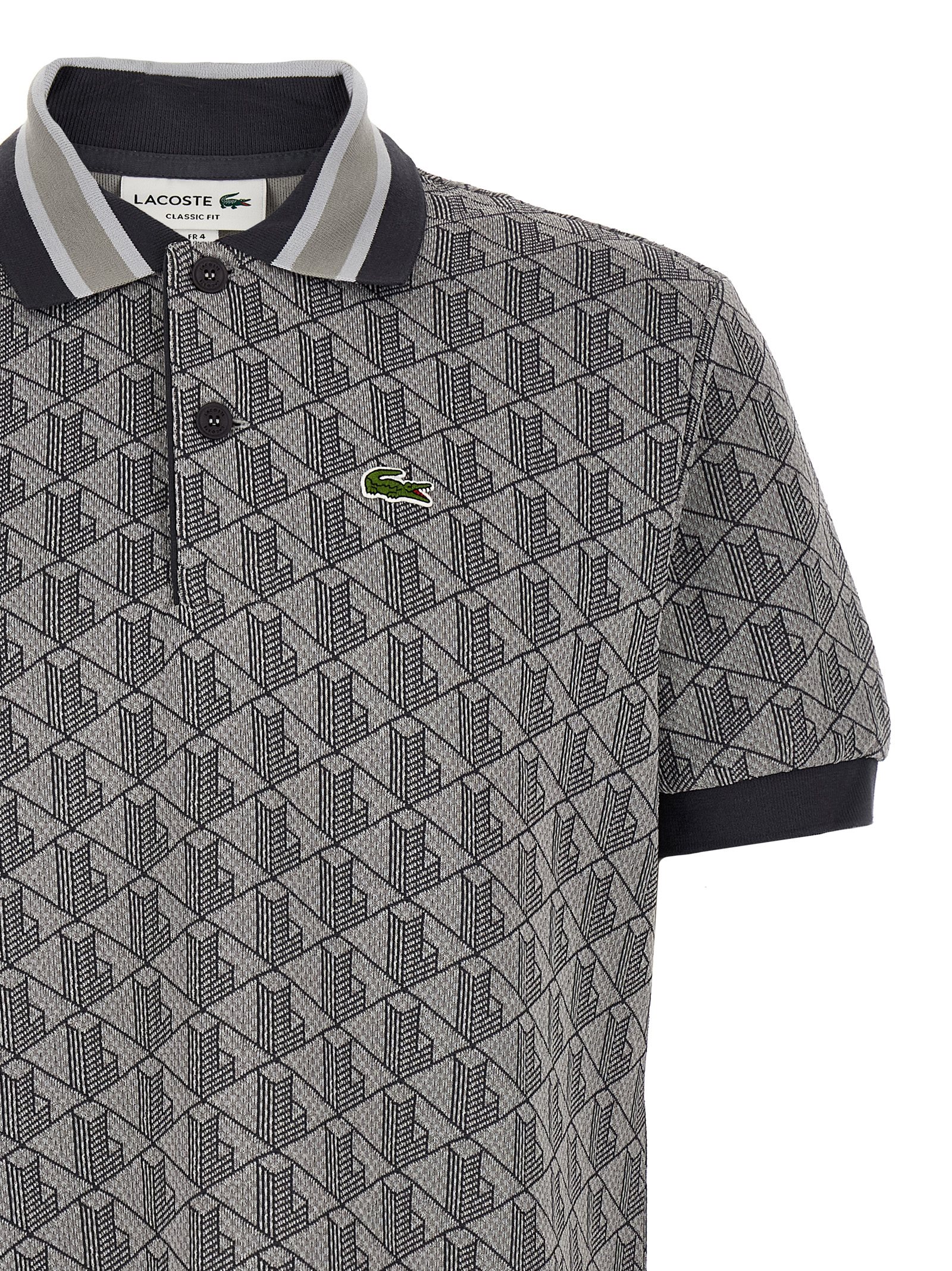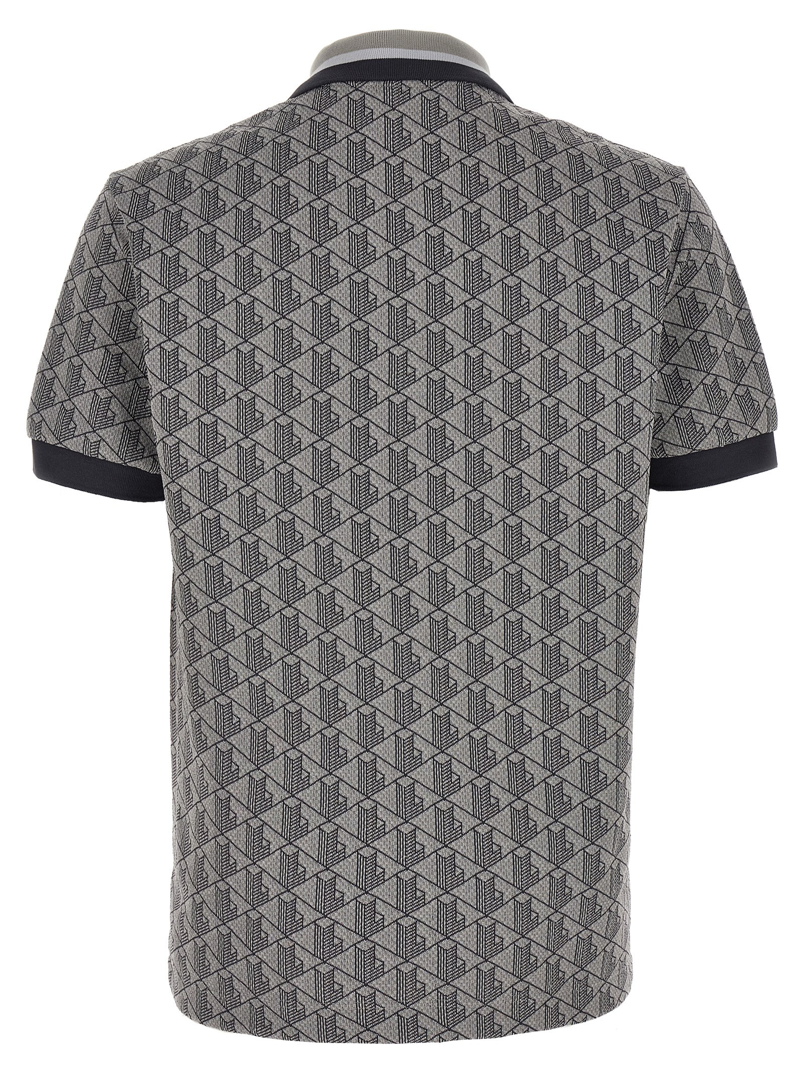‘Paris’ vintage jacquard monogram cotton blend polo shirt with ribbed and button stretch knit collar, front logo patch, short cuffed sleeves.
