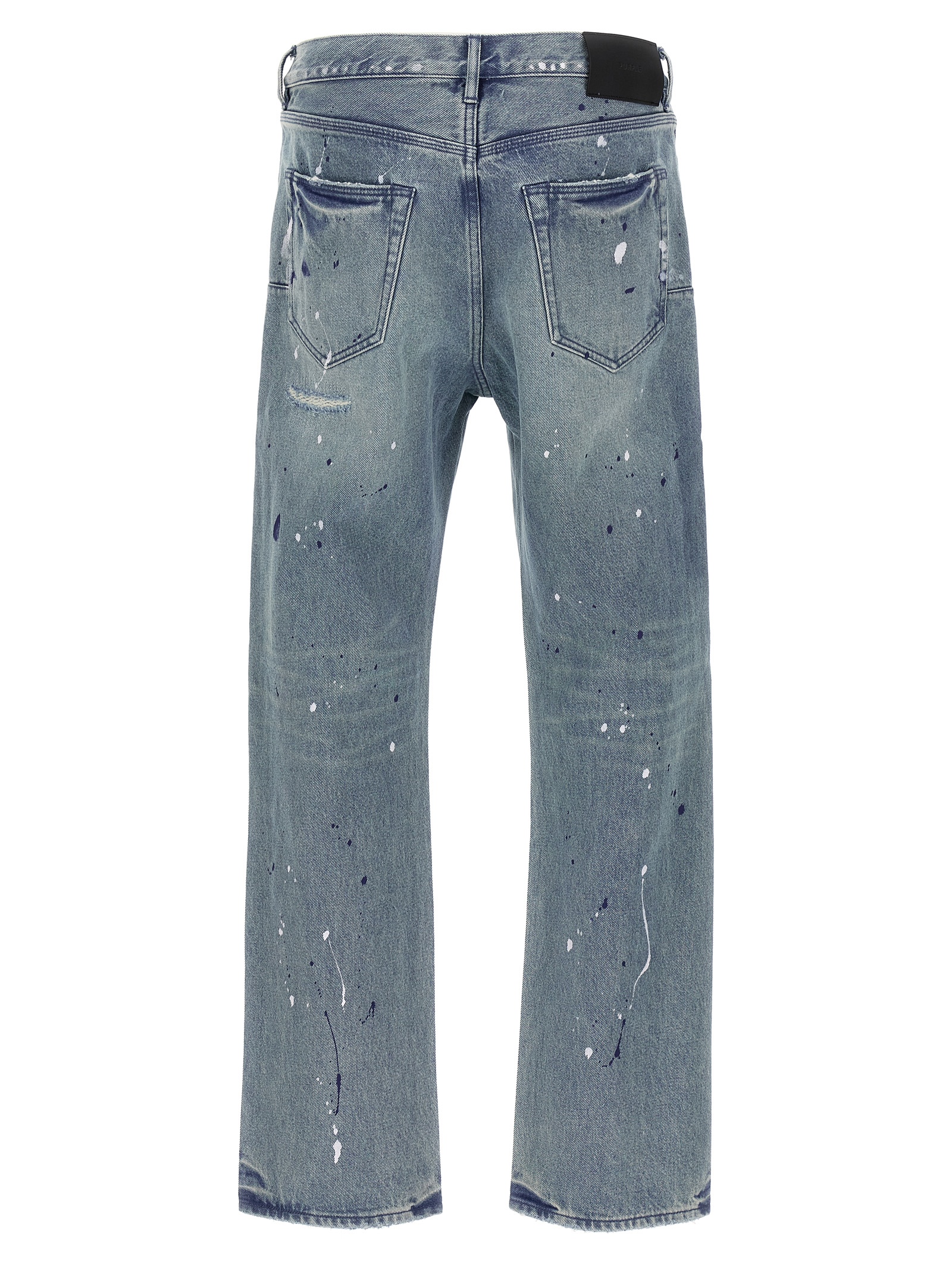 ‘Patch Repairs Foil’ straight leg cotton denim jeans with used-effect details, pockets, button closure.