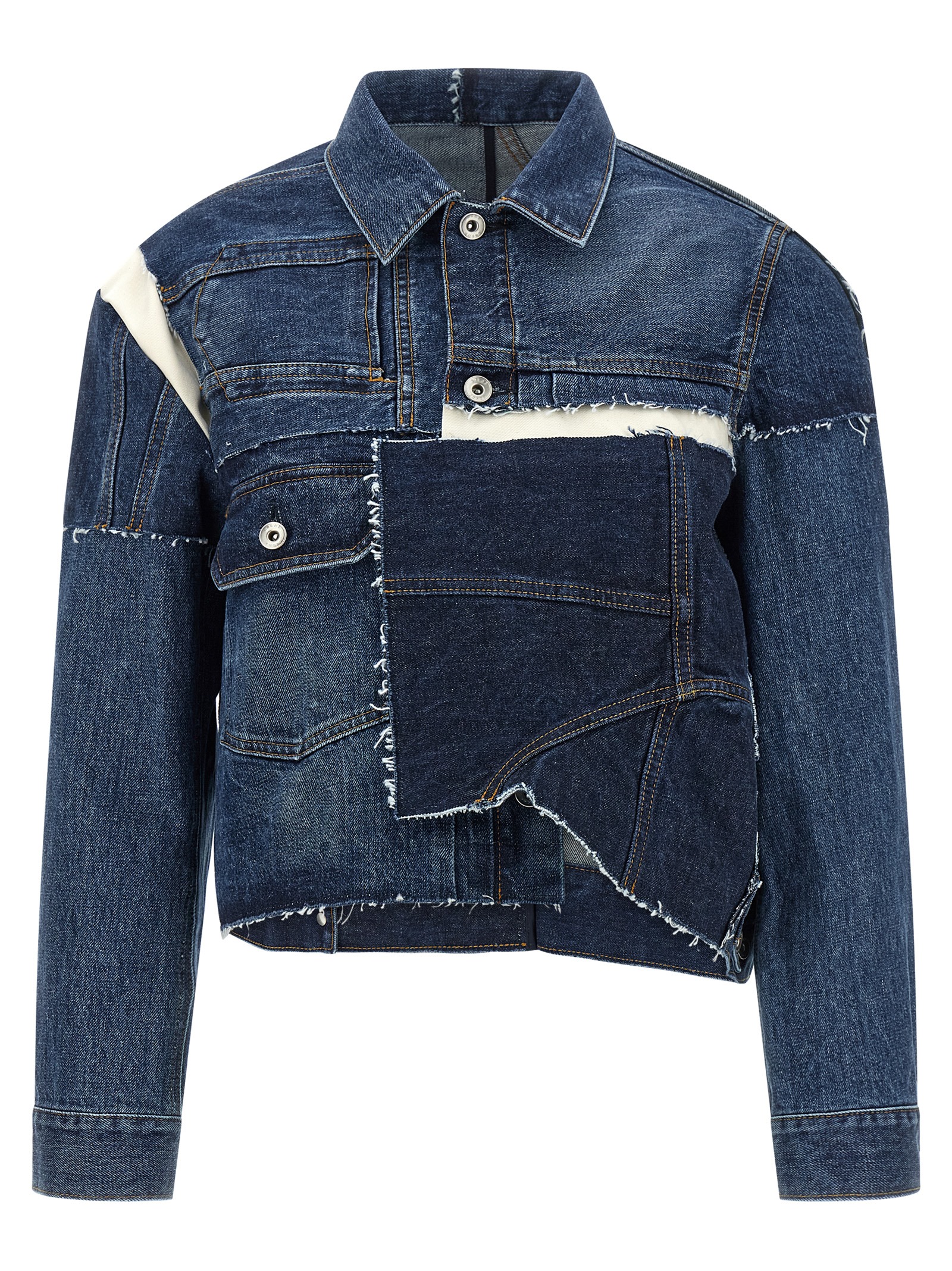Cotton denim jacket with contrast stitching, patchwork construction with frayed raw cut hem details, slightly cropped design, flared silhouette, shirt collar, front metal button closure, pockets, long cuffed sleeves.