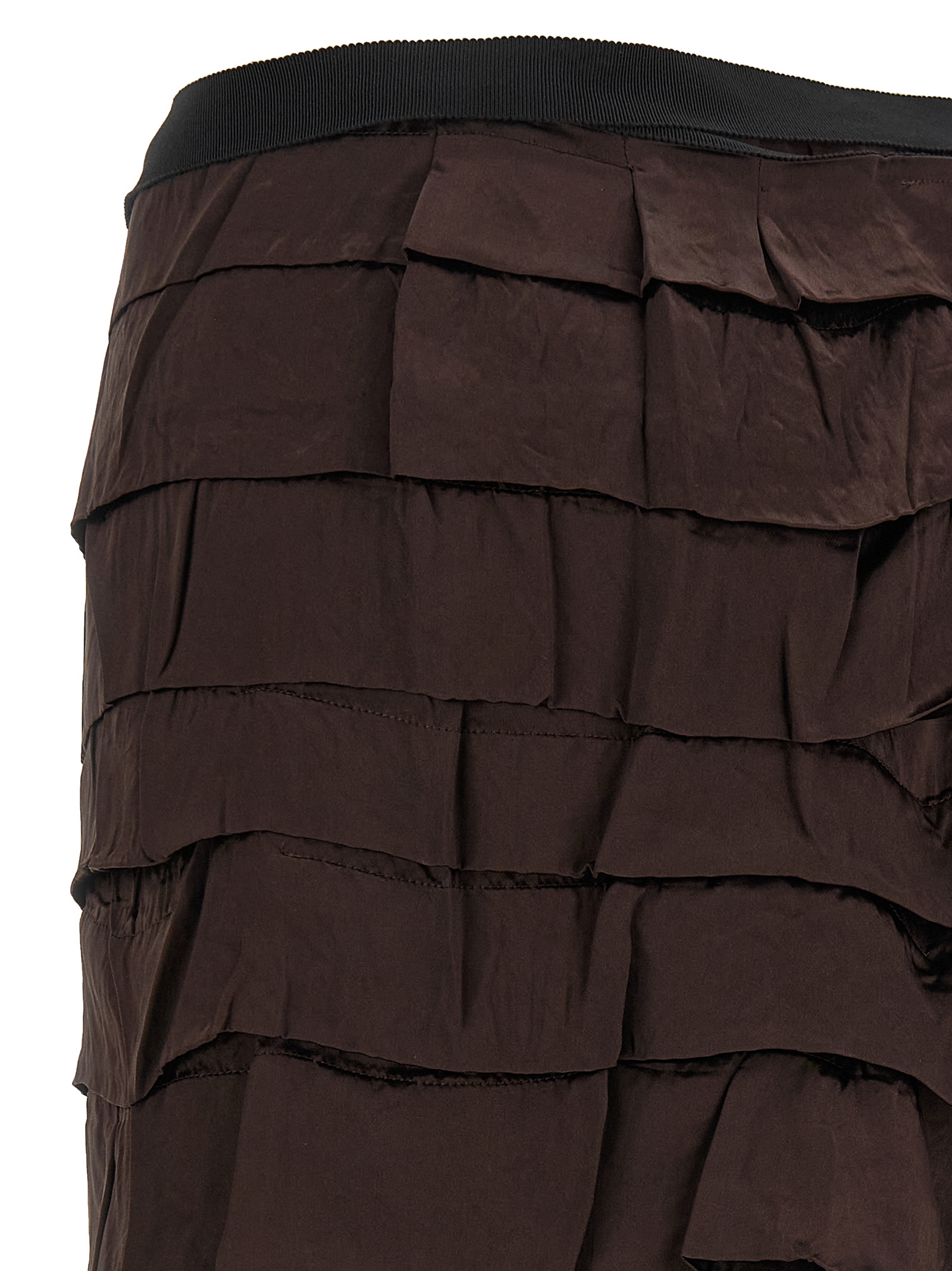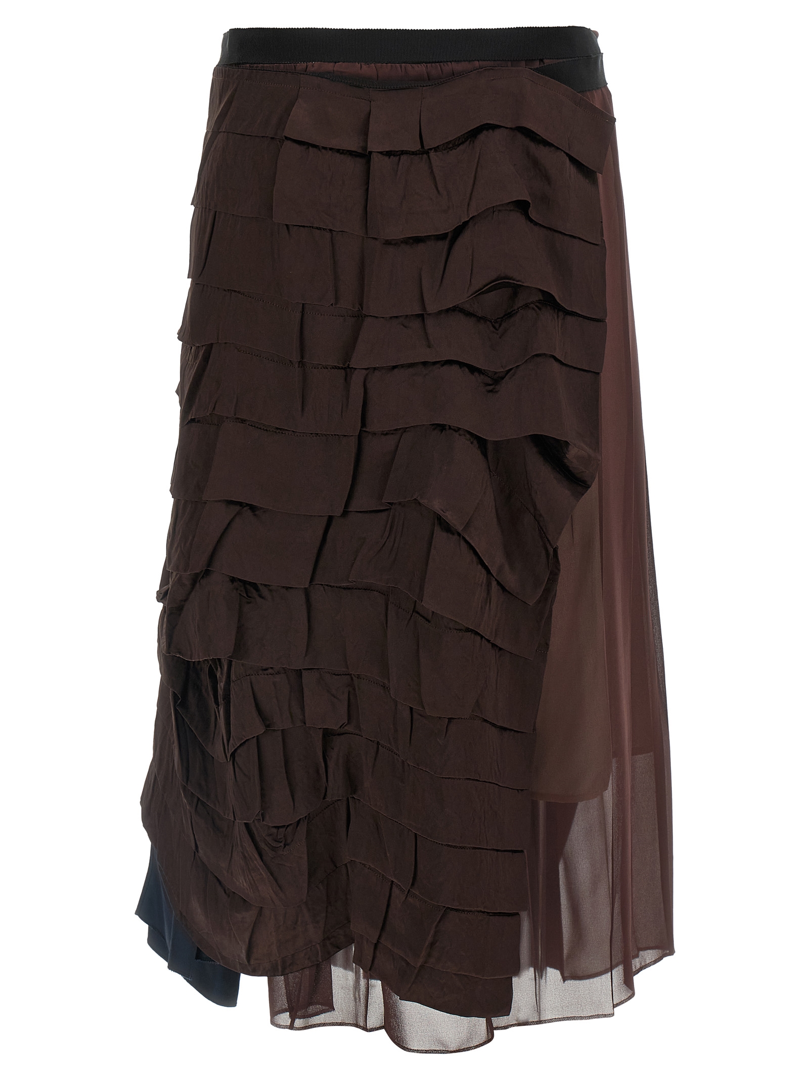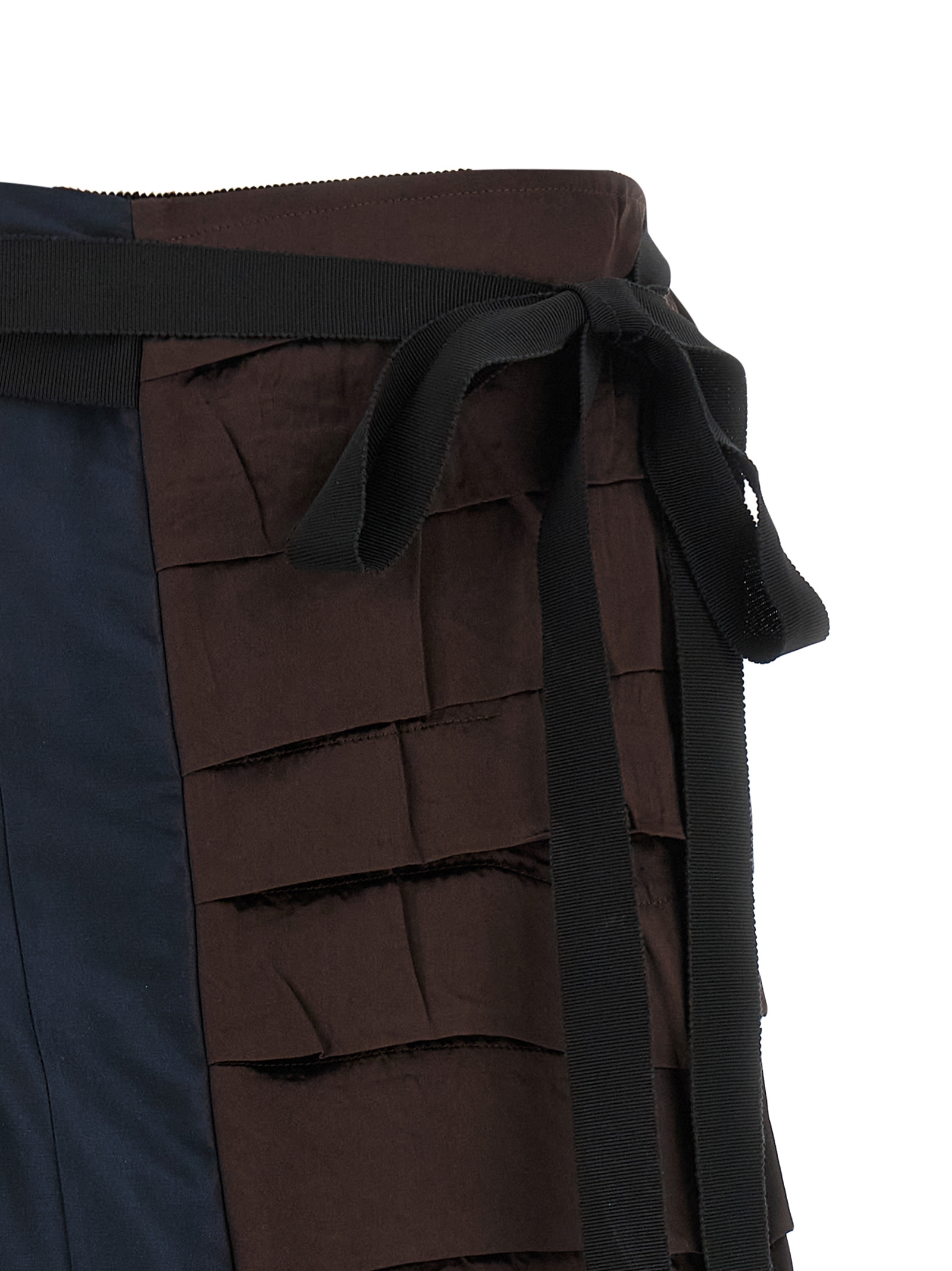 Midi skirt made of panels of different fabrics, patchwork construction with ruffles and pleats, asymmetrical silhouette, wallet model with button closure and grosgrain ribbon, underskirt.