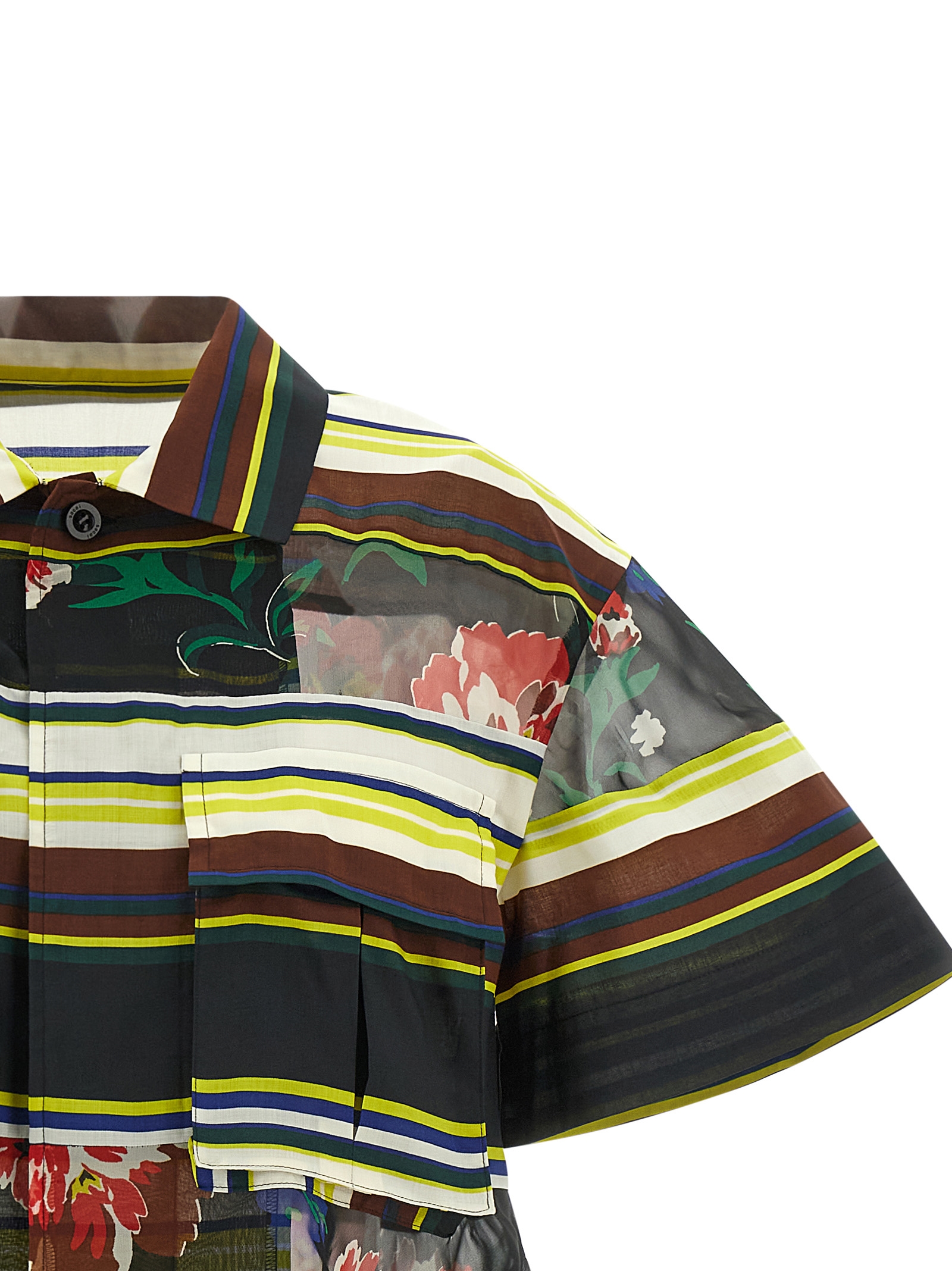 ‘Pattern Mix’ horizontal striped fabric shirt with semi-transparent floral print organza inserts, utility pockets, front hidden button closure, wide short sleeves, and flounce on the hem.