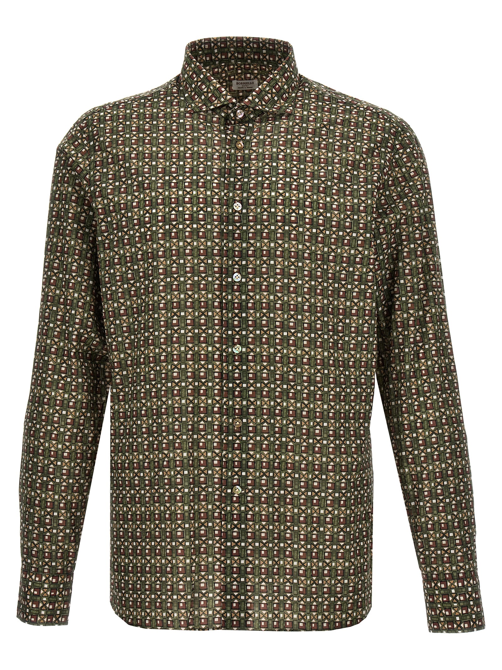 Patterned print cotton shirt with button closure, long cuffed sleeves.