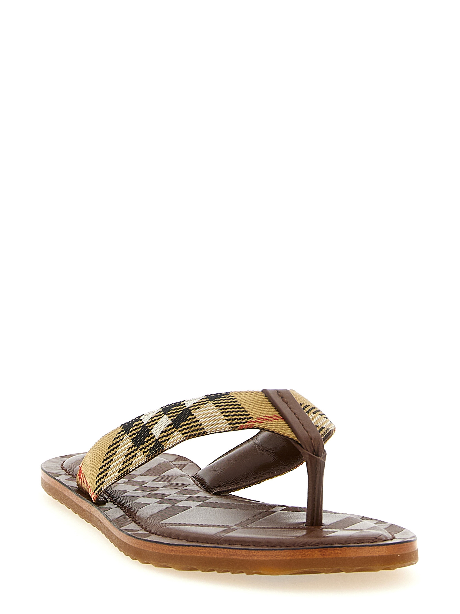 ‘Pavillon’ leather slides with ‘Check’ jacquard straps, ‘Check’ embossed’ leather insole and rubber sole with embossed contrast logo.