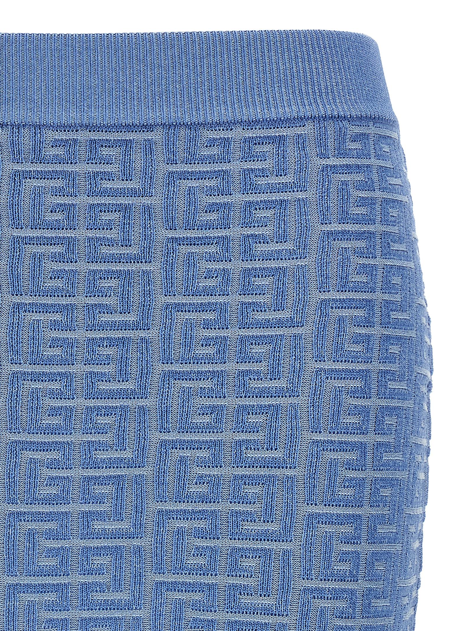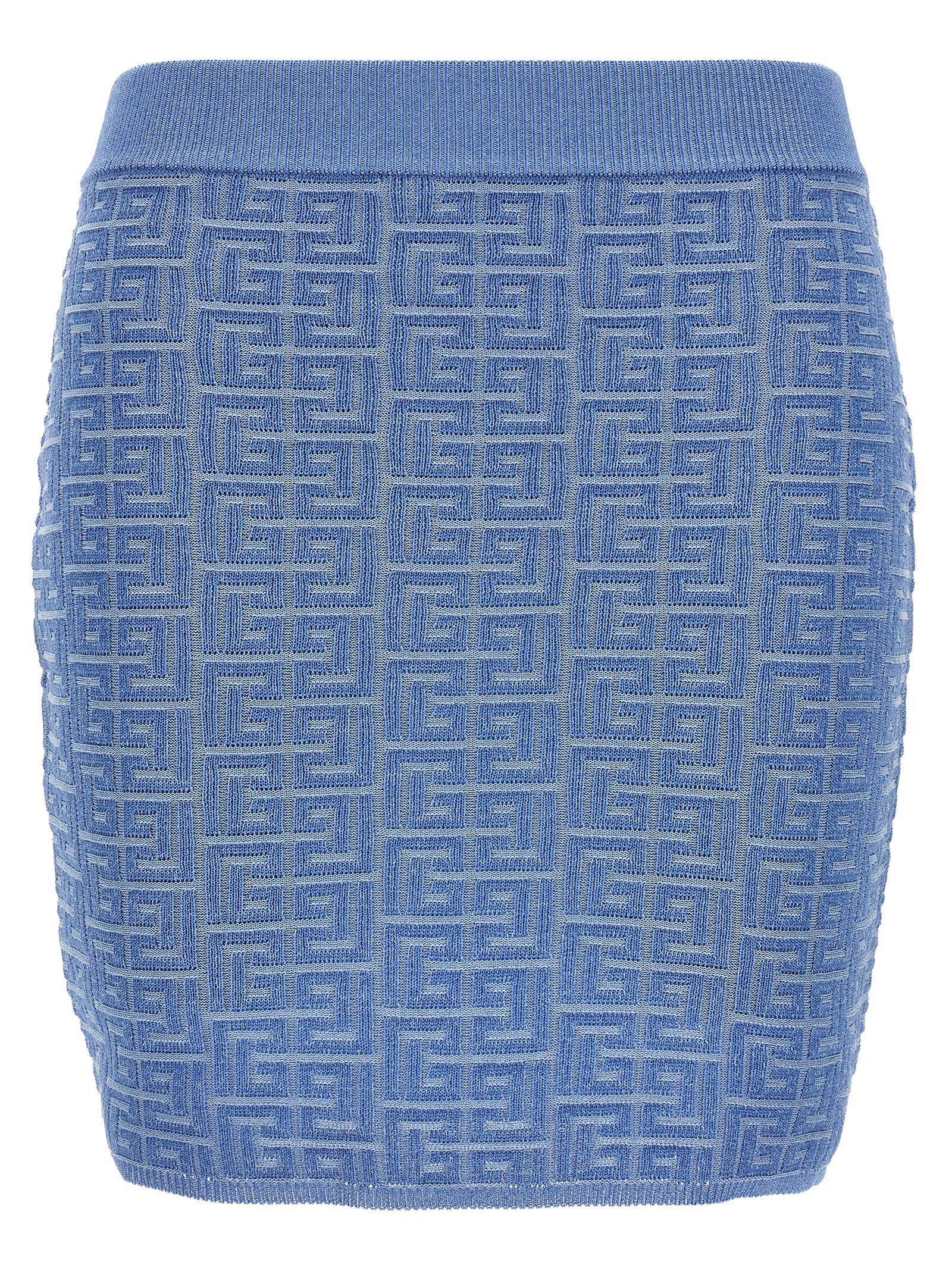 High-waisted mini skirt PB in shiny knit with labyrinth PB monogram pattern, elastic waistband with back zip closure.