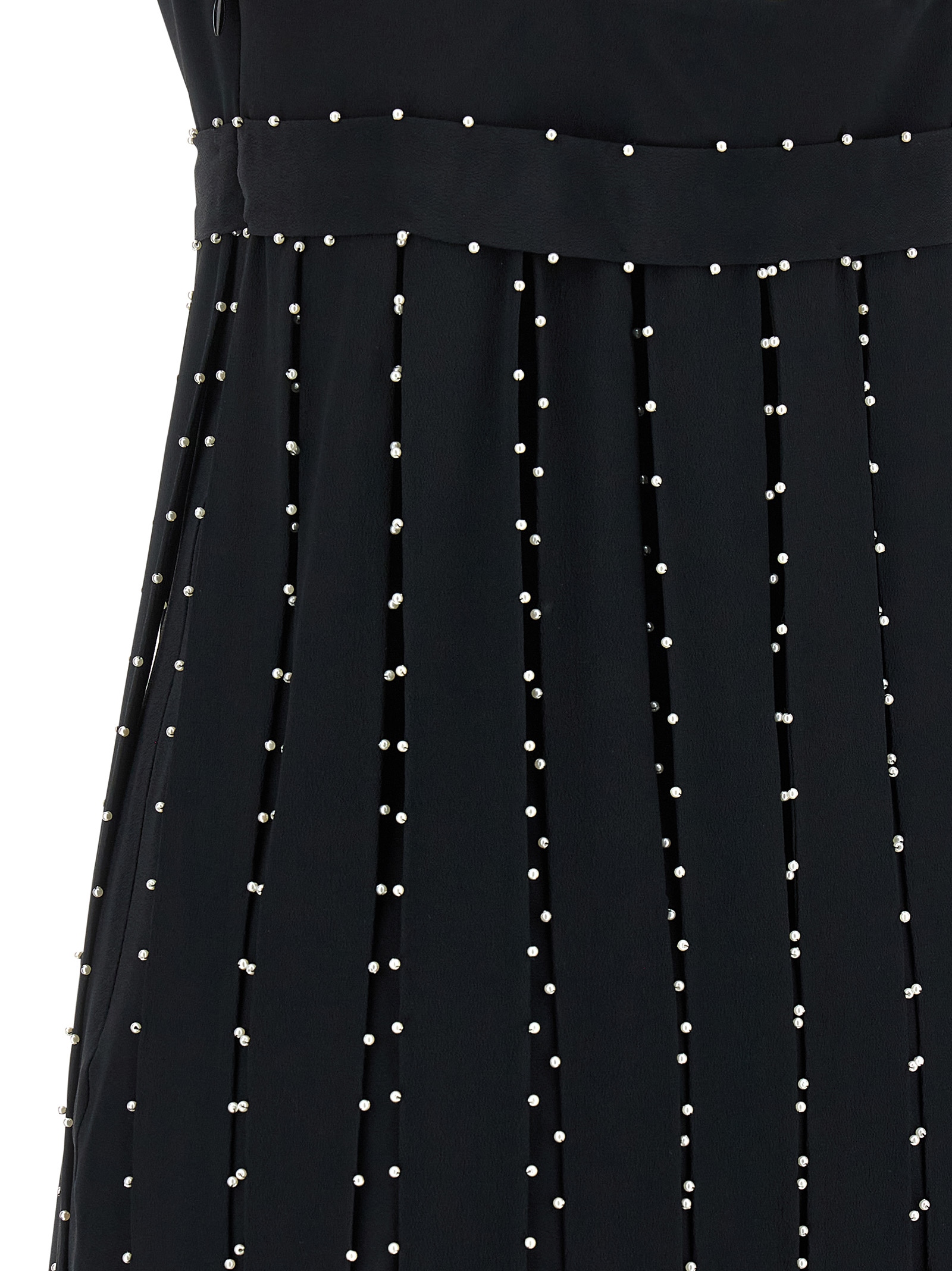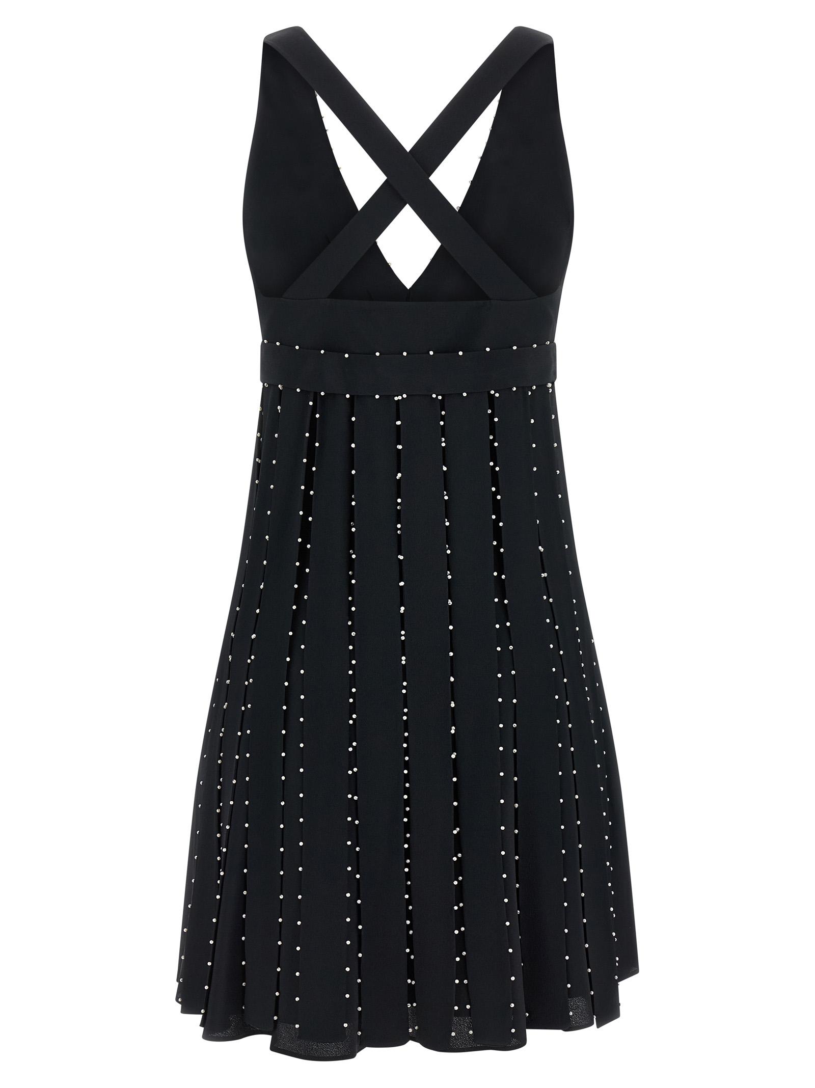 Silk blend mini dress with mini pearls and fringes appliqué, wide V-neck, wide crossed shoulder straps on the back, sleeveless, side zip closure, underskirt.