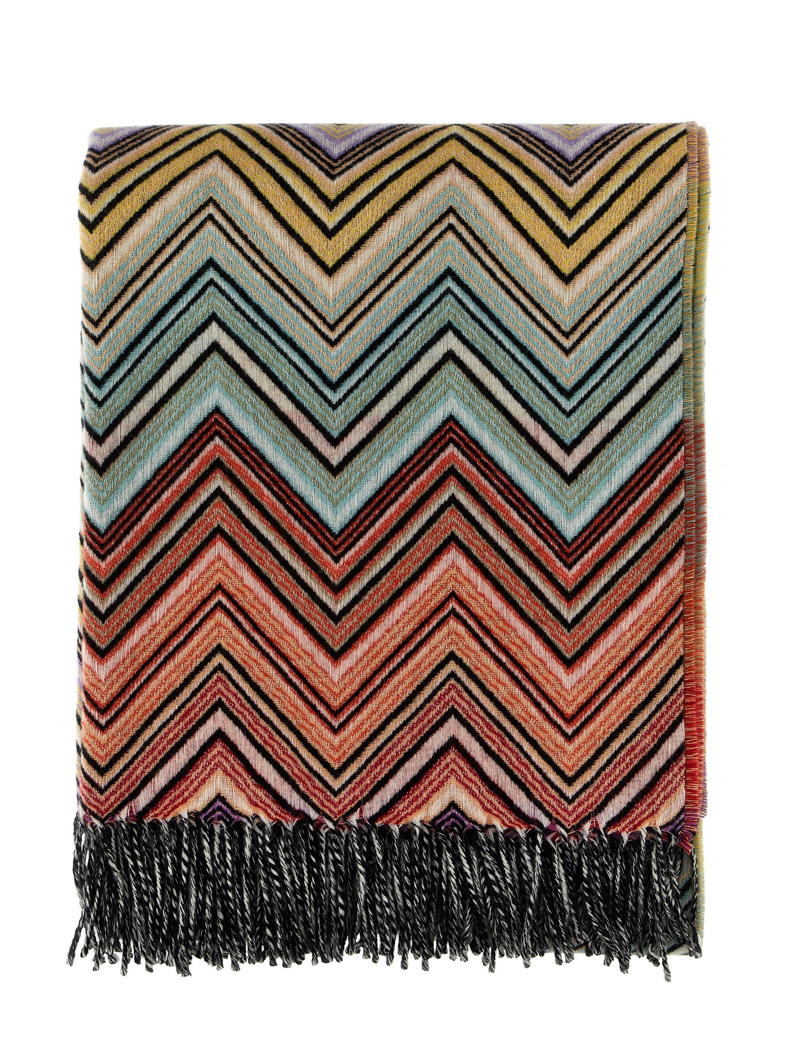 Perseo’ plaid in wool and cachemire in the iconic multicolor chevron pattern. MissoniHome gift box package.