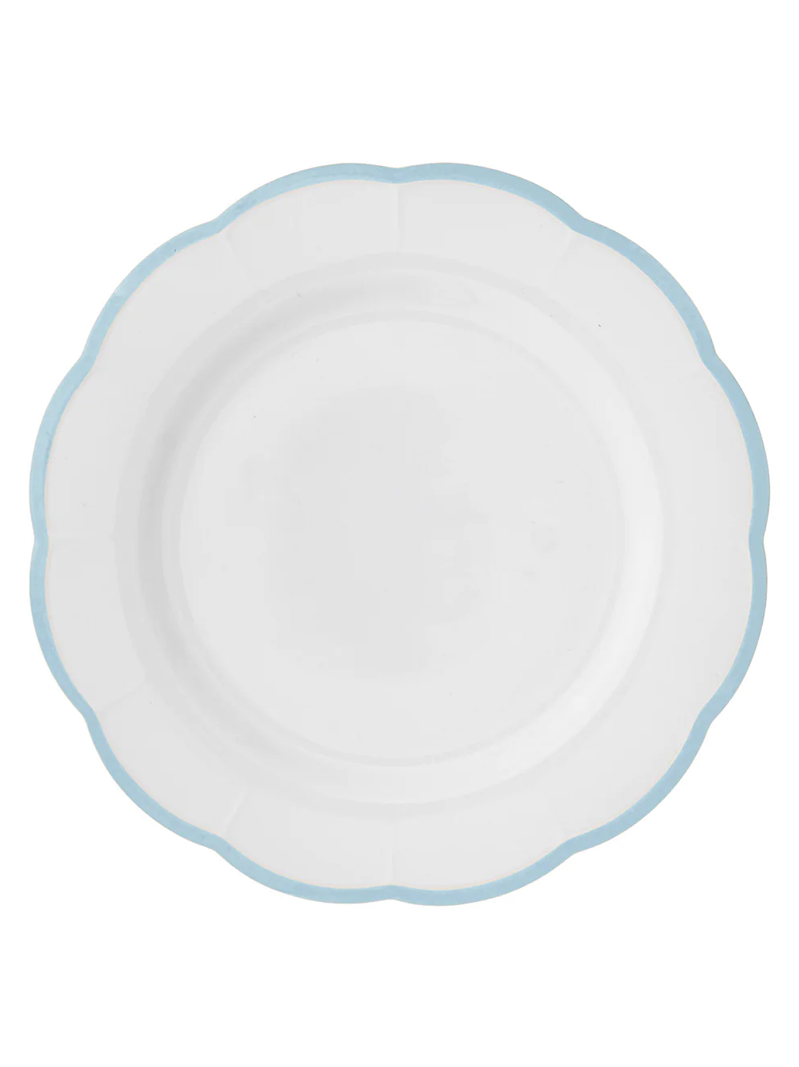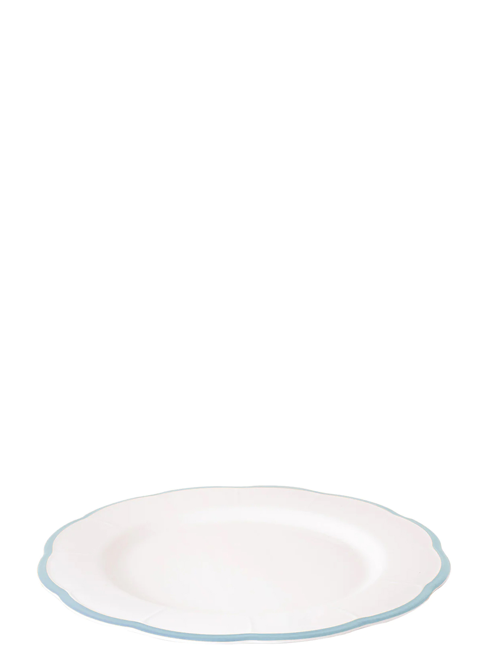 ‘Petalo’ dinner plate, white ironstone material with a blue scalloped edge. Suitable for dishwasher, suitable for microwave.