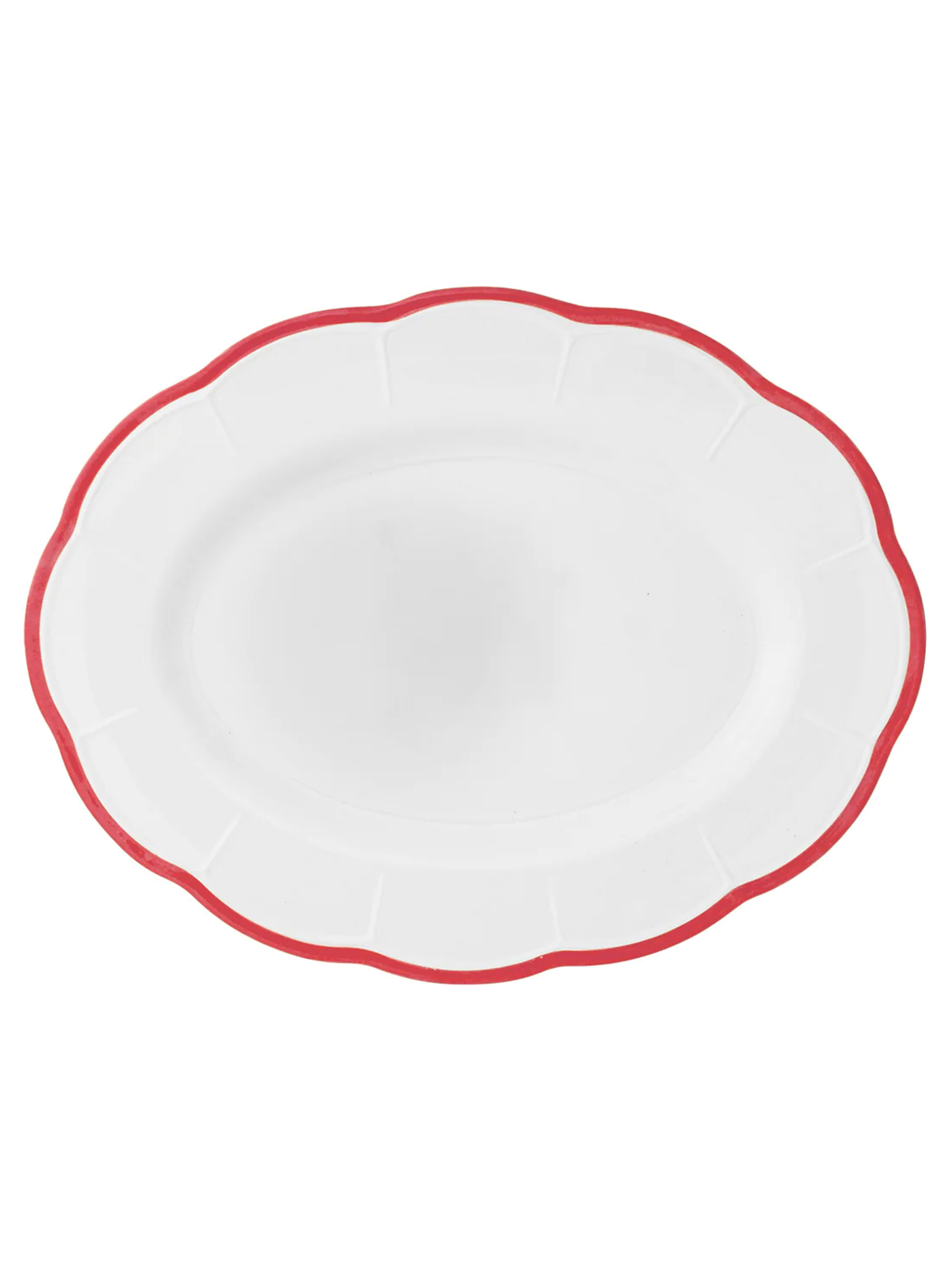 Oval ‘Petalo’ serving plate, white ironstone material with red scalloped edge. Suitable for dishwasher, suitable for microwave.