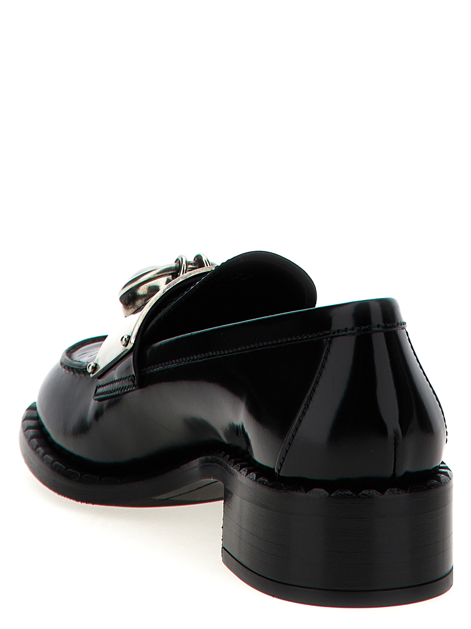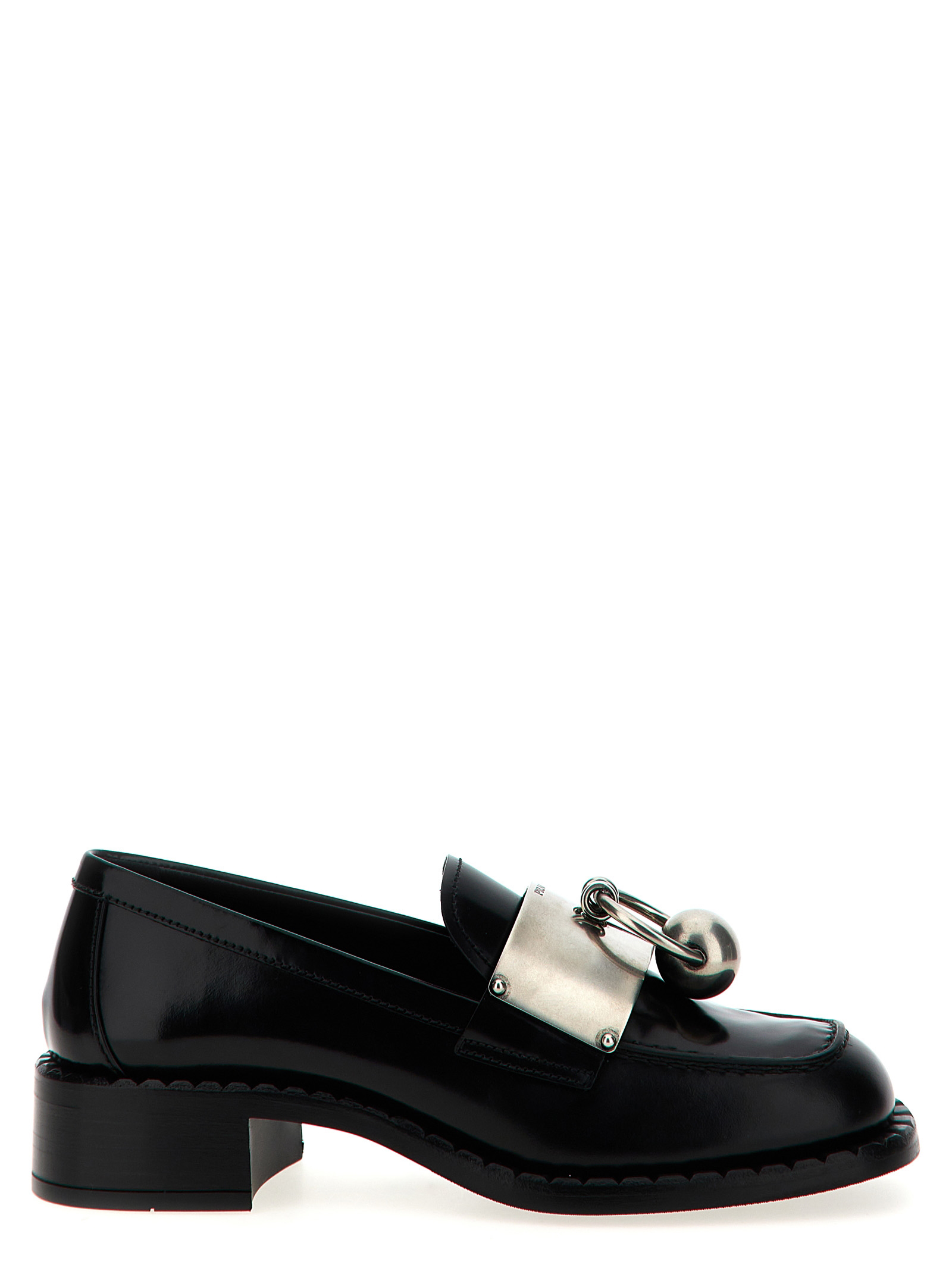 Smoked brushed leather loafers with front metal piercing and plaque detail, monobloc rubber sole with fire logo.