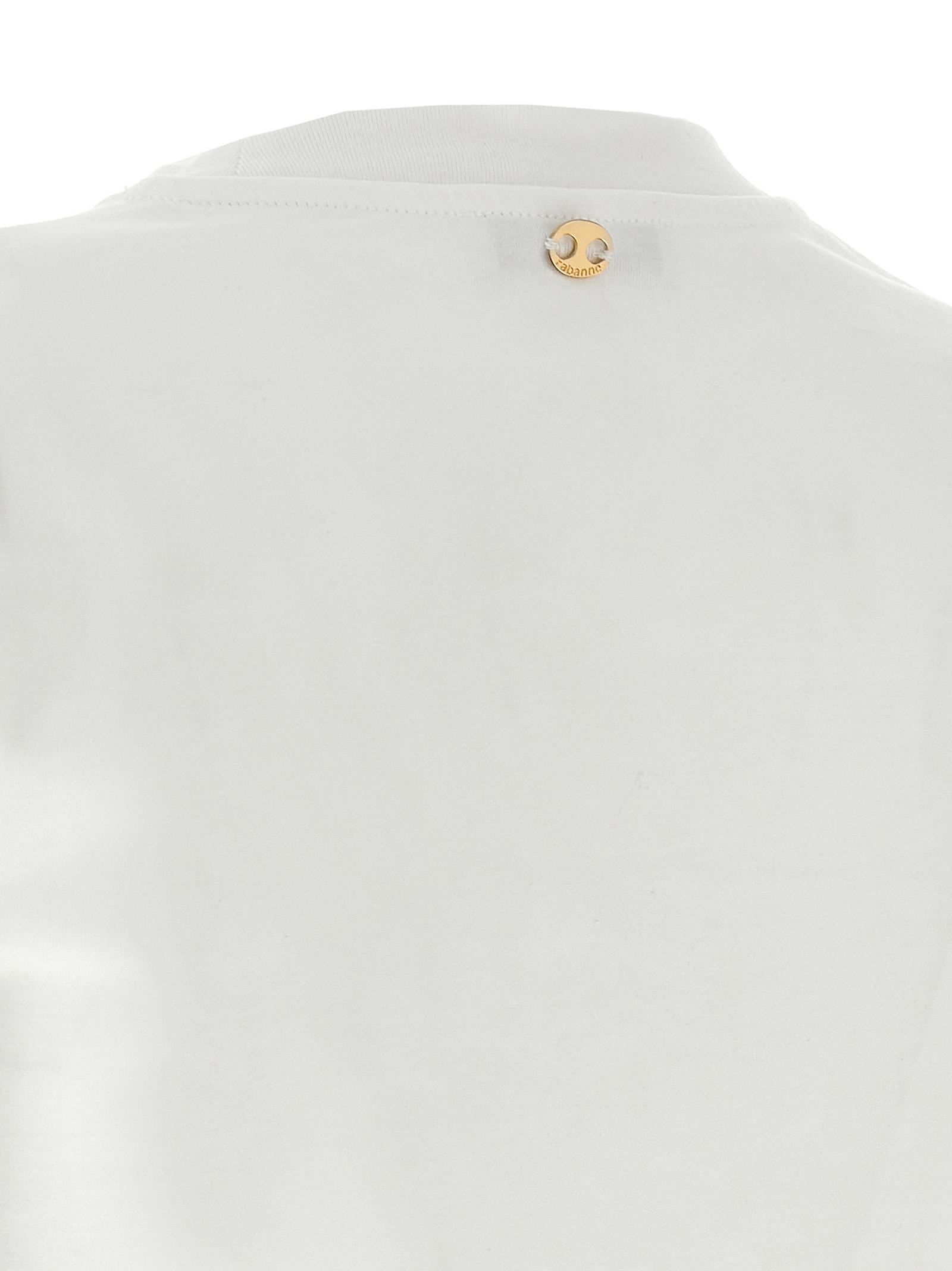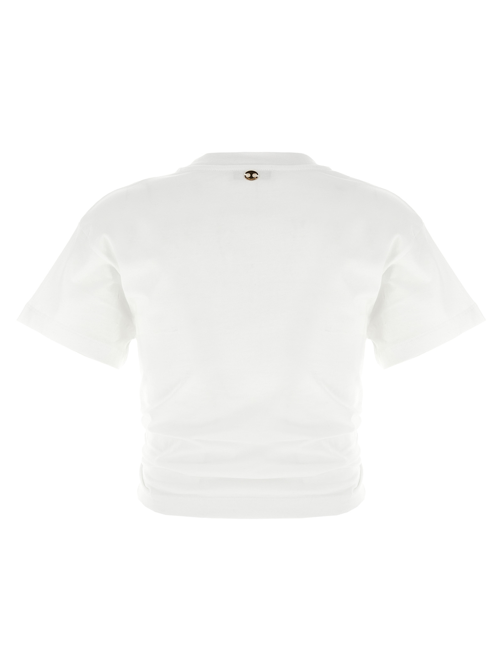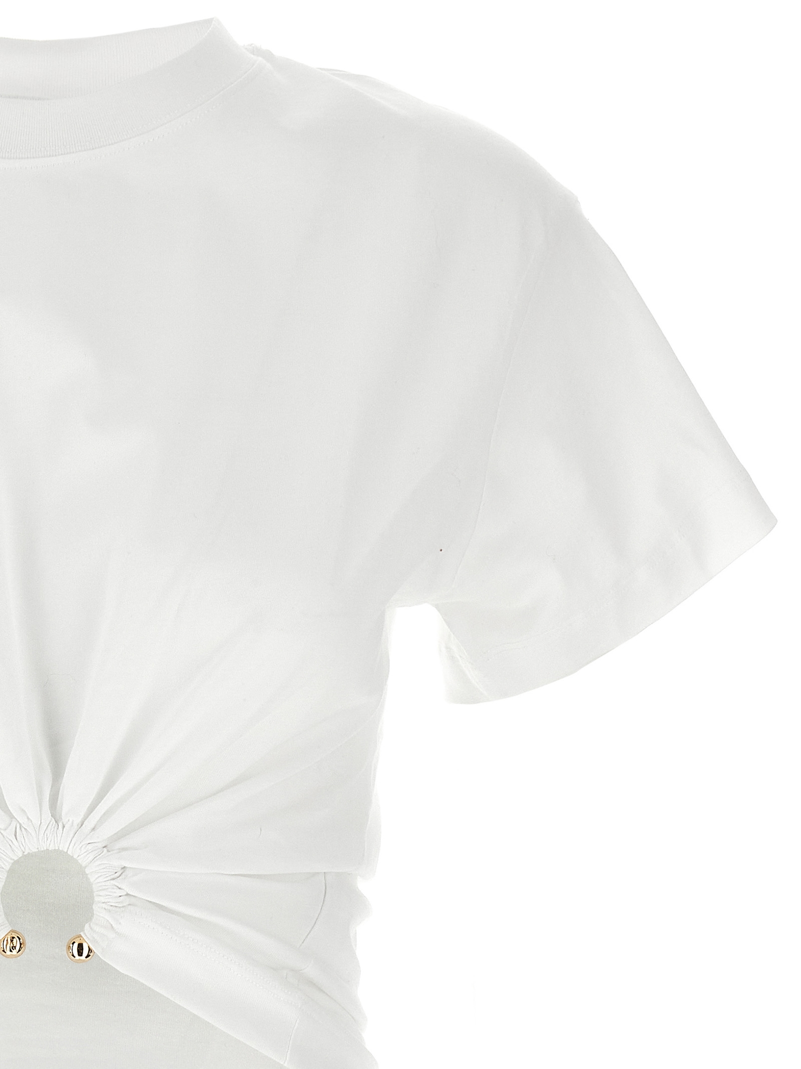 Cotton t-shirt with front metal piercing that creates draping, crop model, crew neck, short sleeves.