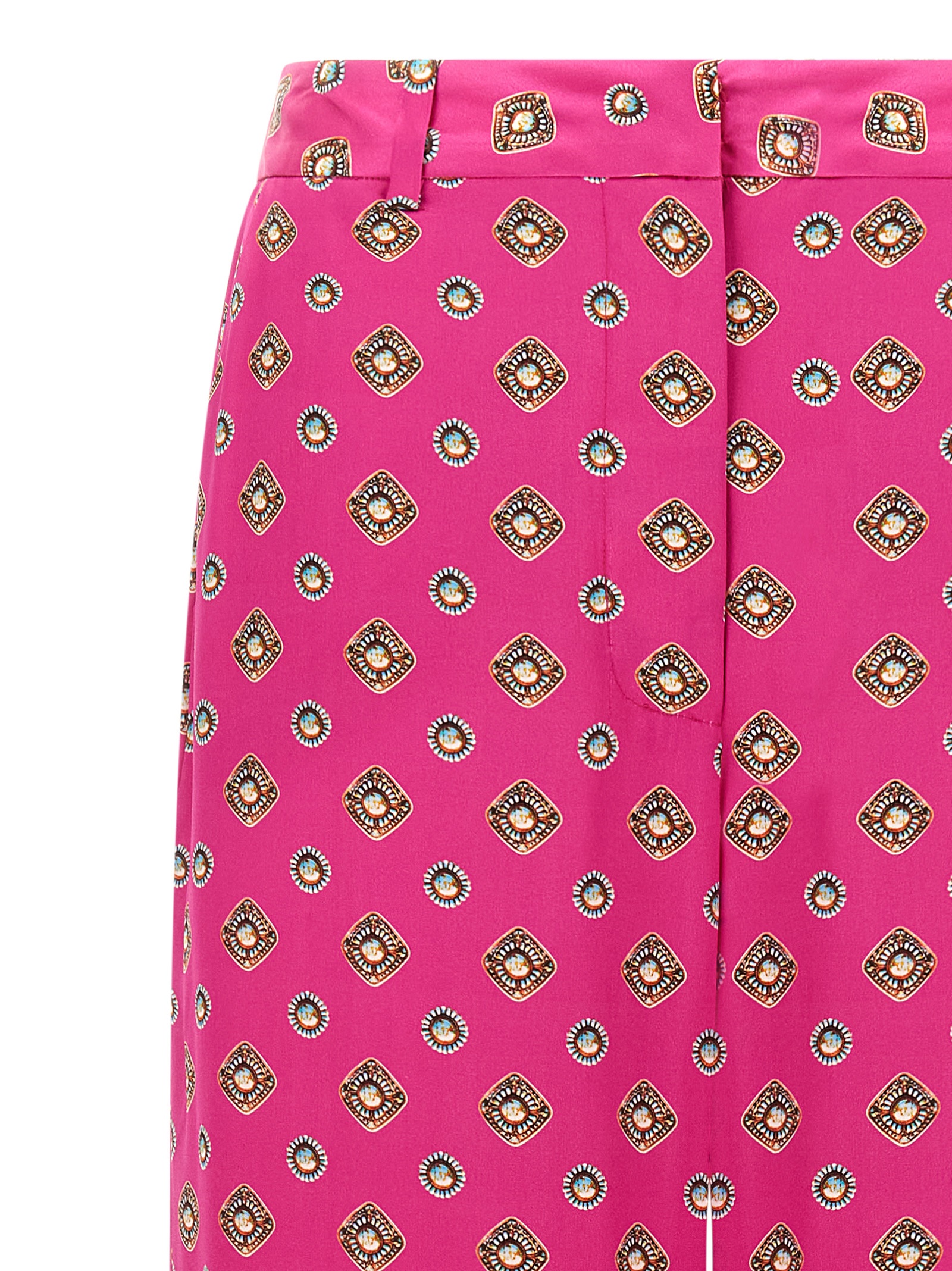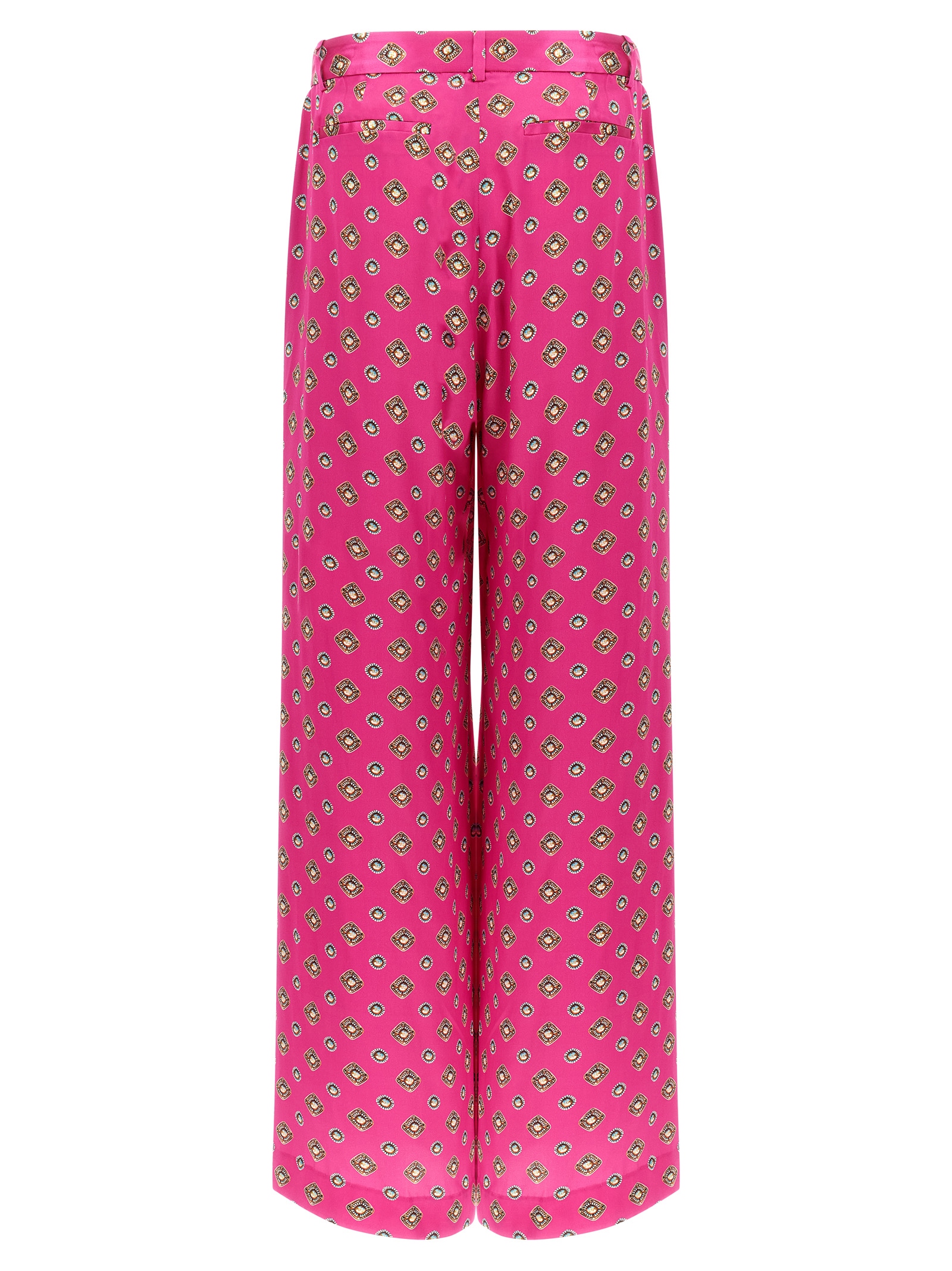 ‘Pilar’ silk pants charmeuse print of south-western inspiration, flared wide leg, high waist, hook and button zip closure, pockets.