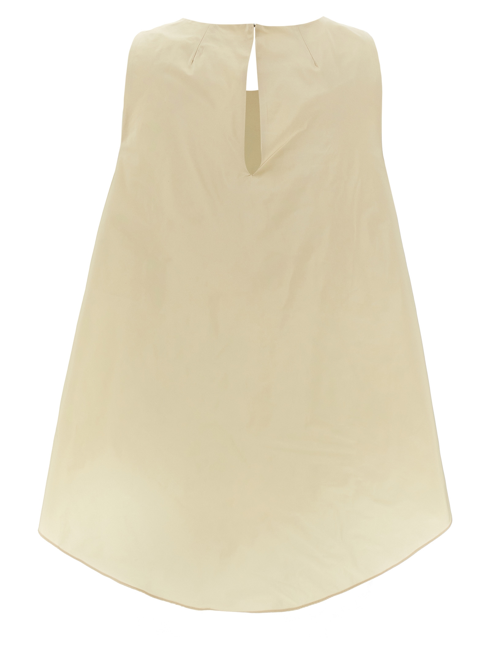 ‘Pimpy’ cady fabric top with front ruffles, asymmetrical hem, back button closure with teardrop cut-out detail.
