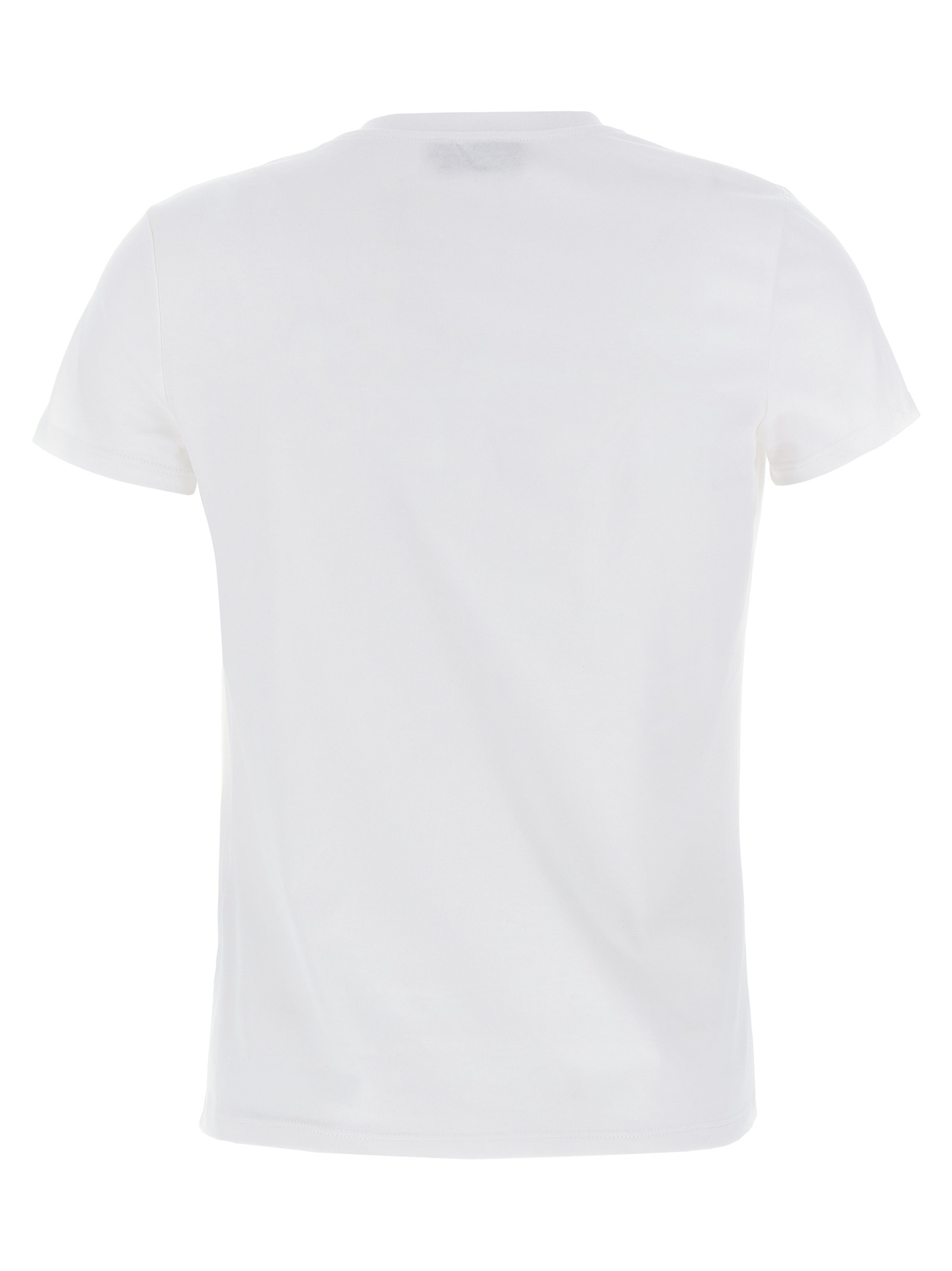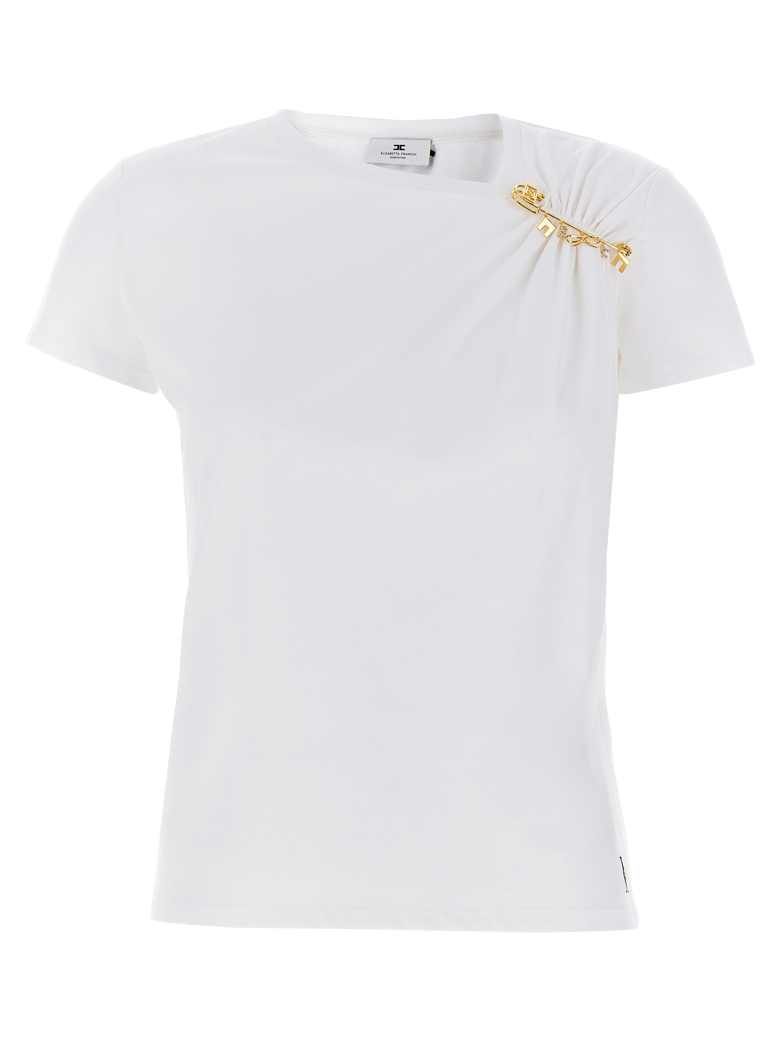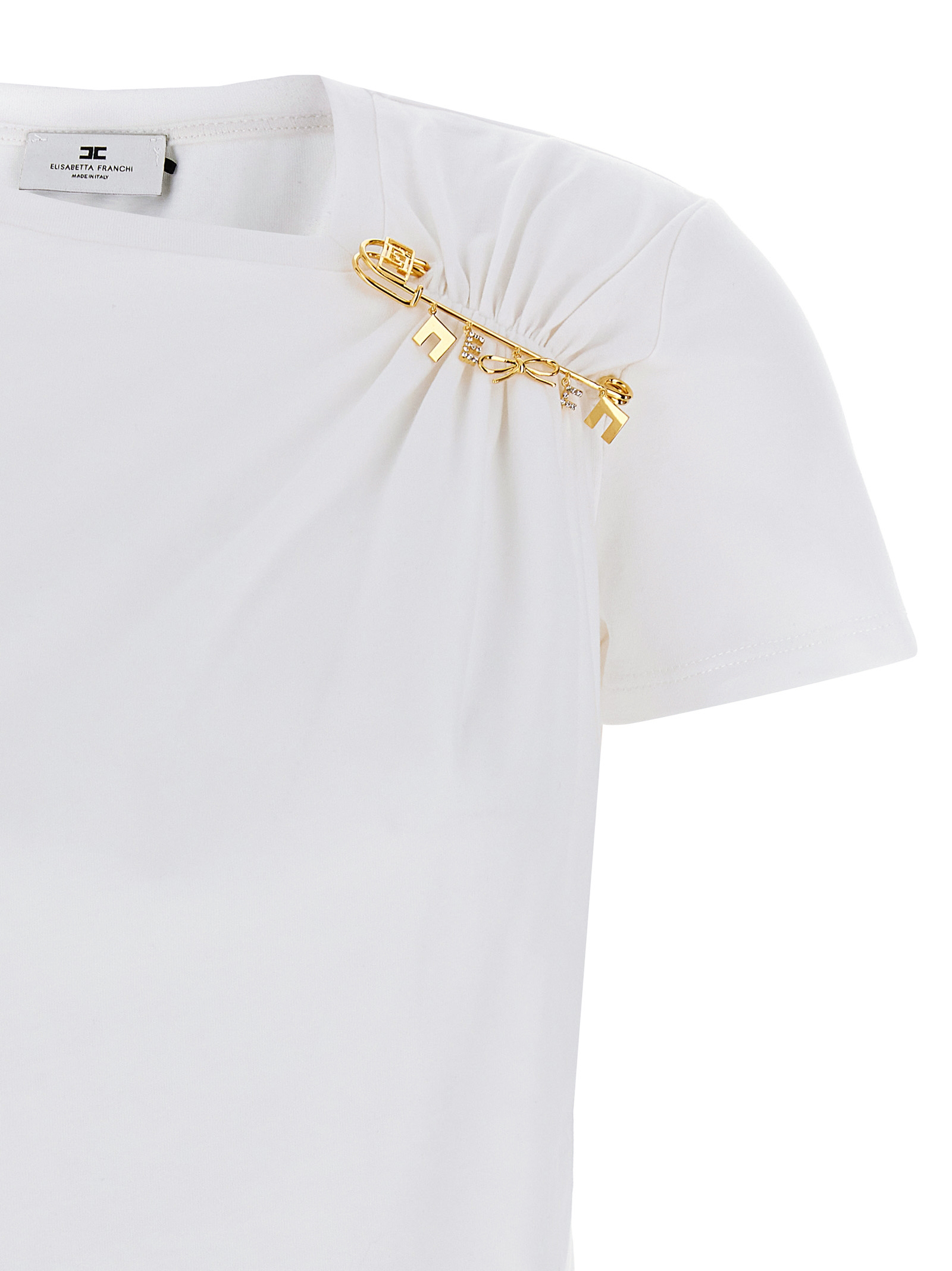 Stretch cotton jersey T-shirt, with asymmetric neckline with gold metal brooch with charms, front logo embroidery, and short sleeves.