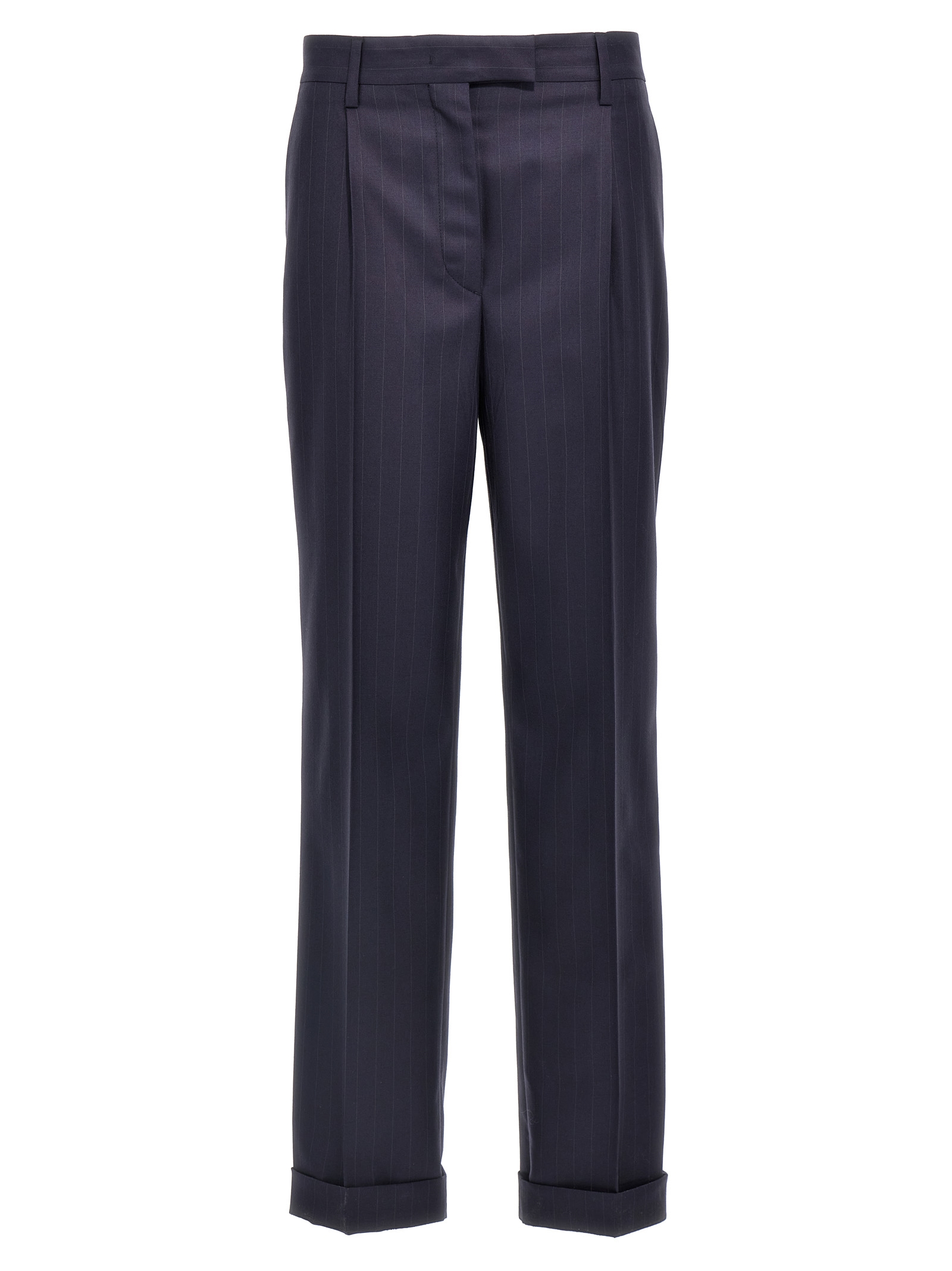 Pinstripe gabardine trousers, straight leg, stretched pleat, pockets, zip hook and front button closure, turn-up hem.