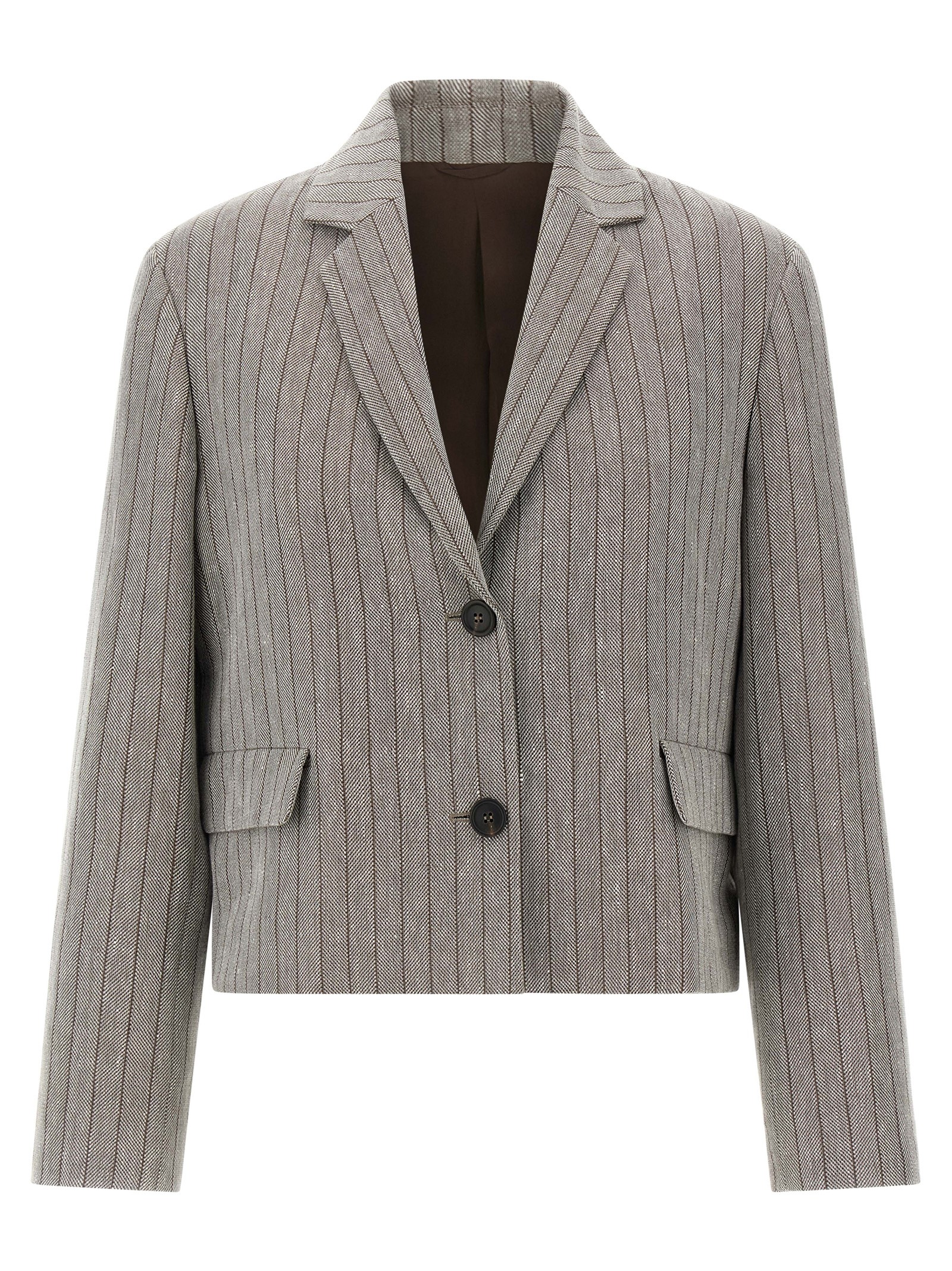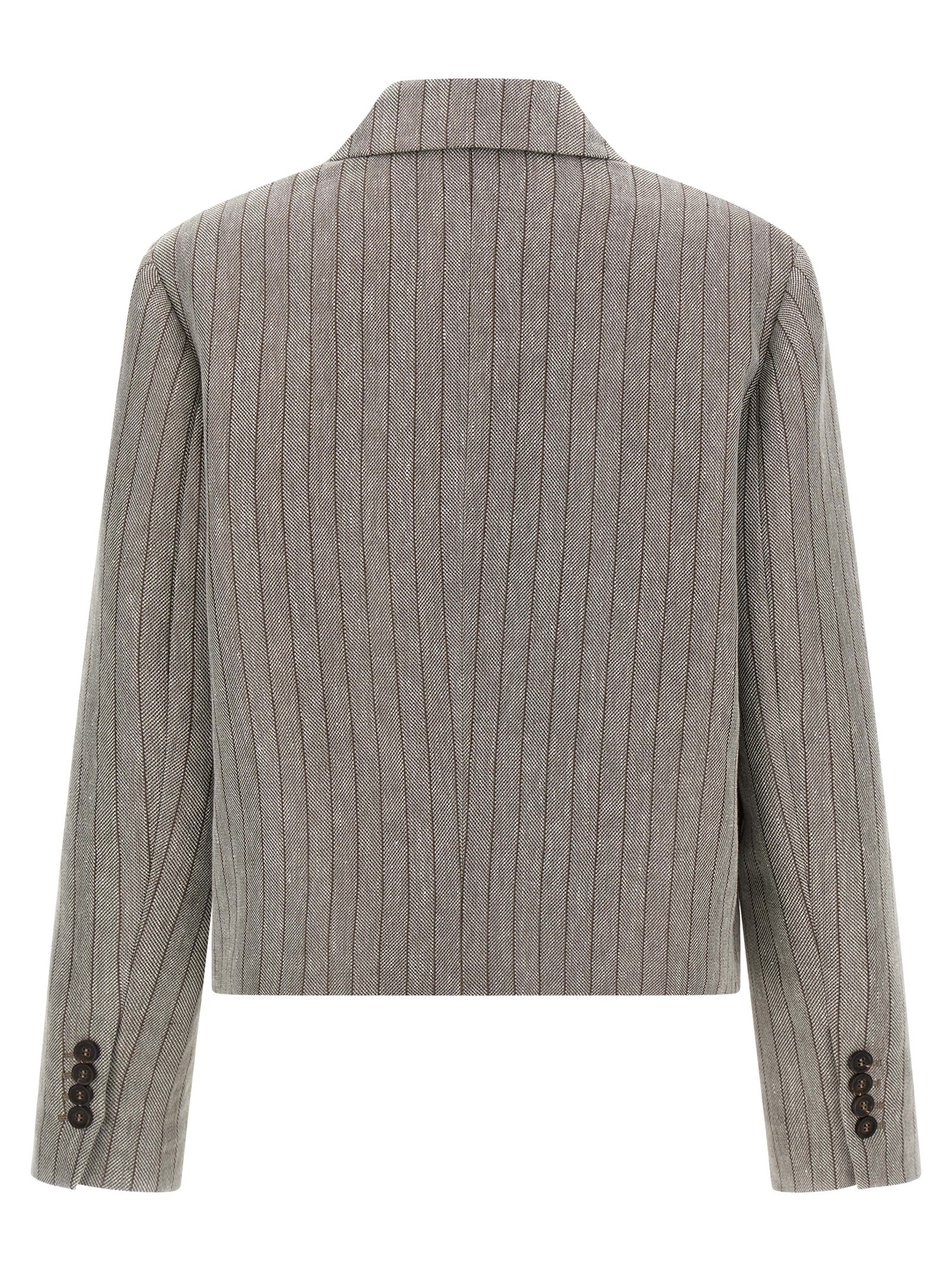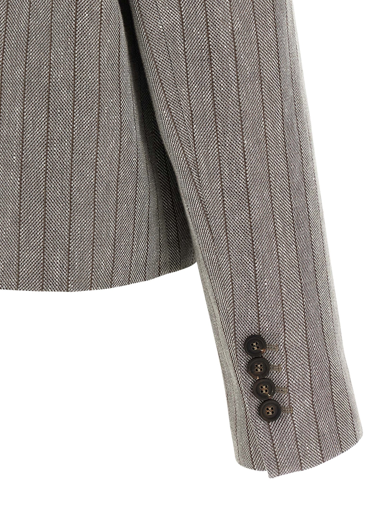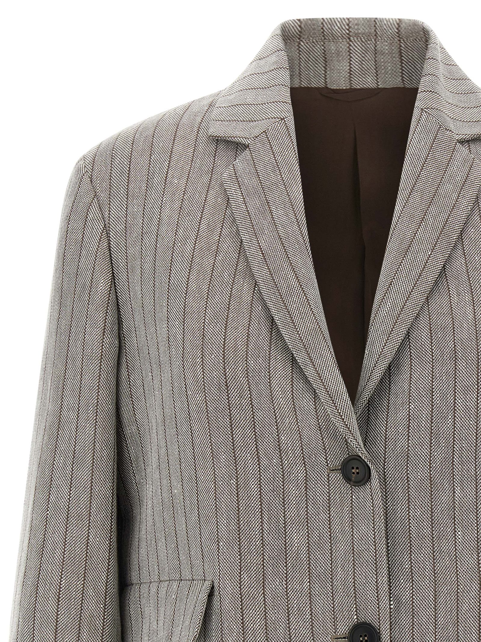 Single-breasted blazer in techno pinstriped linen chevron with front horn button closure, mirror lapels, flap pockets, long sleeves, and silk crepe blend lining.
