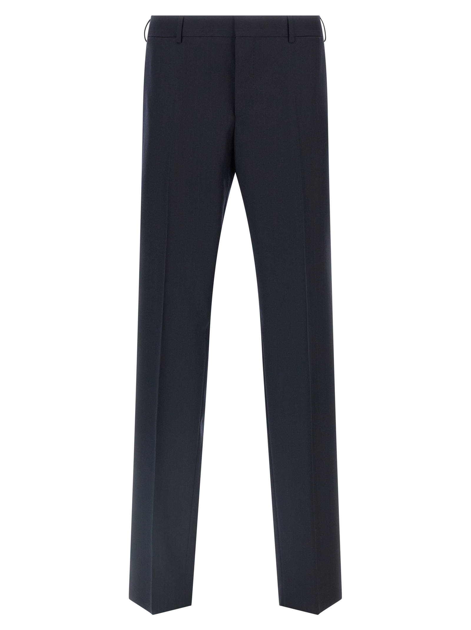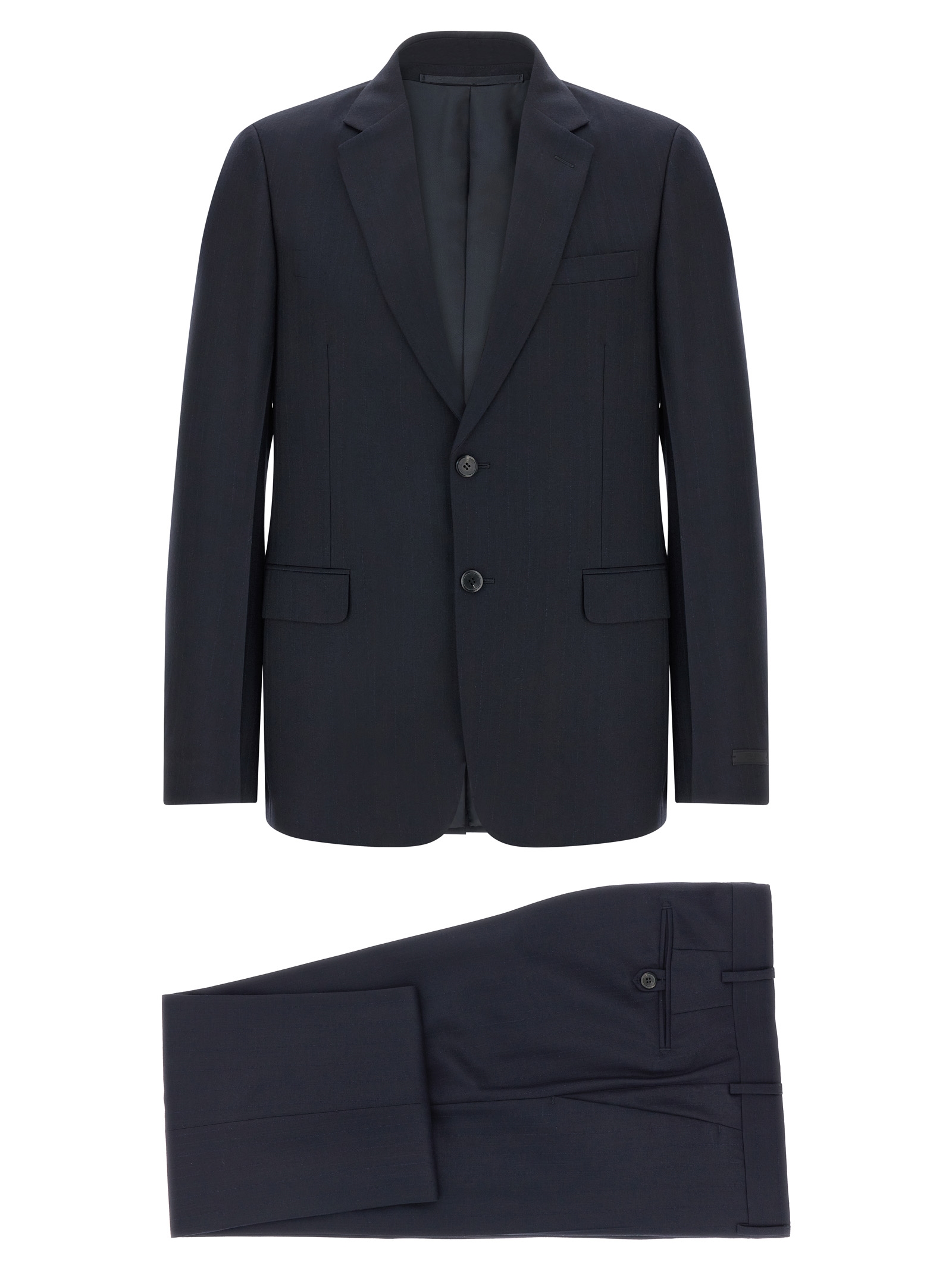 Dress in a fine blend of wool and cashmere pinstriped pattern consisting of single-breasted blazer with front button closure, mirror lapels, breast pocket, flap pockets, viscose lining, three inner pockets, padded shoulder, cuffs with opening buttonholes, back slit and trousers with stretched pleat, front ‘americane’ pockets, back welt pockets, button closure and front hook, viscose lining.