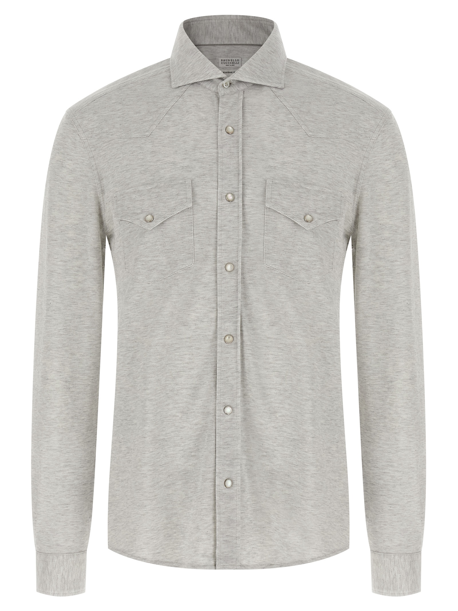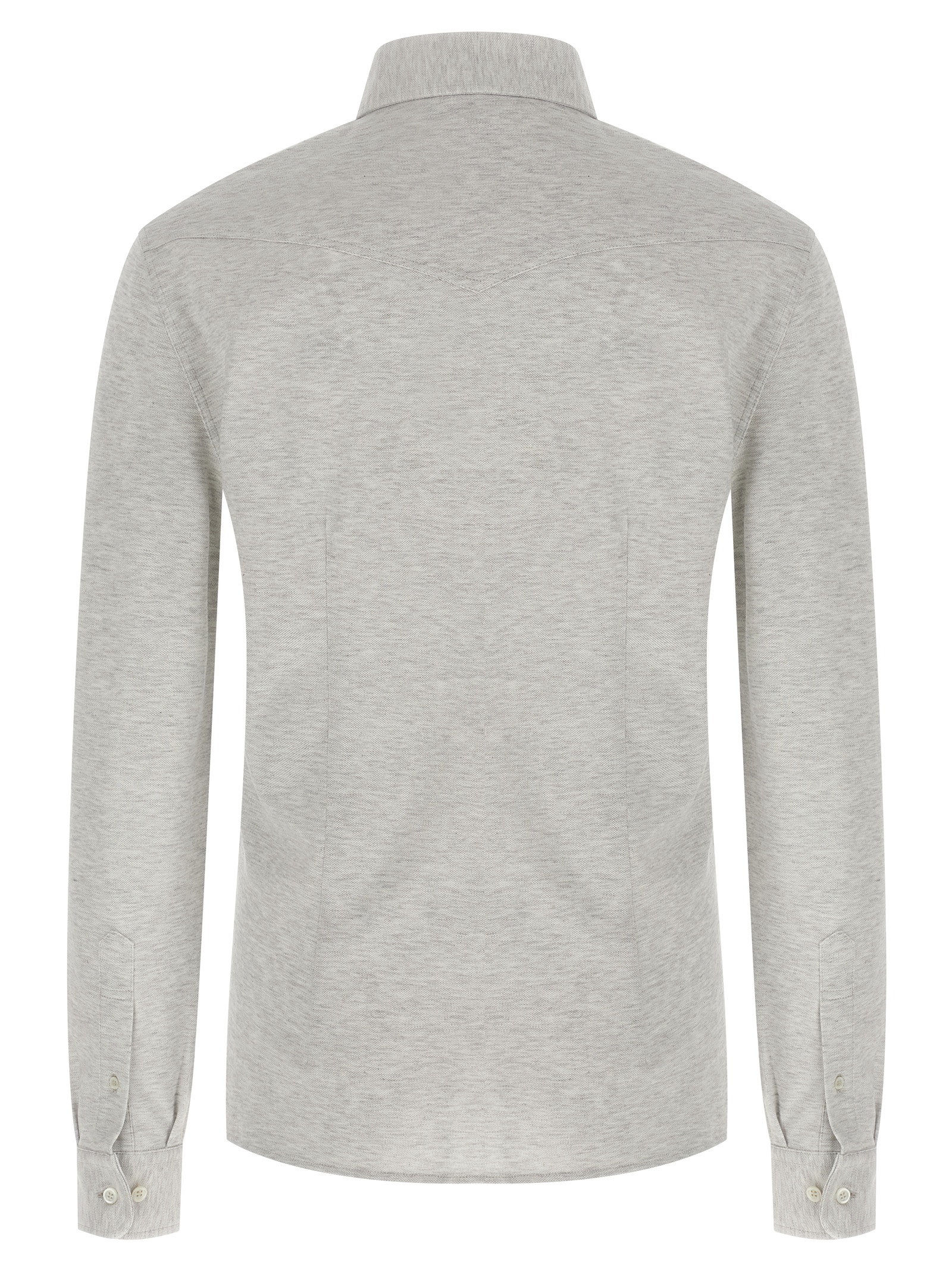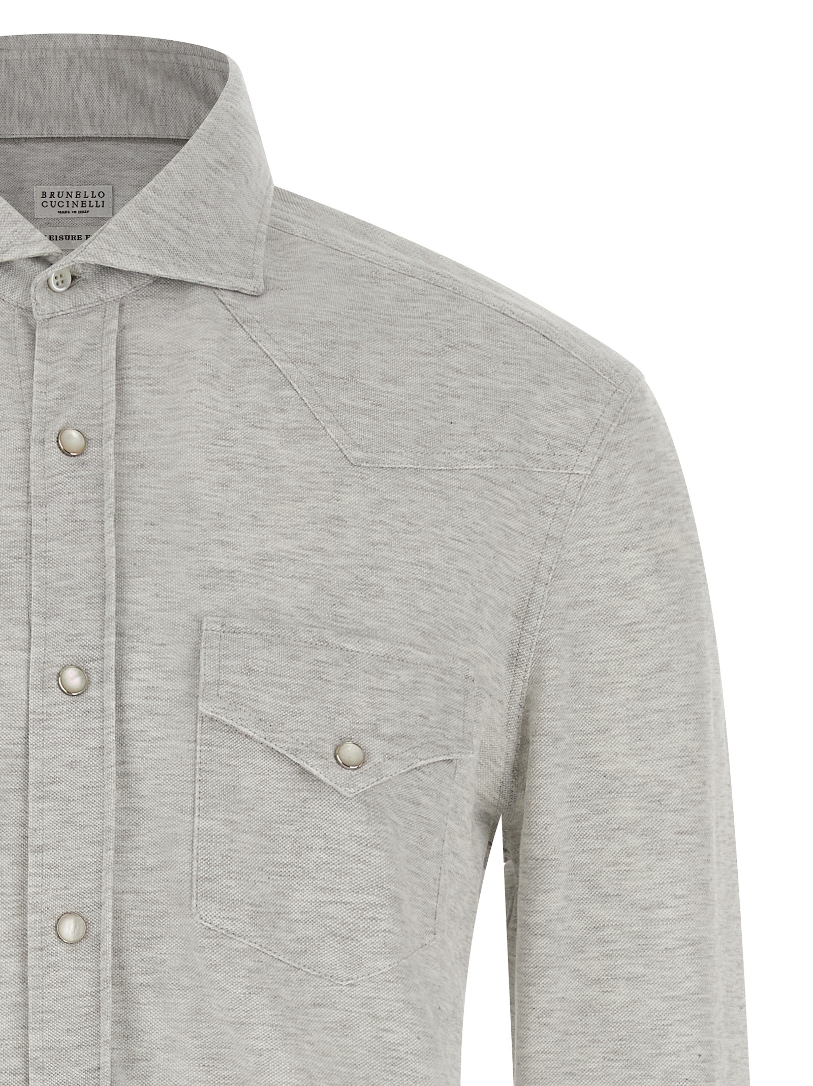 Cotton piqué shirt with front snap button closure, pockets, long cuffed sleeves.