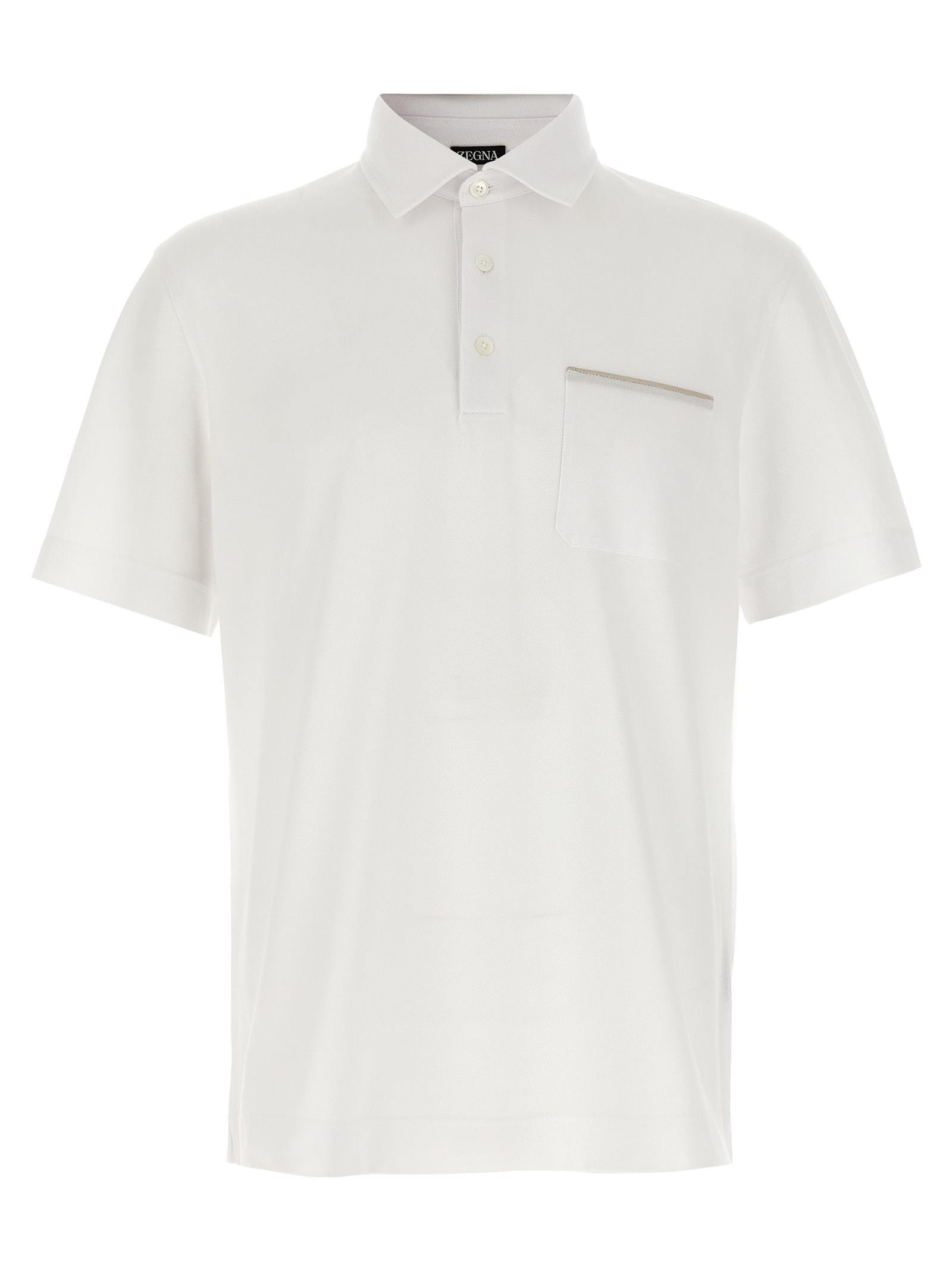 Piqué cotton polo shirt, satin piping pocket, collar and buttons, short sleeves, side slits.