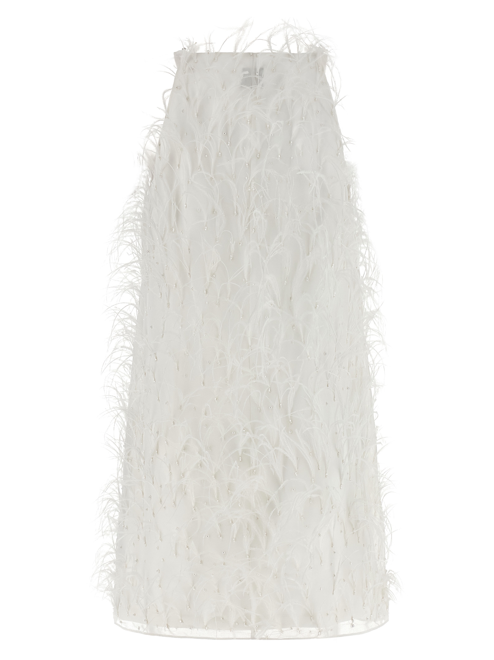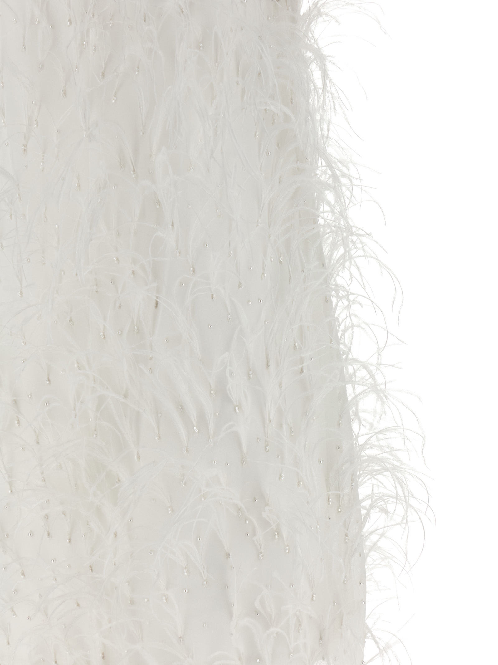 ‘Piripicchio’ georgette mini dress with beads and tufts of all-over feathers, bag silhouette, sleeveless, square neckline, petticoat.