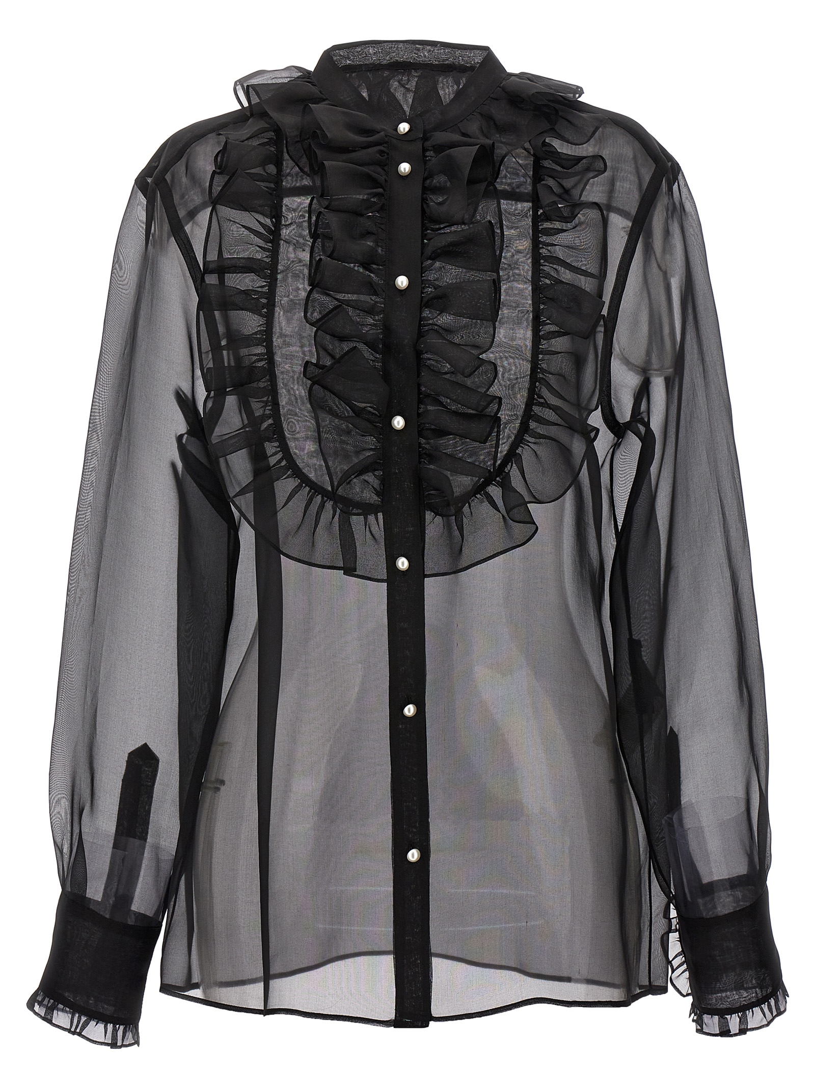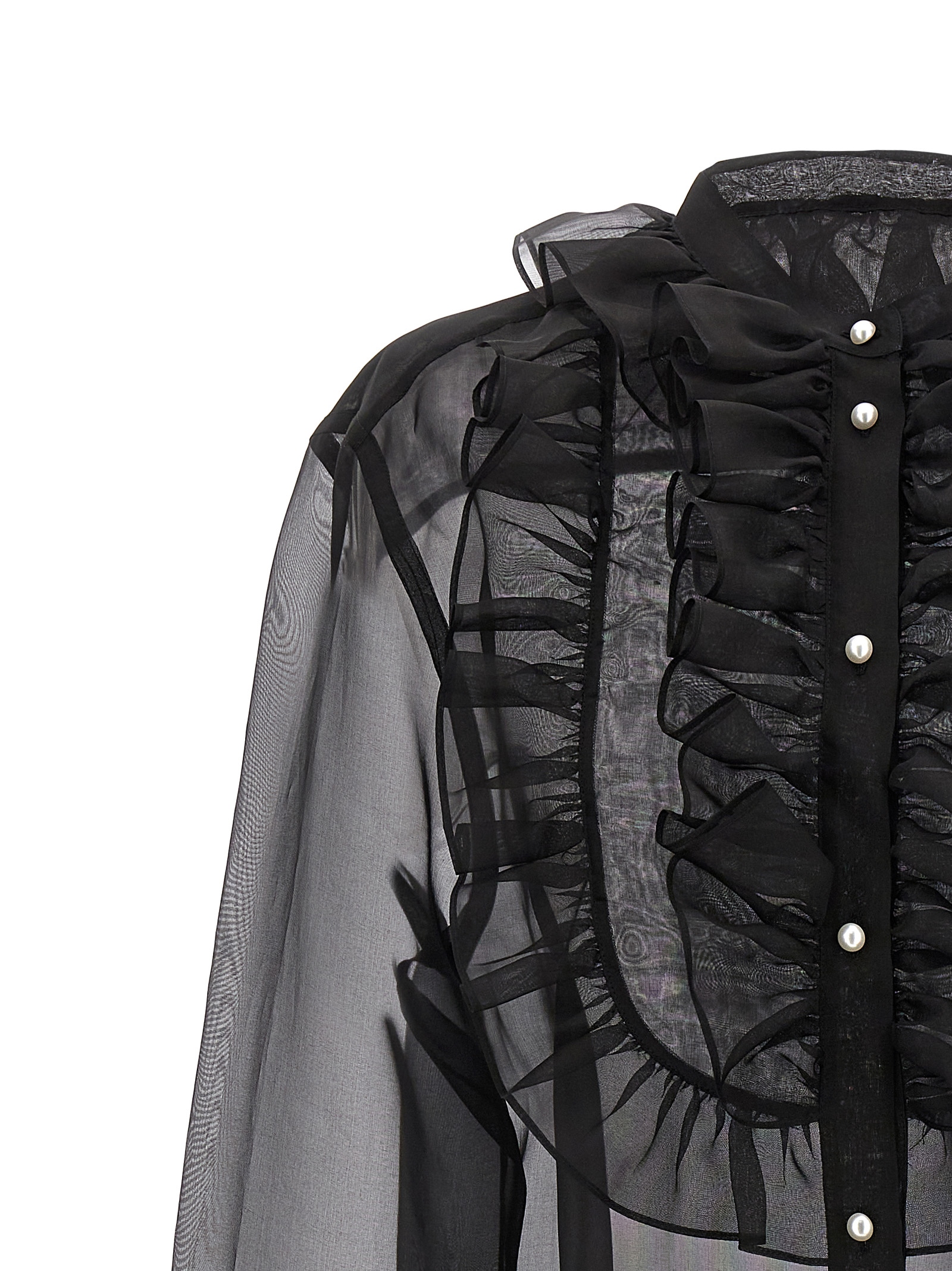 Silk organza shirt with plastron and ruffles, button closure, long sleeves.