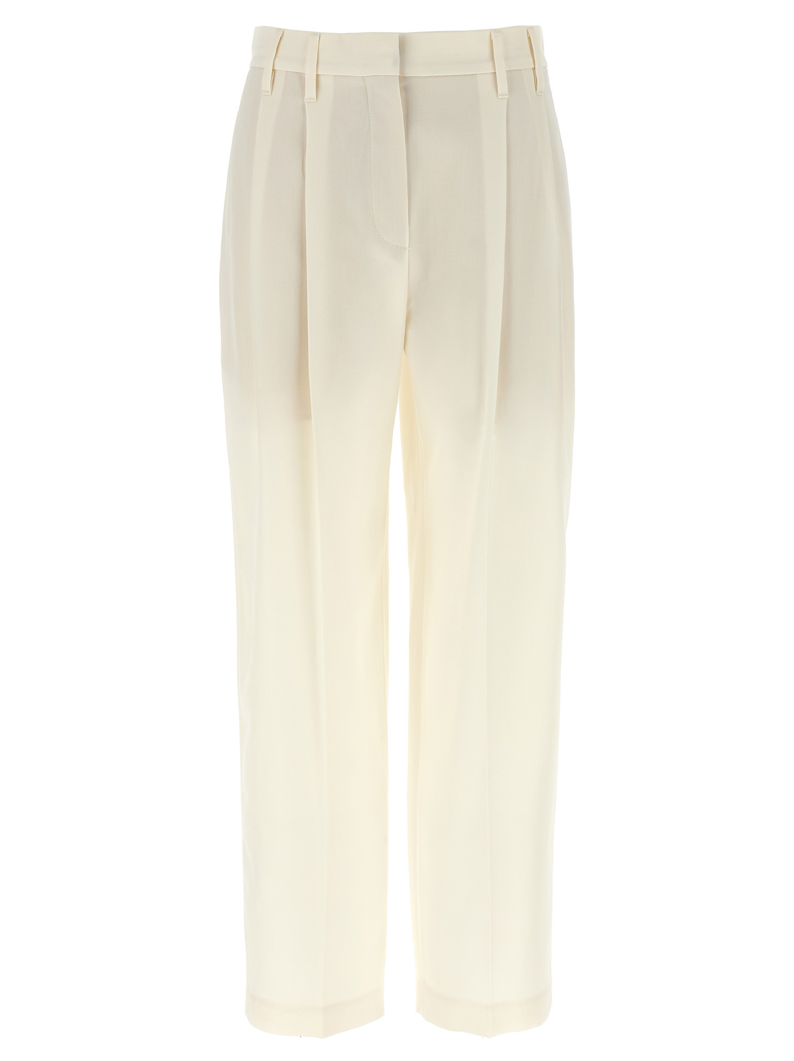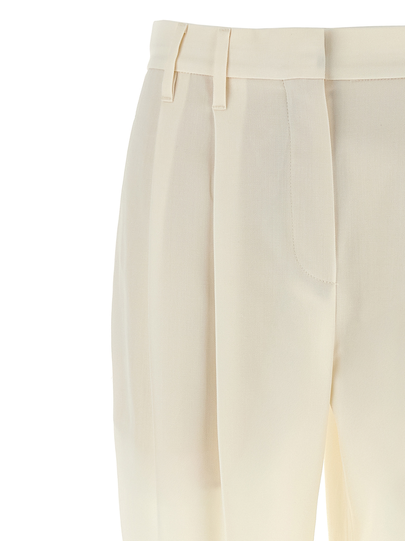 Wool and cotton blend pants, pins, zip, hook and front button closure, pockets, ironed pleat, back Monile detail.