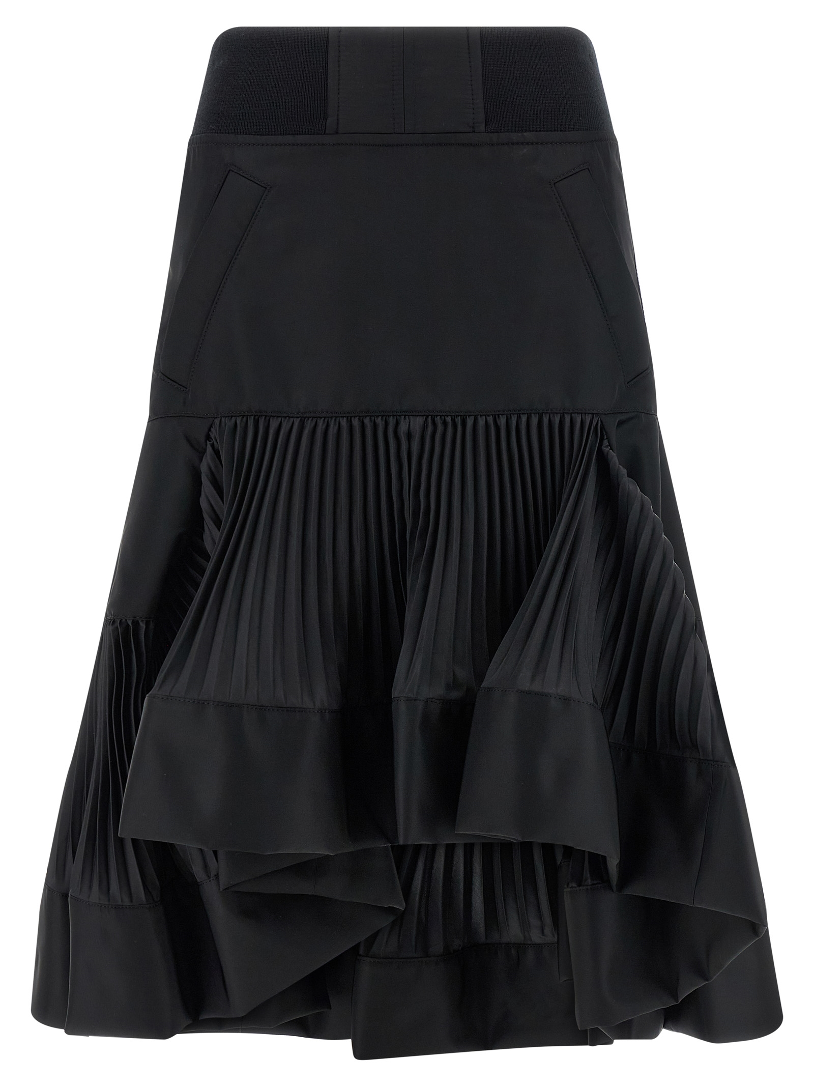 Nylon twill midi skirt, central tone-on-tone pleated insert, panel construction, A-line silhouette, ribbed stretch knit band at the waist, back zip closure, and asymmetrical hem.