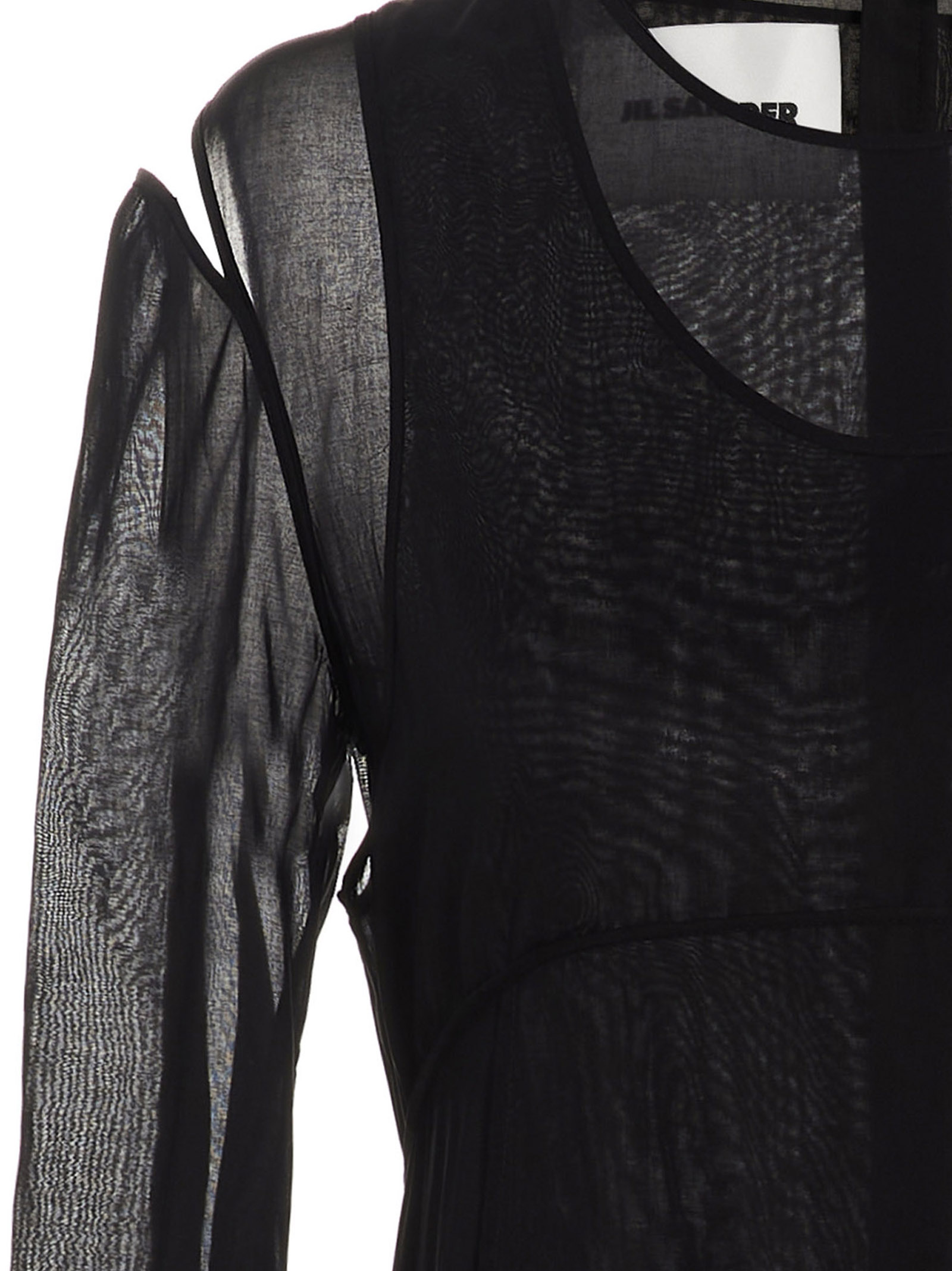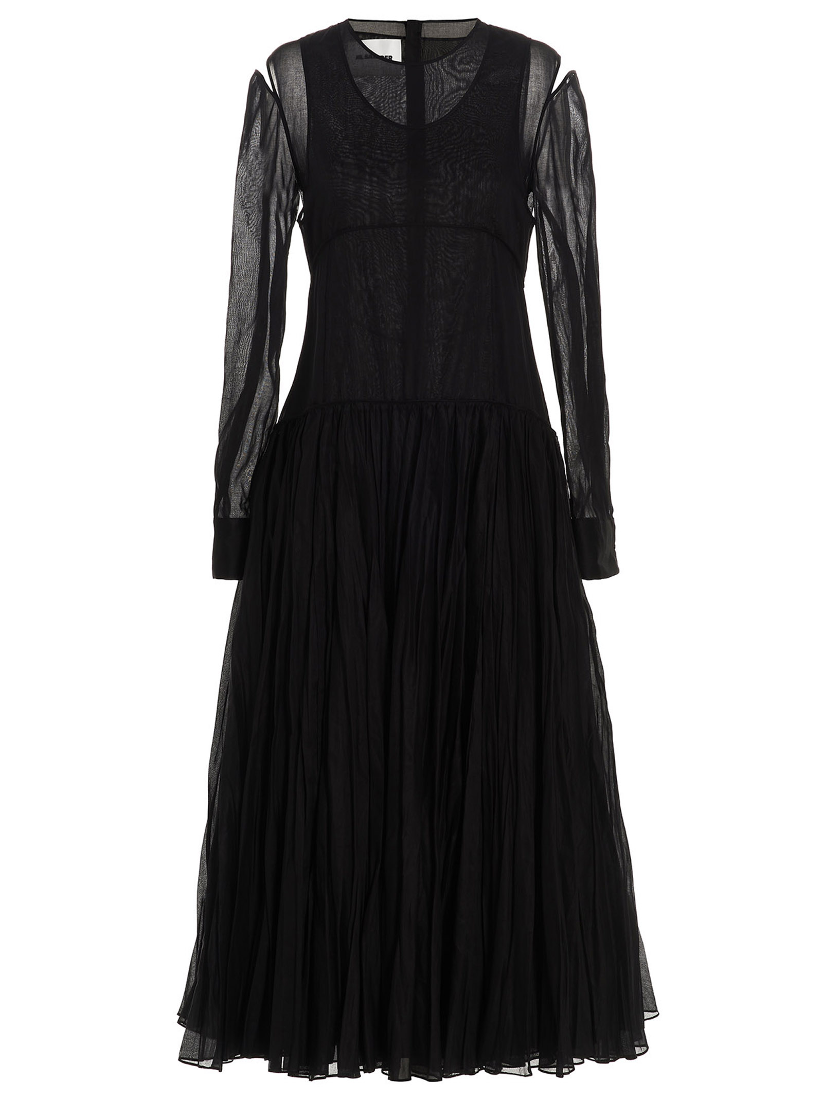 Cotton dress with loose pleated skirt, back zip closure, long cuffed sleeves, cut out detail on the shoulder and a crewneck.