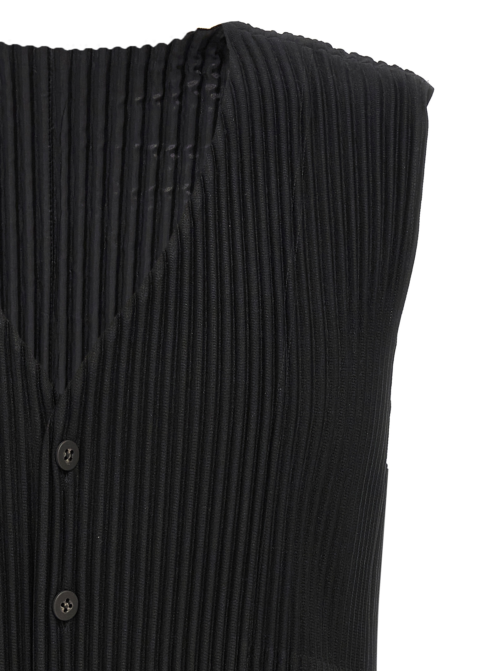 Pleated fabric vest with button closure.