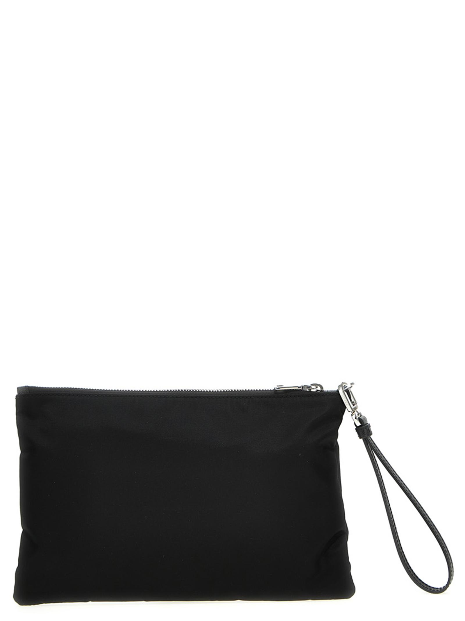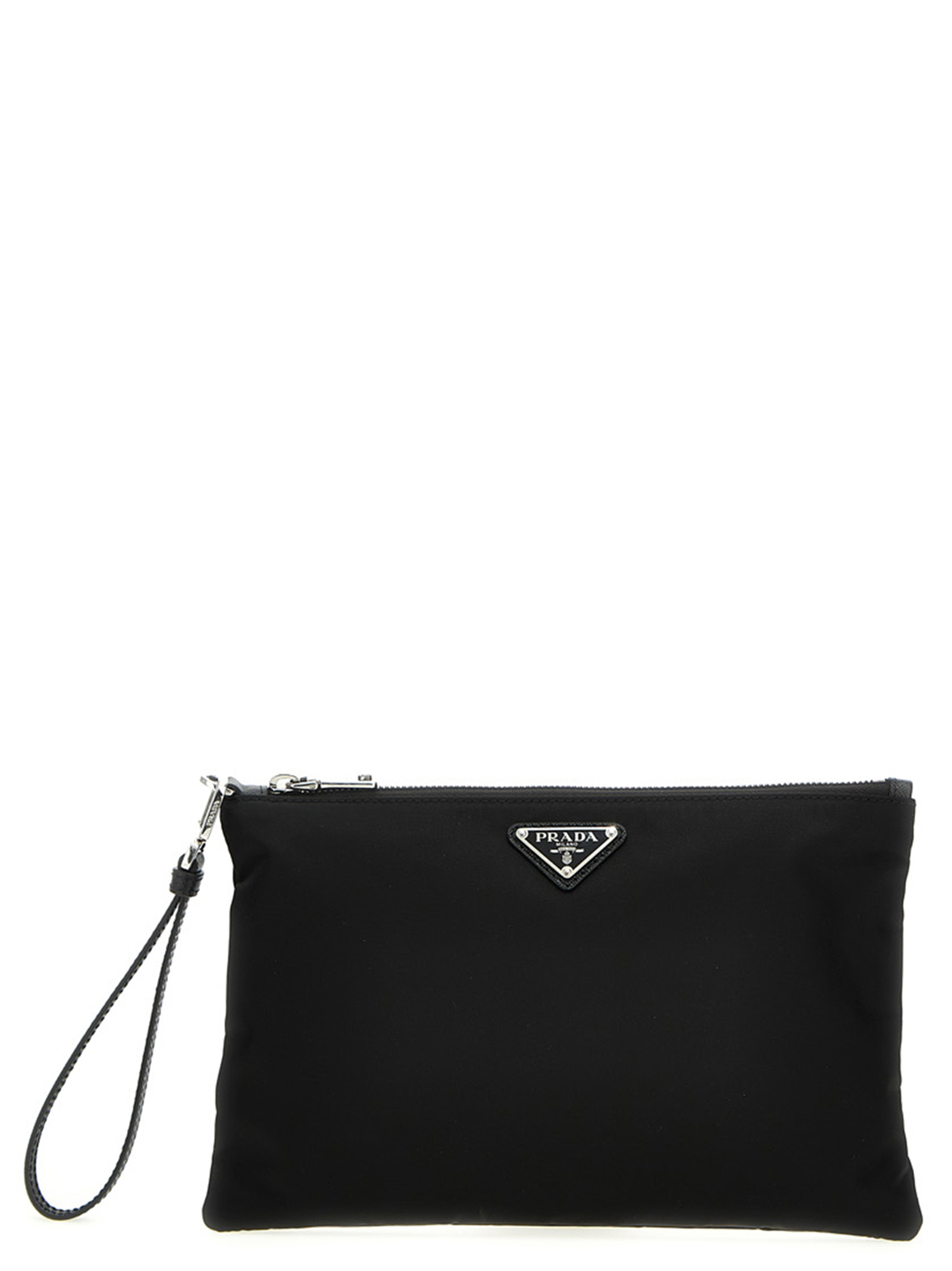 Pochette in Re-Nylon con applicazione logo triangolo in metallo smaltato frontale, manico da polso amovibile in pelle, chiusura zip. JULIAN SUSTAINABLE: Prodotto realizzato con Re-Nylon, un filato rigenerato realizzato dal riciclo e dalla purificazione delle materie plastiche raccolte in oceani, reti da pesca e fibre tessili.