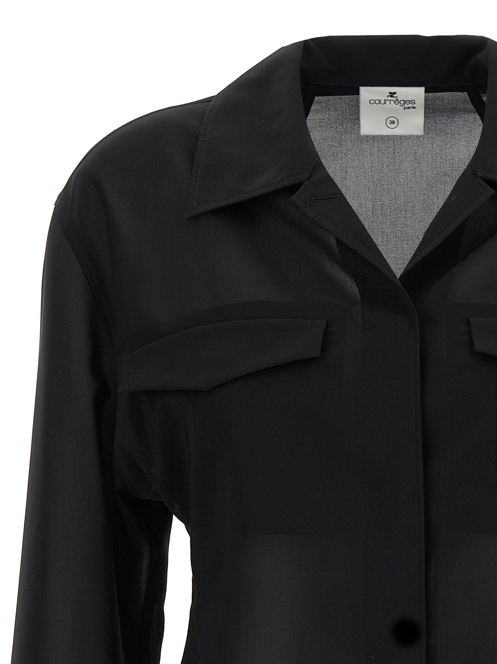Semi-transparent cotton blend shirt, front pockets, collar, side logo embroidery, long sleeves.