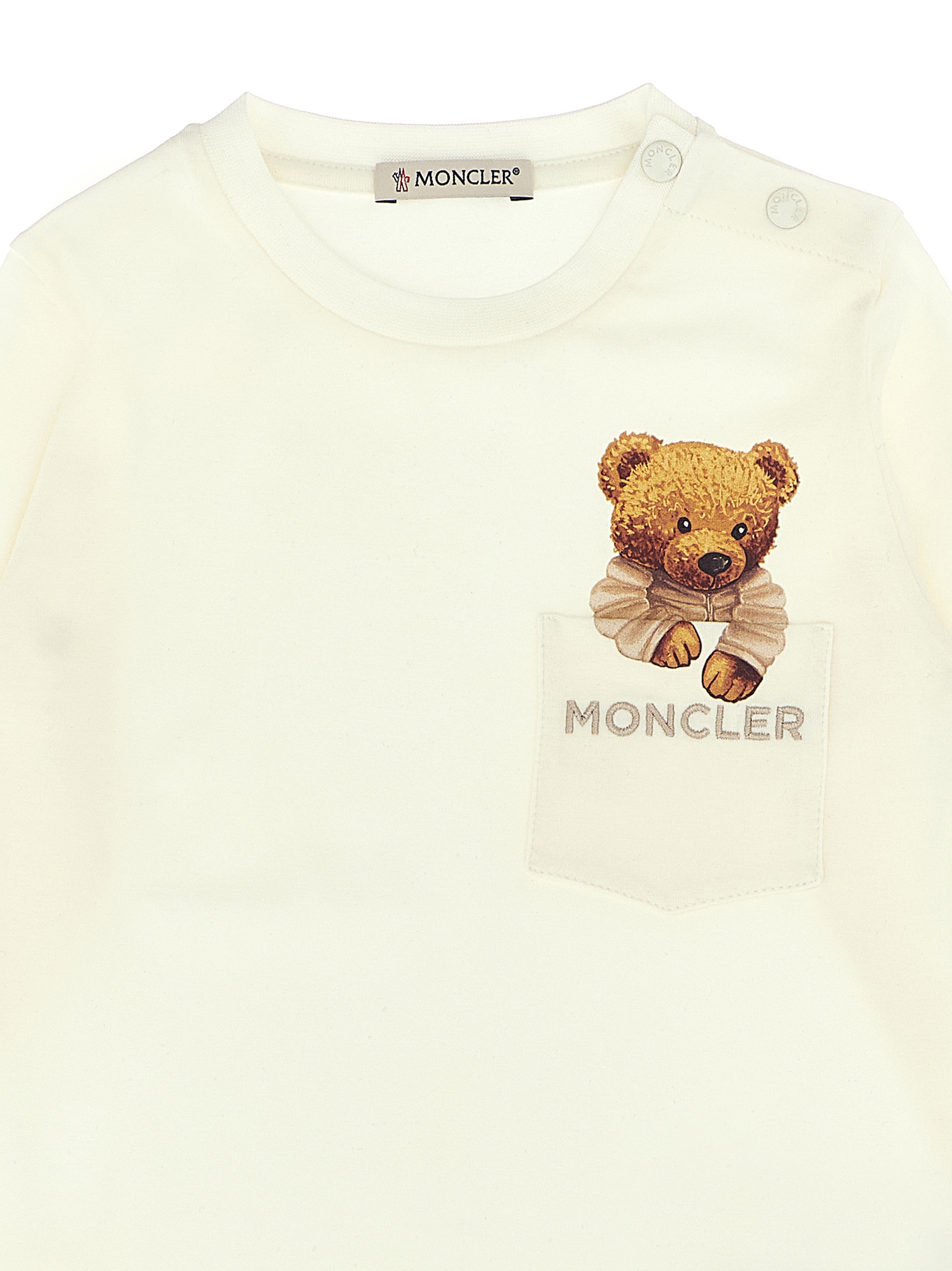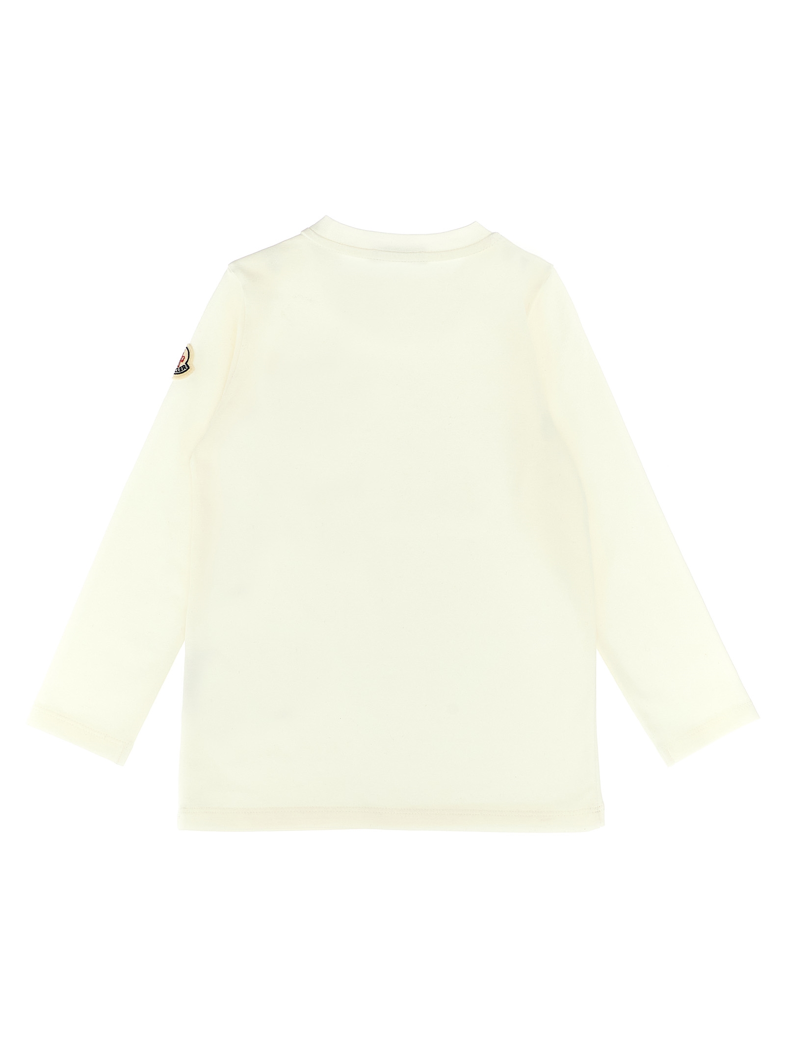 Stretch cotton jersey T-shirt, with pocket with print and logo embroidery, crew neck, snap button closure on the left shoulder, long sleeves with felt logo patch.