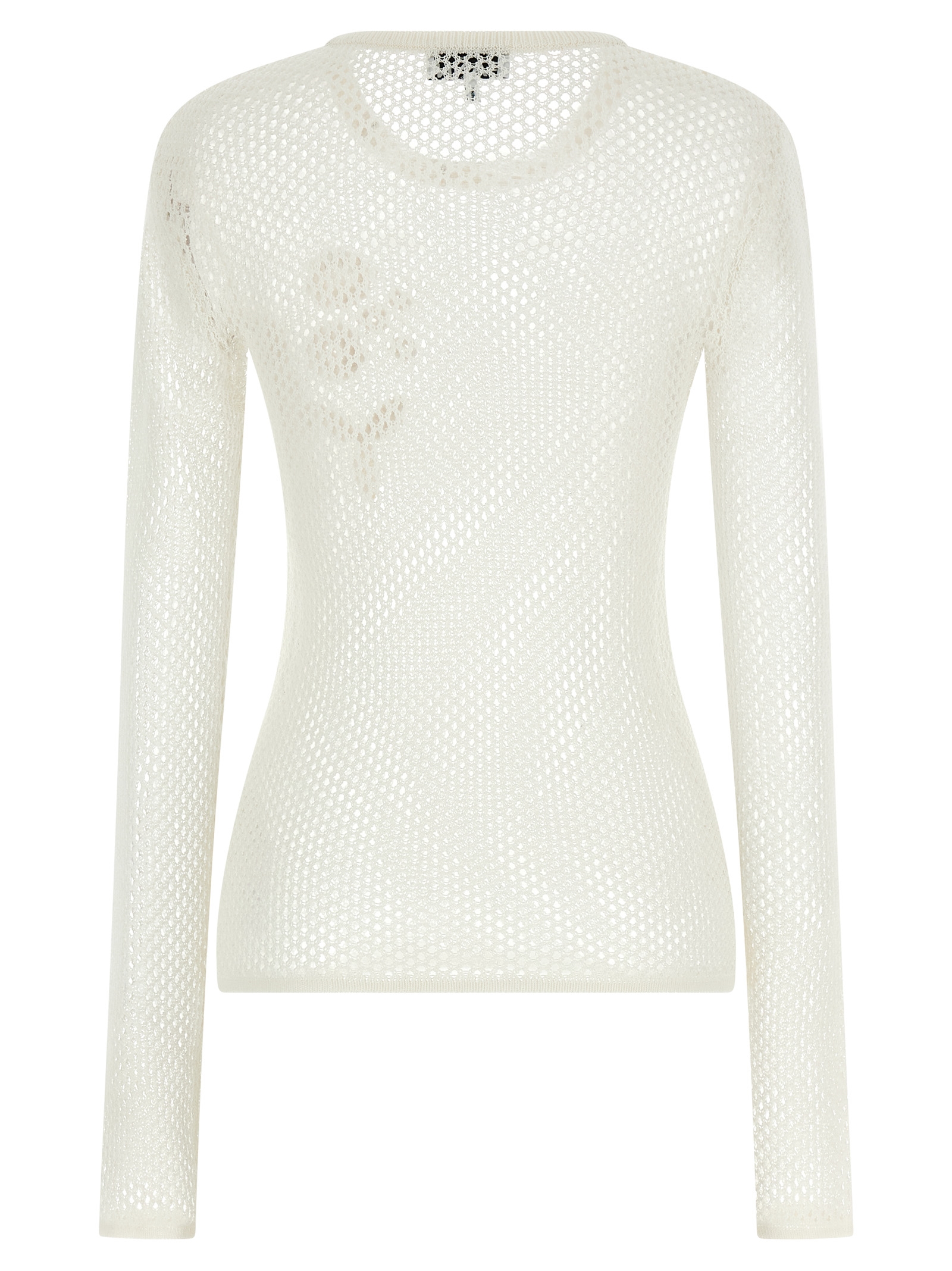 Cotton mesh pointelle sweater with front floral 3D applications, round neckline, long sleeves.