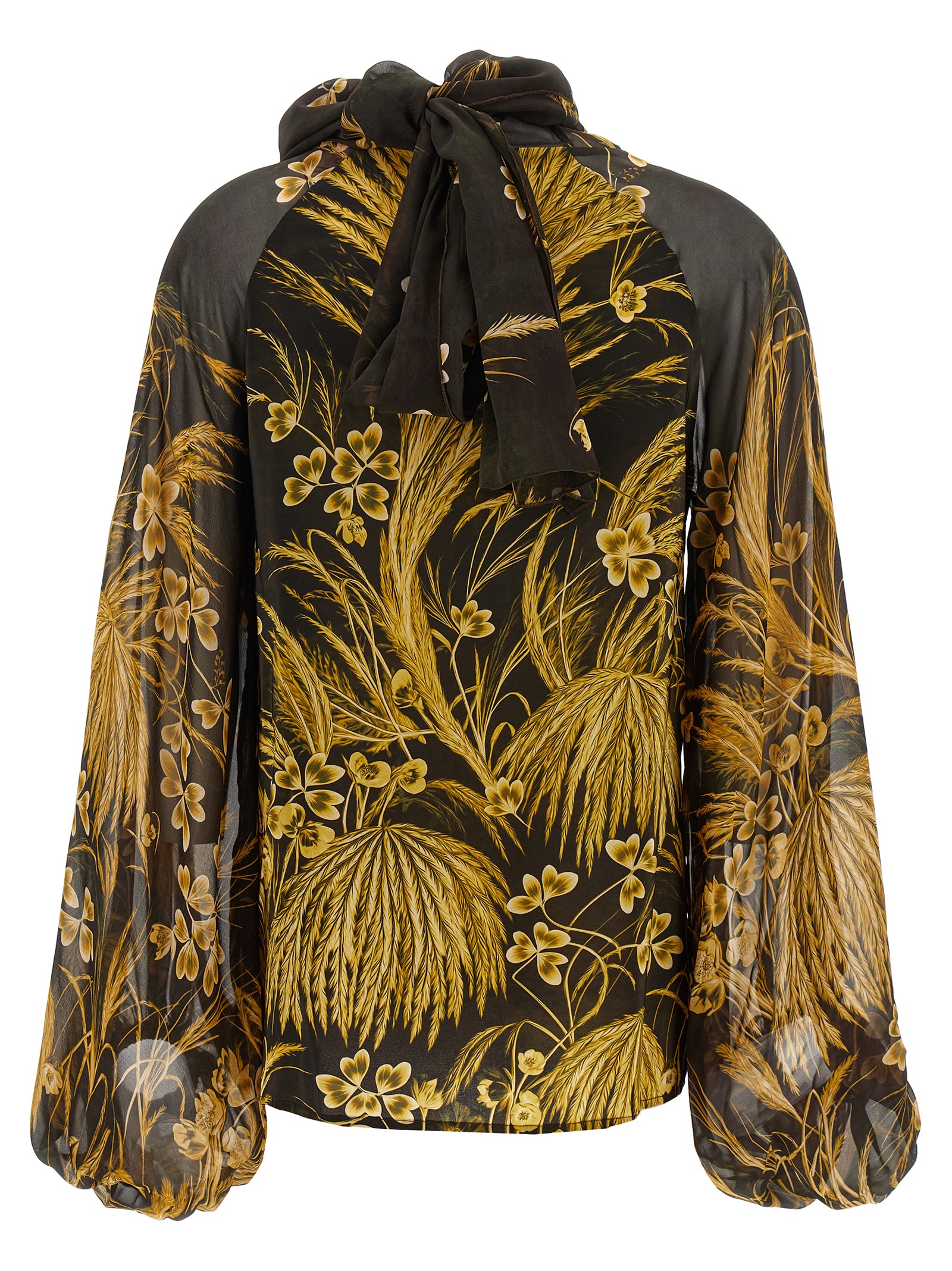 ‘Polimnia’ blouse in light silk blend and viscose with all-over floral print, sash tie around the neck, long and wide sleeves with elastic cuffs, back button closure with cut-out teardrop detail.