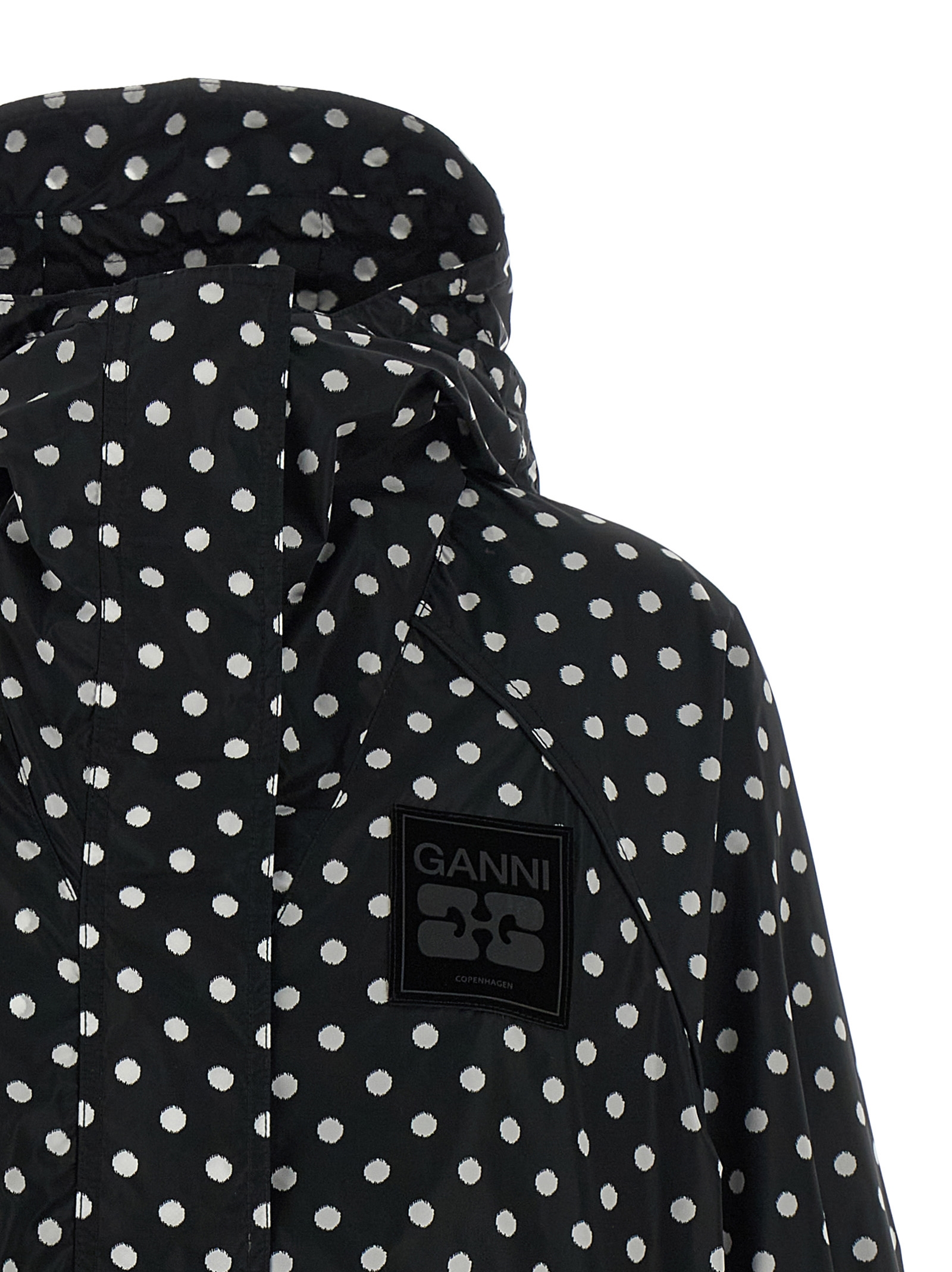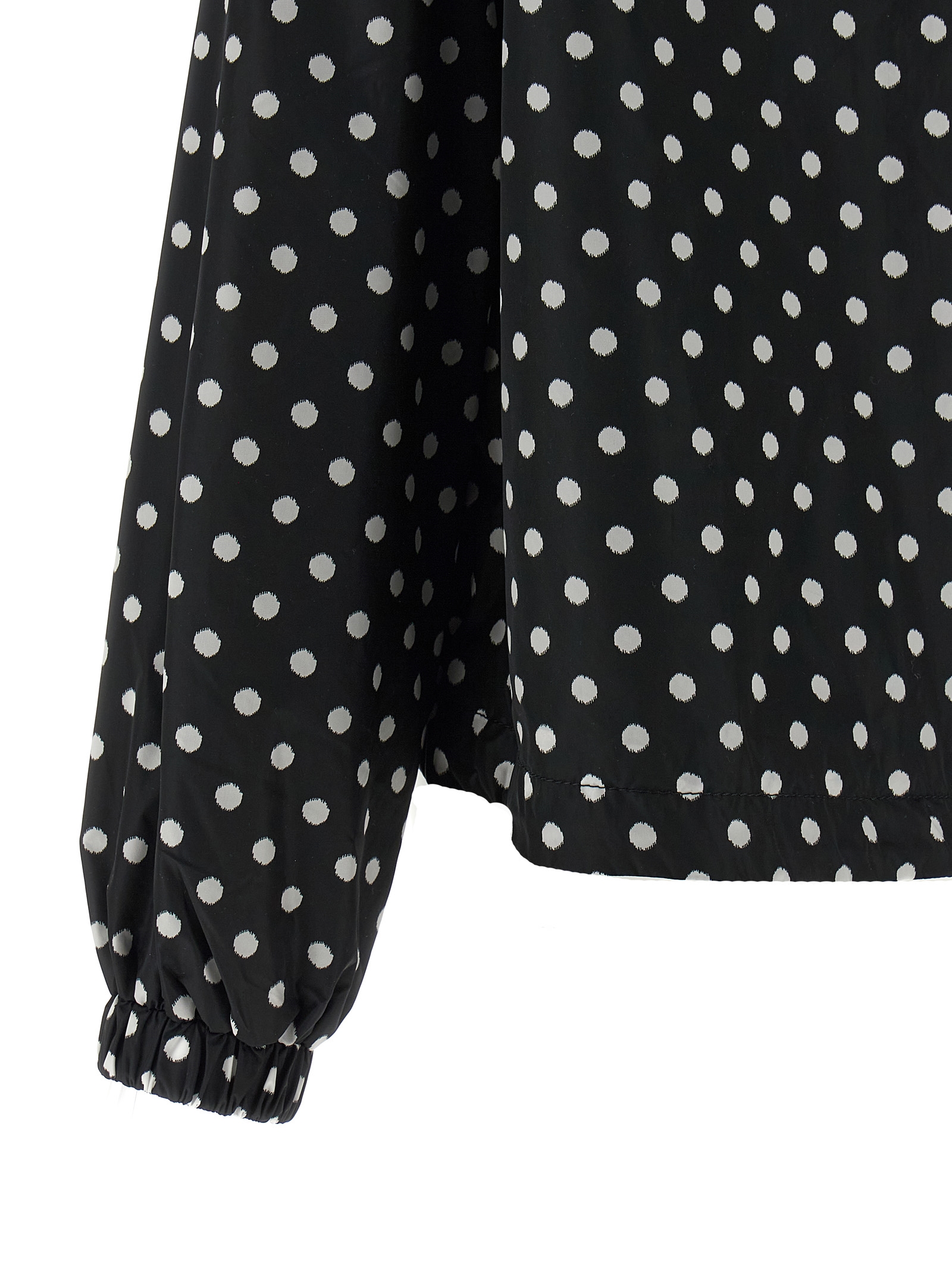 Nylon windbreaker jacket with all-over polka dot print, hood, silicone logo patch and zip closure and front snap buttons, pockets, long sleeves with elastic cuffs, drawstring on the hem, solid nylon lining.