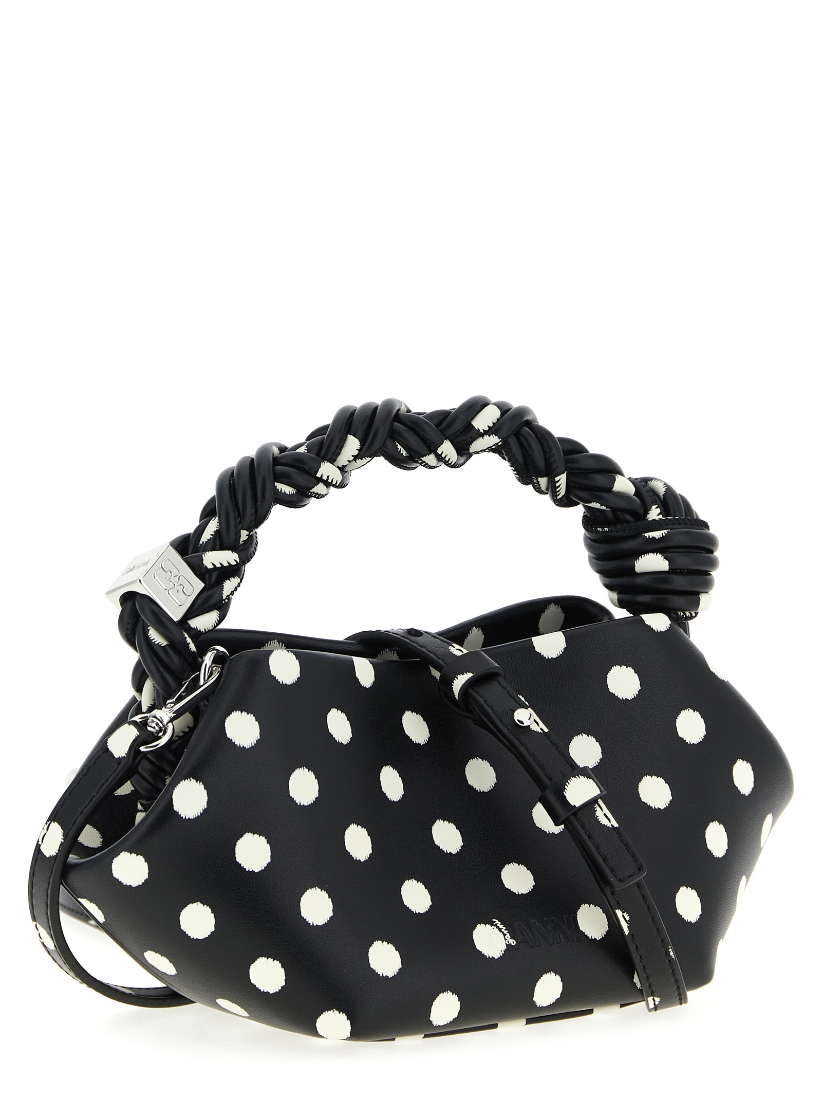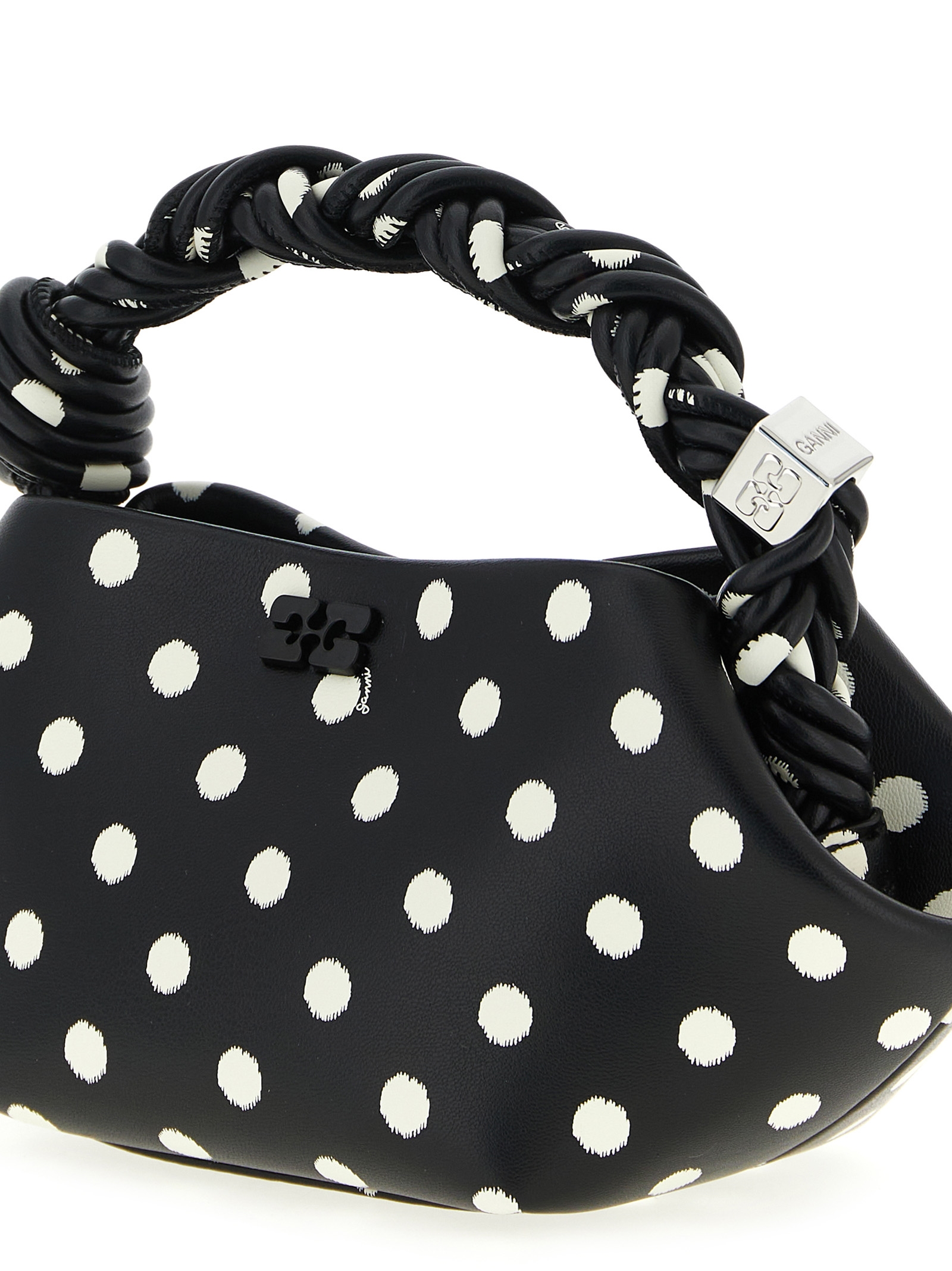 ‘Polka-Dot Bou’ mini handbag in leather-effect fabric with all-over polka dot print, fixed woven handle with metal detail engraved Ganni Butterfly logo, adjustable and removable shoulder strap.