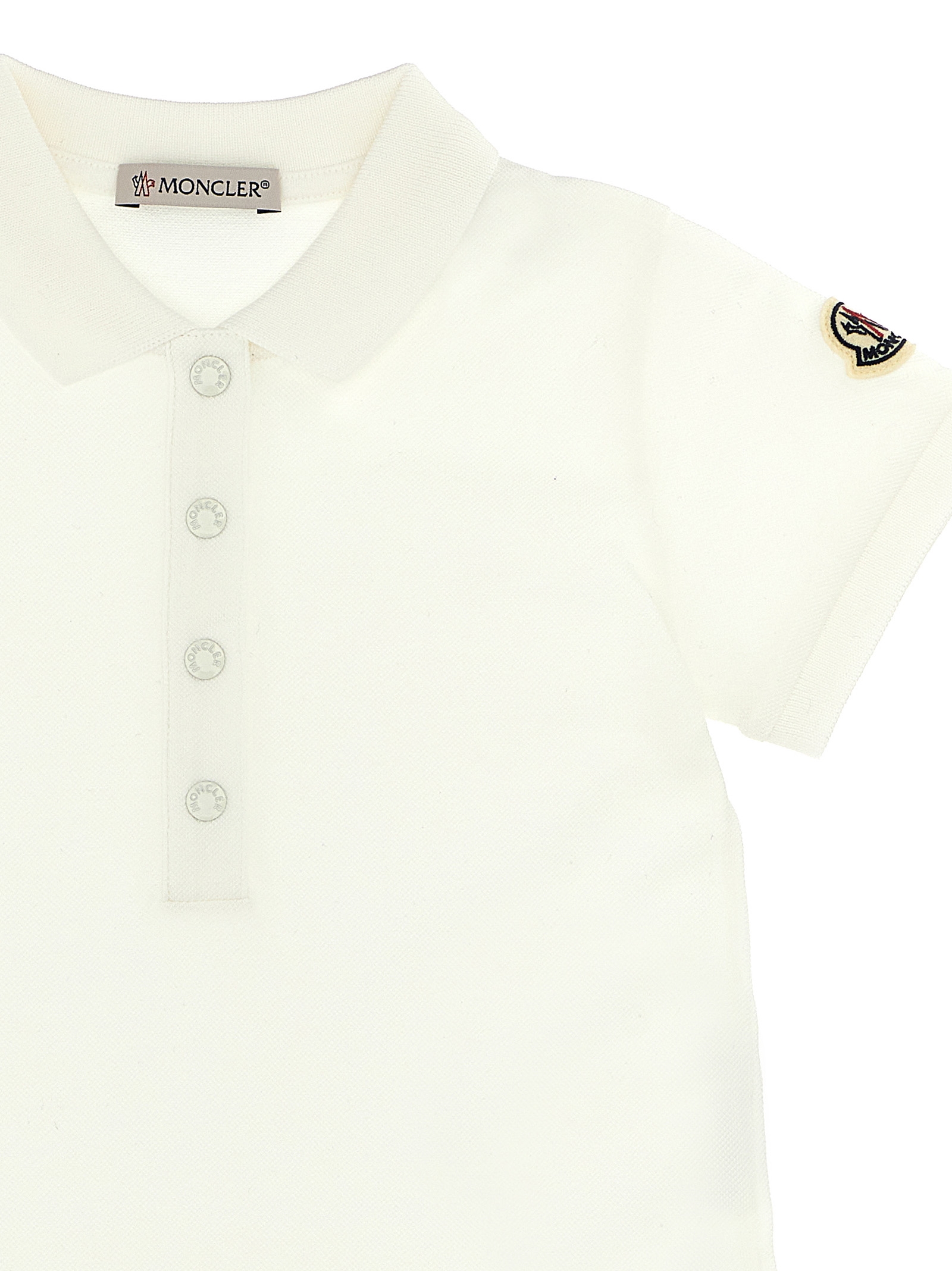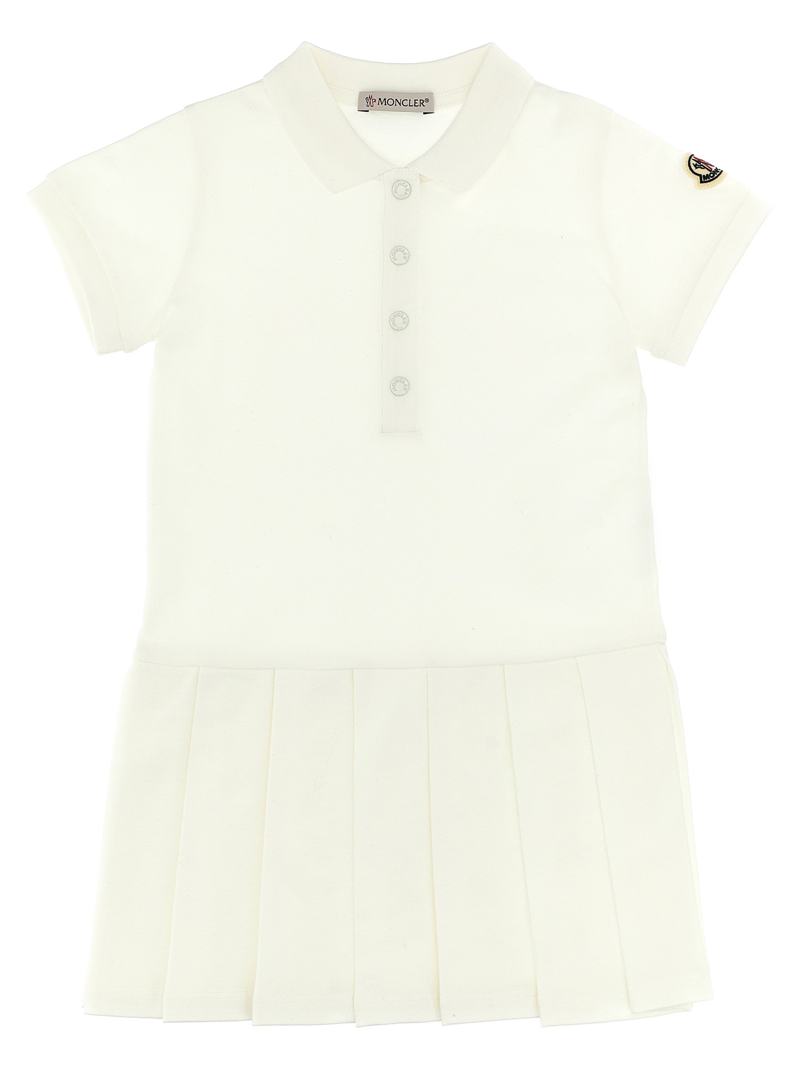 Piqué stretch cotton polo dress with collar and snap buttons, short sleeves with felt logo patch, pleated skirt.
