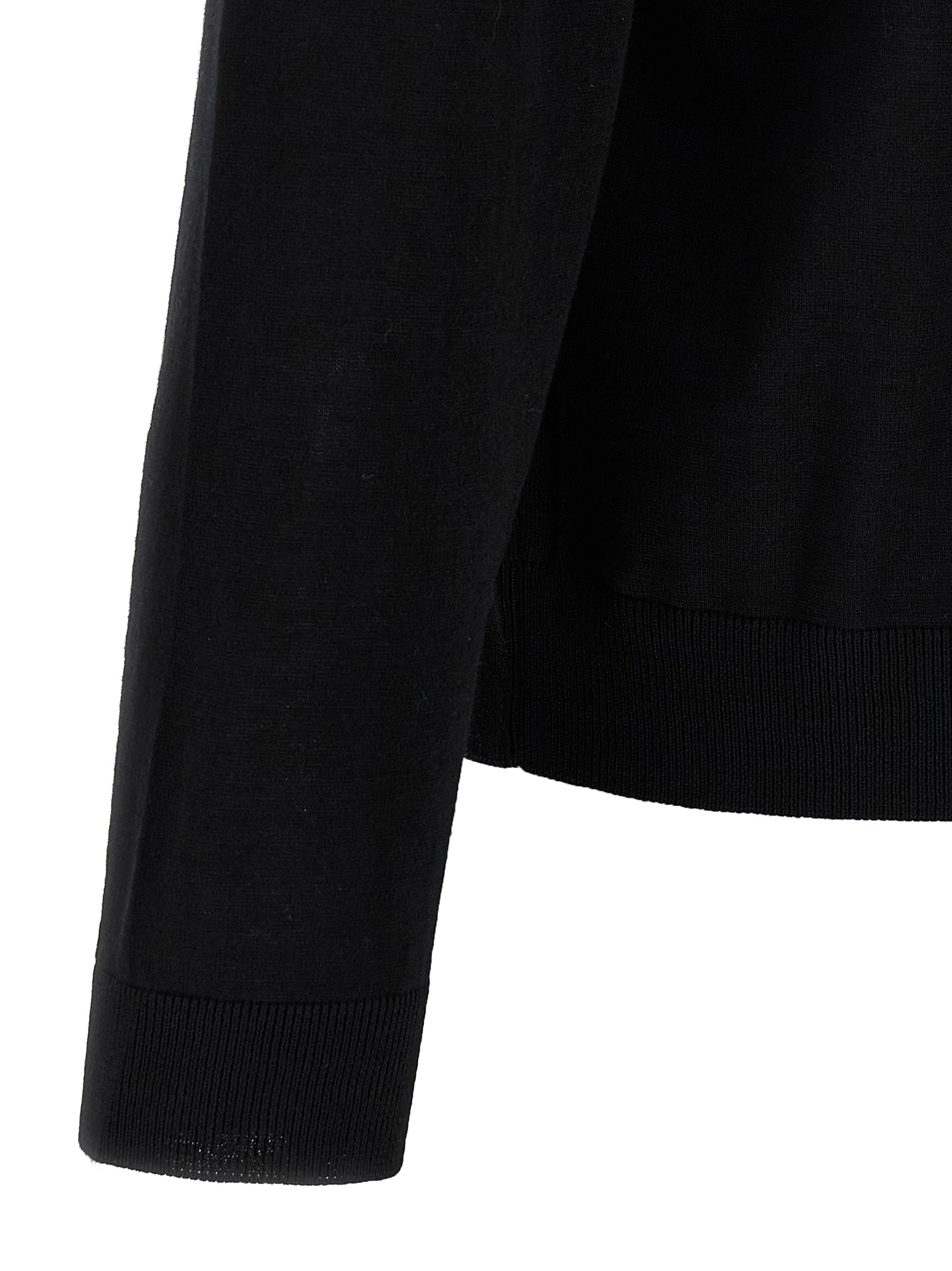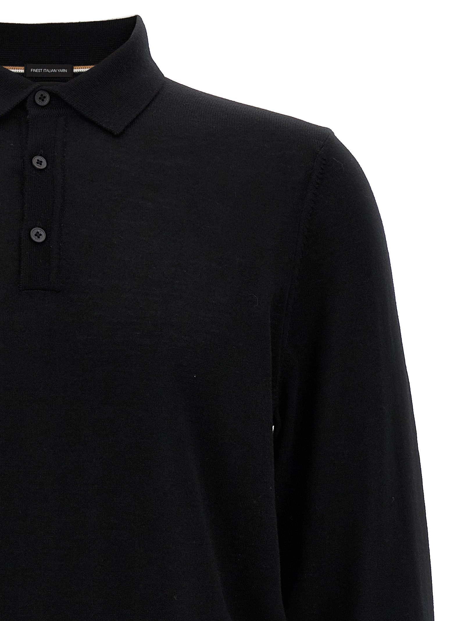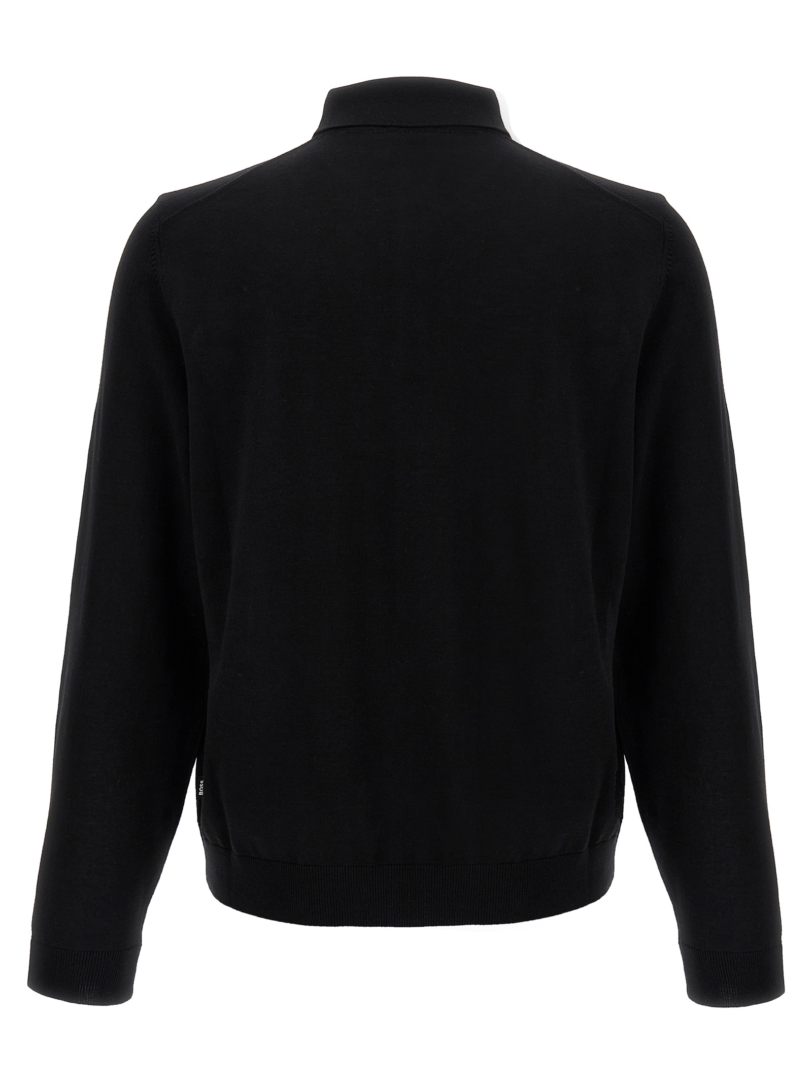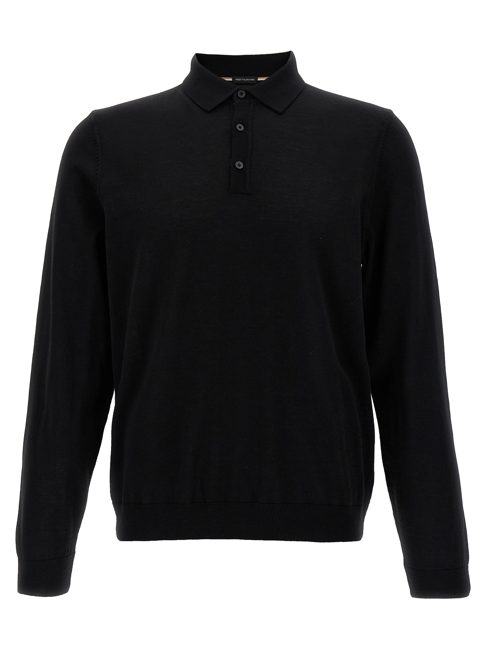 Polo shirt-style wool sweater with shirt collar, two button closure and long cuffed sleeves.