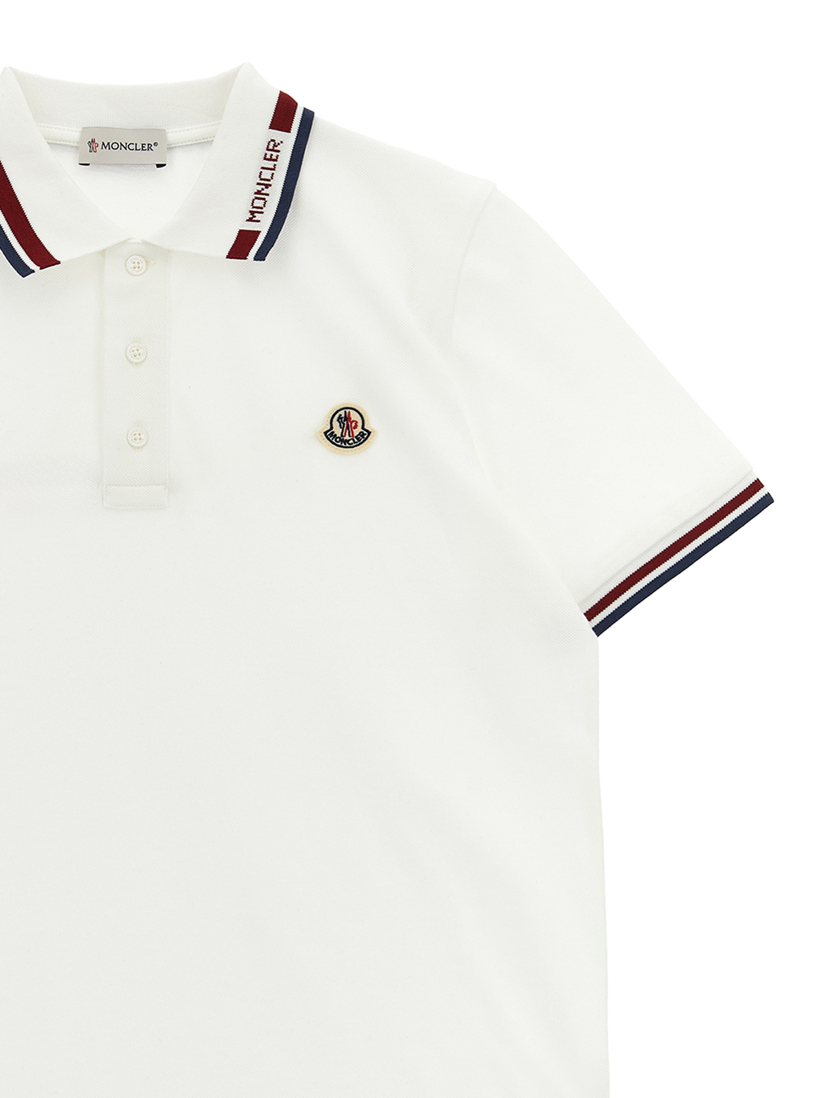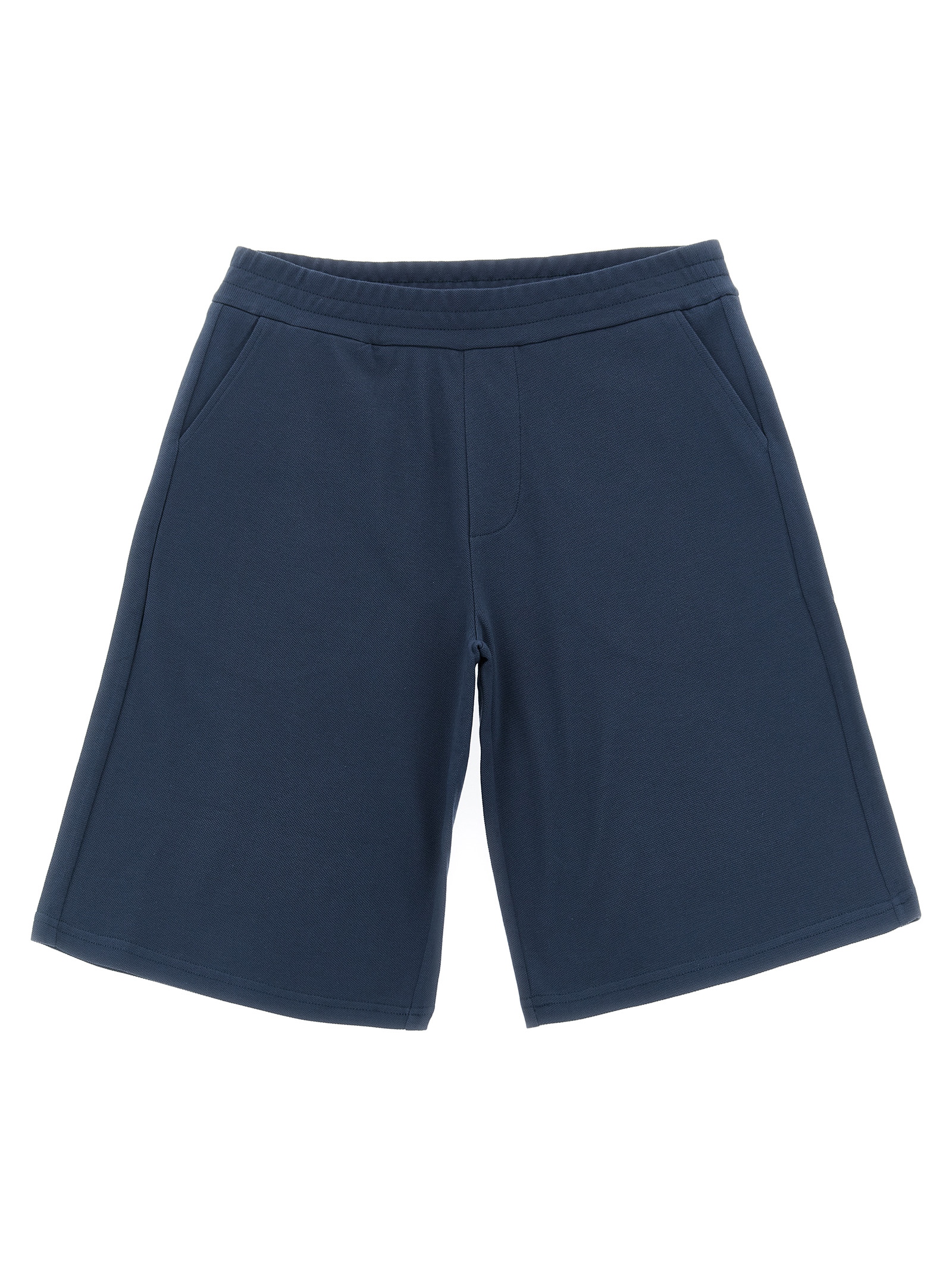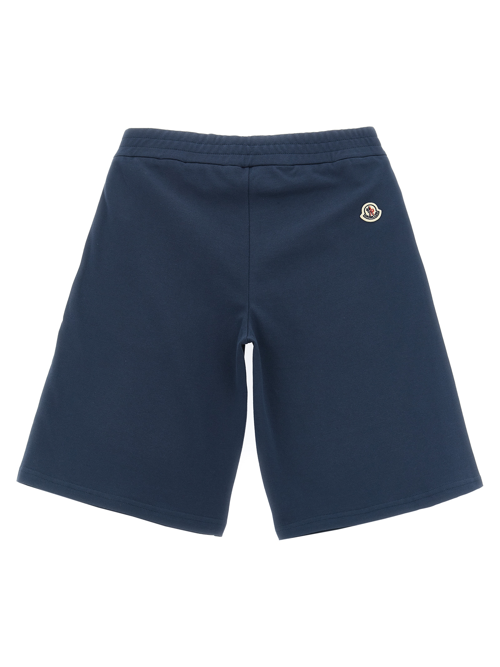 Set in stretch cotton piquet consisting of polo shirt with tricolor trim on the collar and sleeves, front felt logo patch, collar and buttons, short sleeves with cuffs and bermuda shorts with elastic waistband, trompe l’oeil flap.