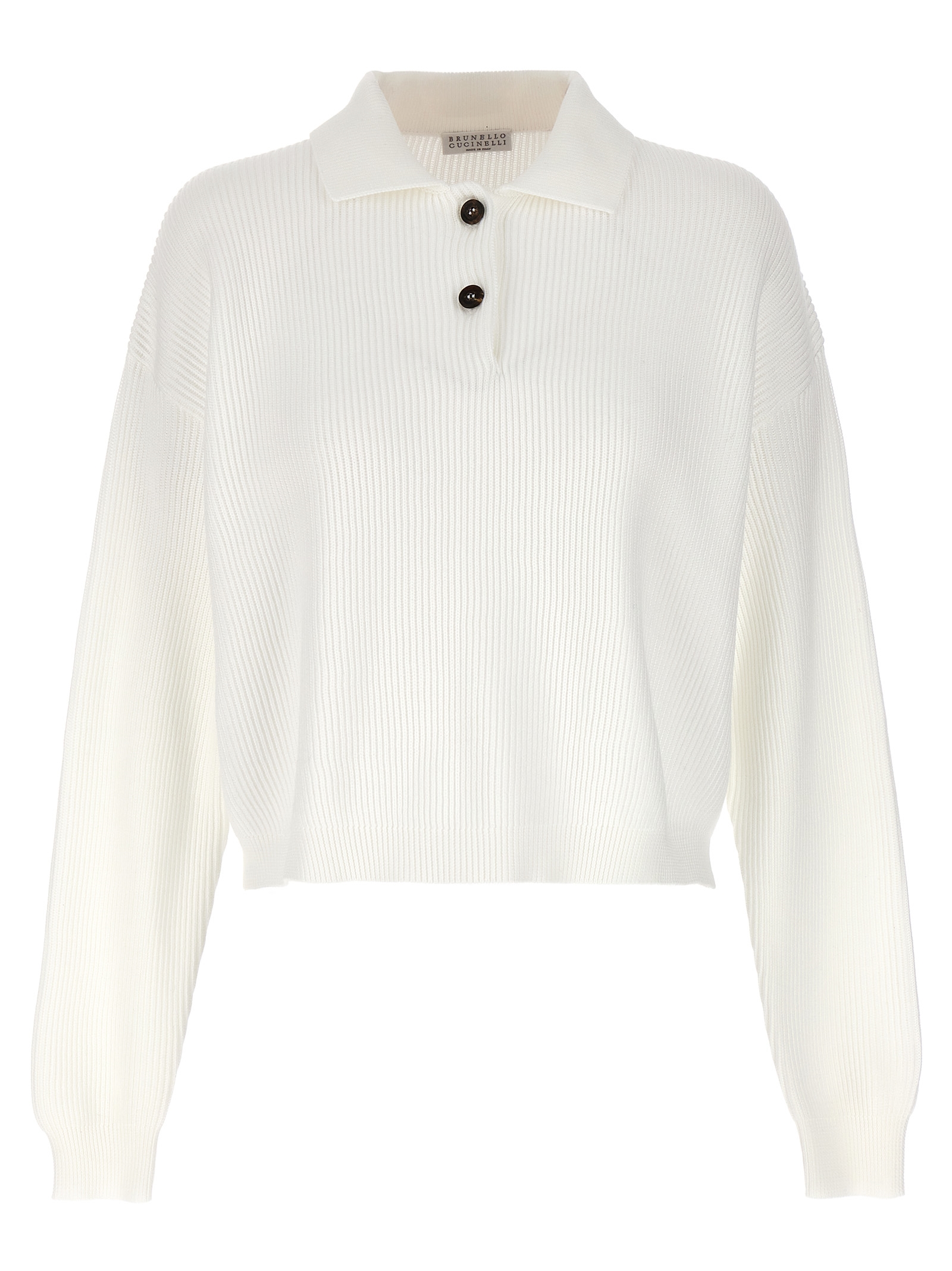 English rib knit cotton polo shirt, collar and buttons, Monile detail on the back, long sleeves with cuffs and dropped shoulders.