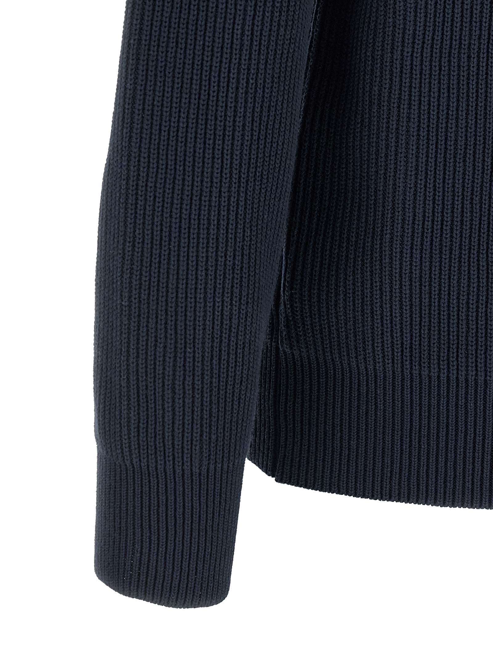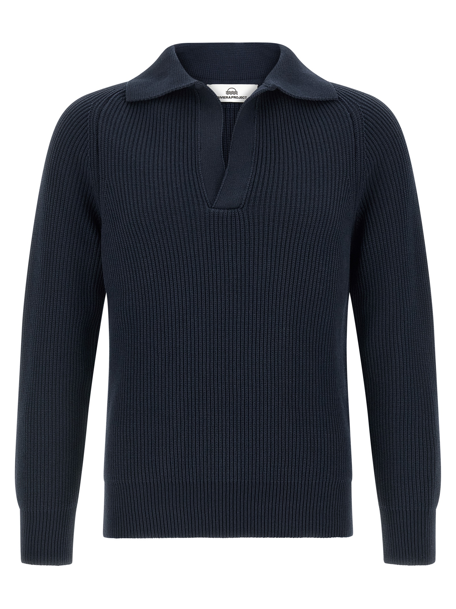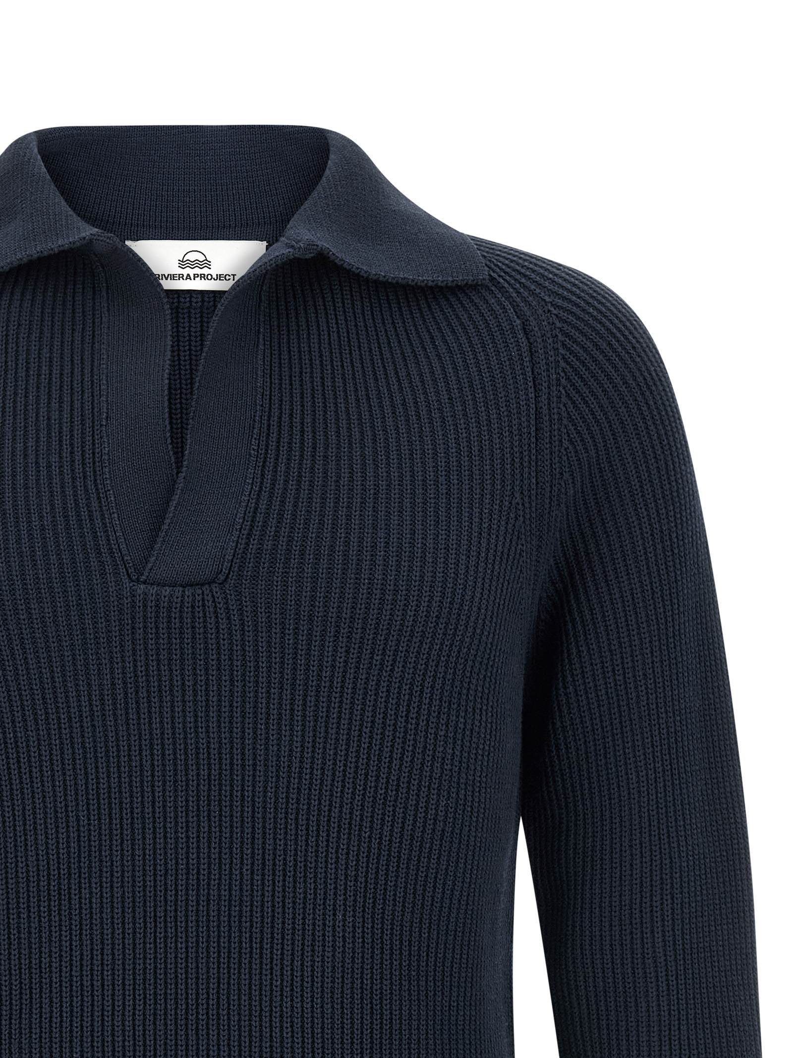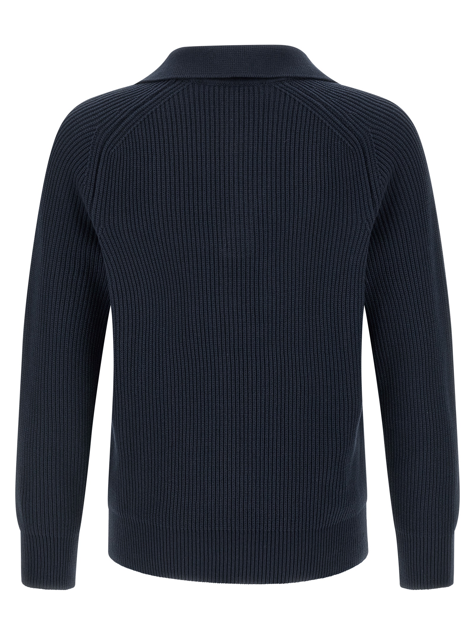 Ribbed knit cotton sweater, polo shirt collar, long raglan sleeves with cuffs.