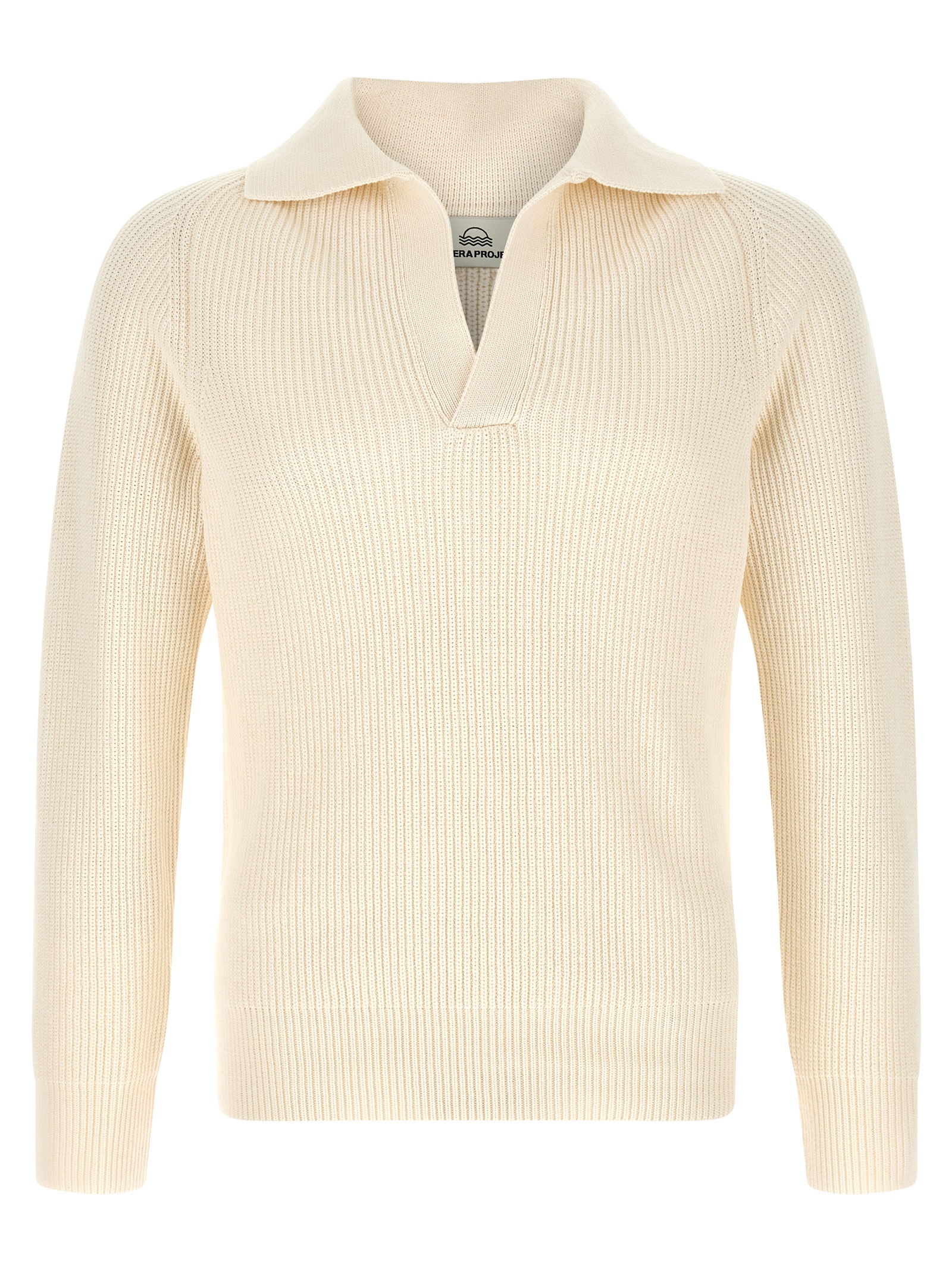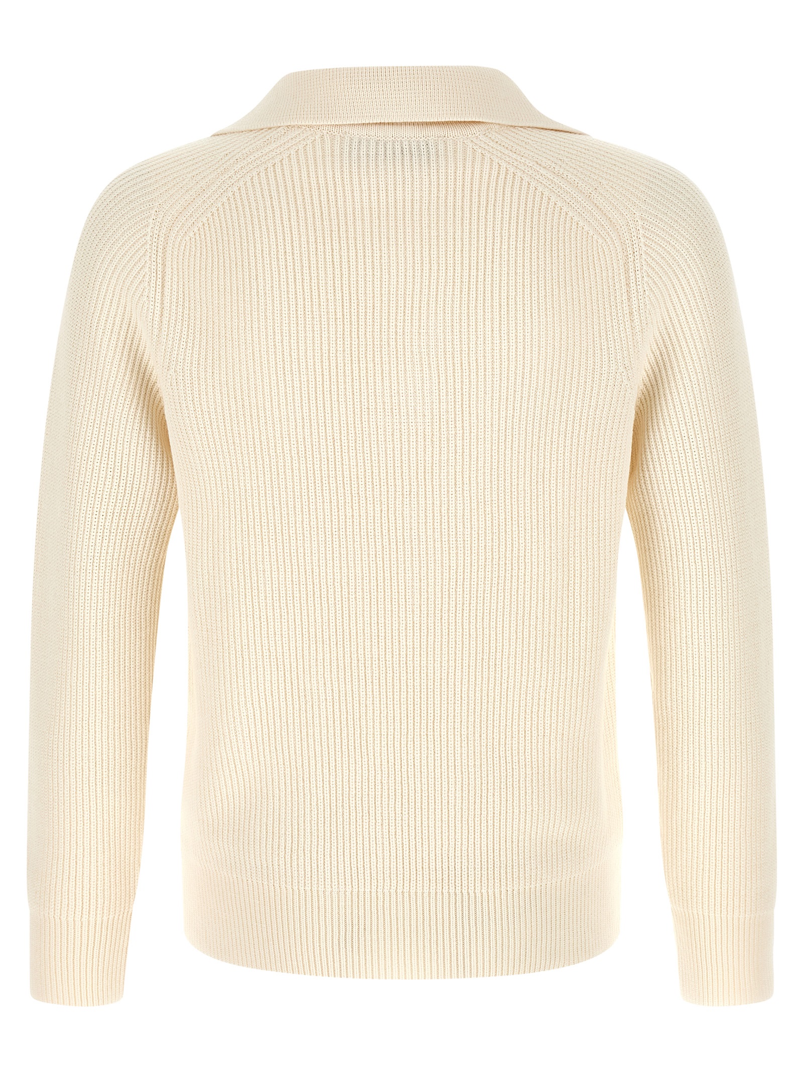 Ribbed knit cotton sweater, polo shirt collar, long raglan sleeves with cuffs.
