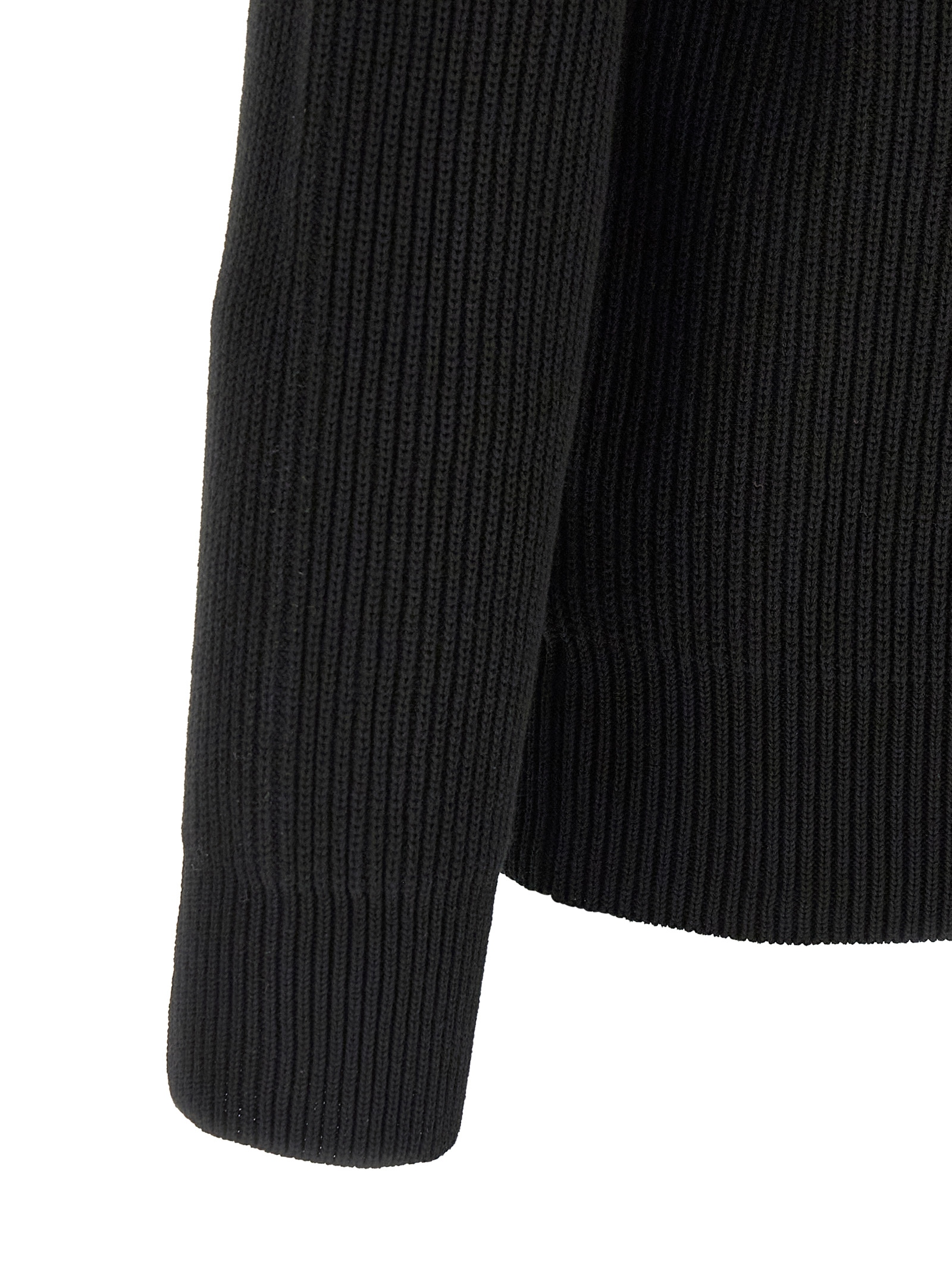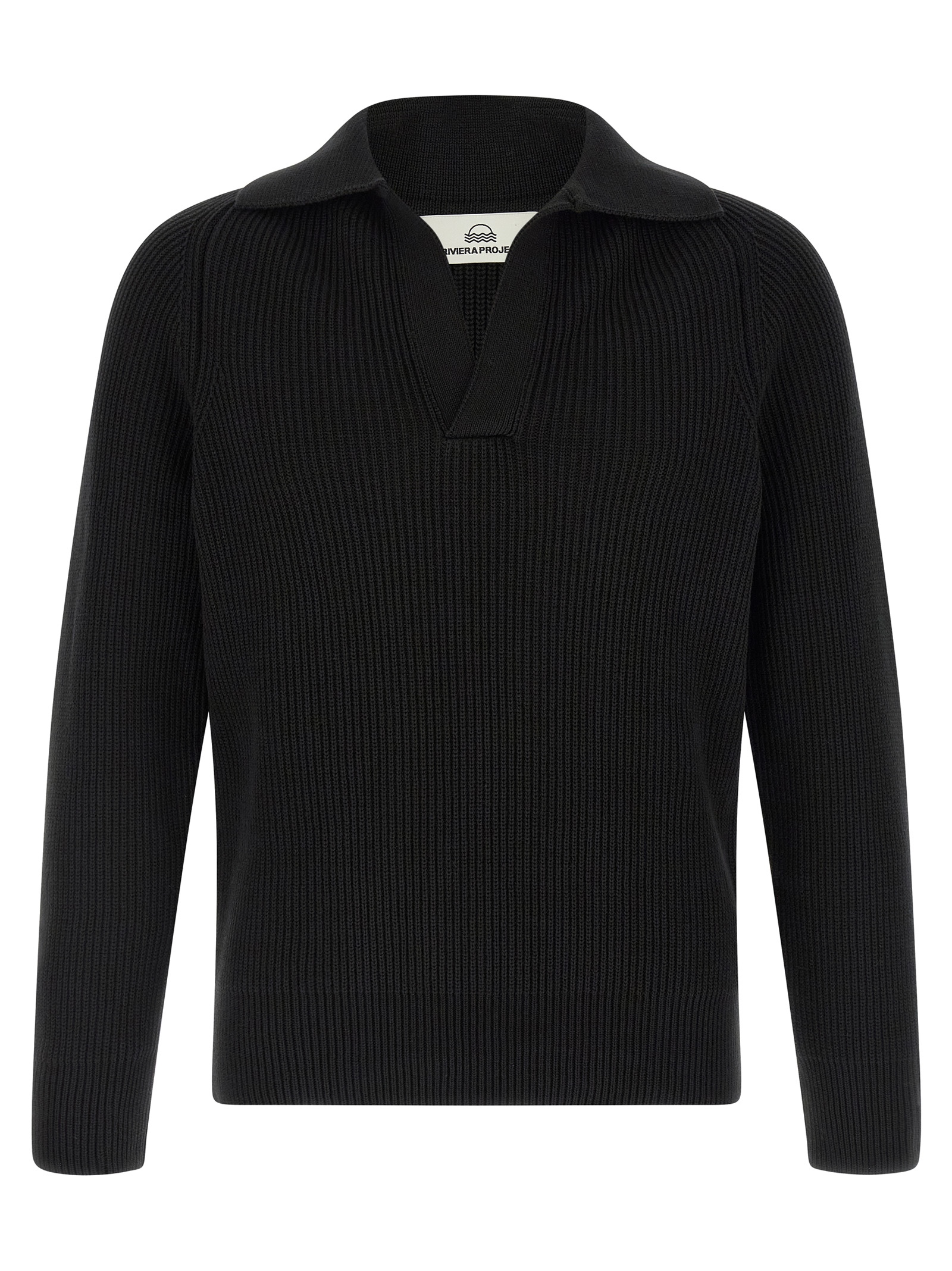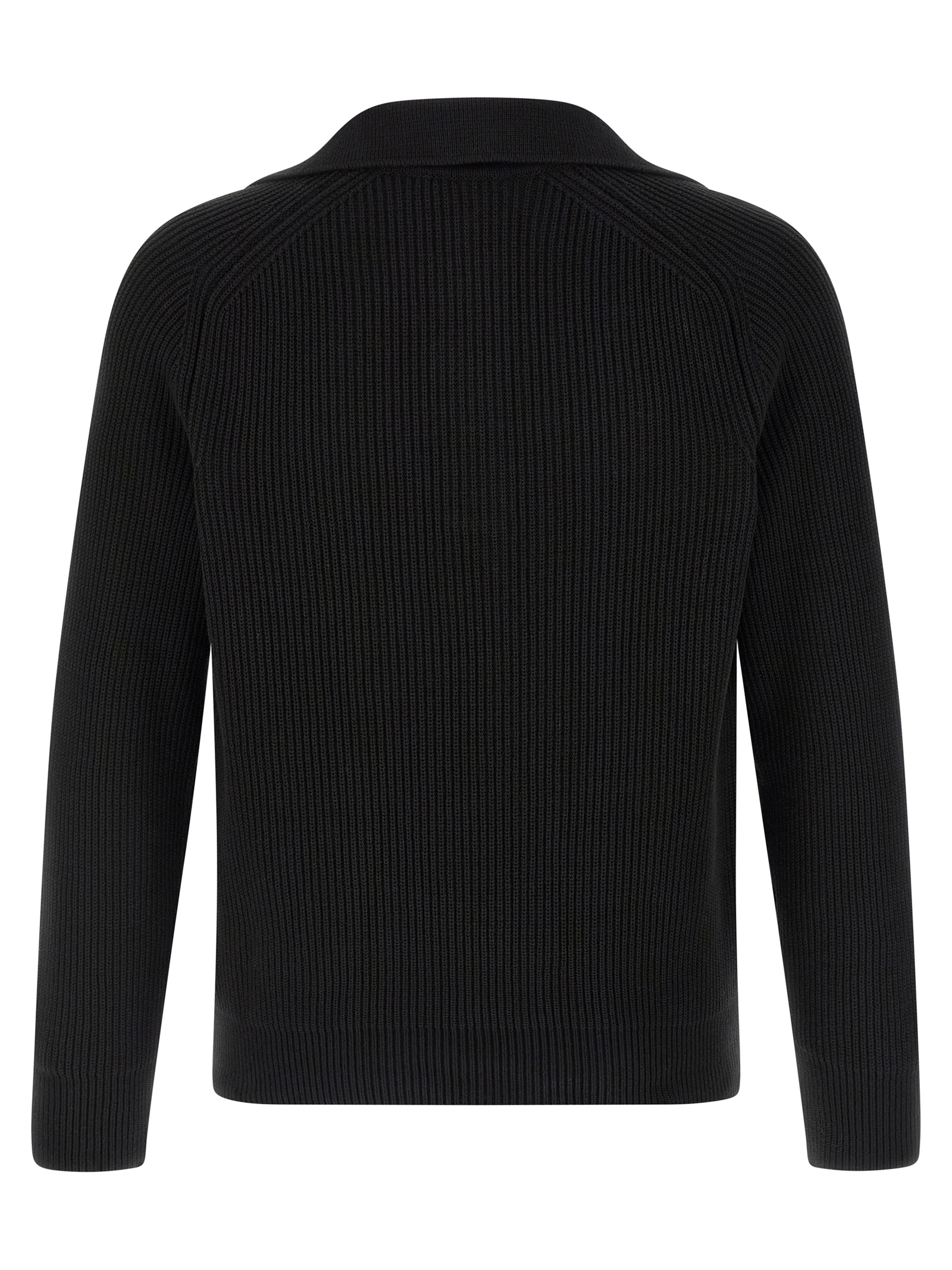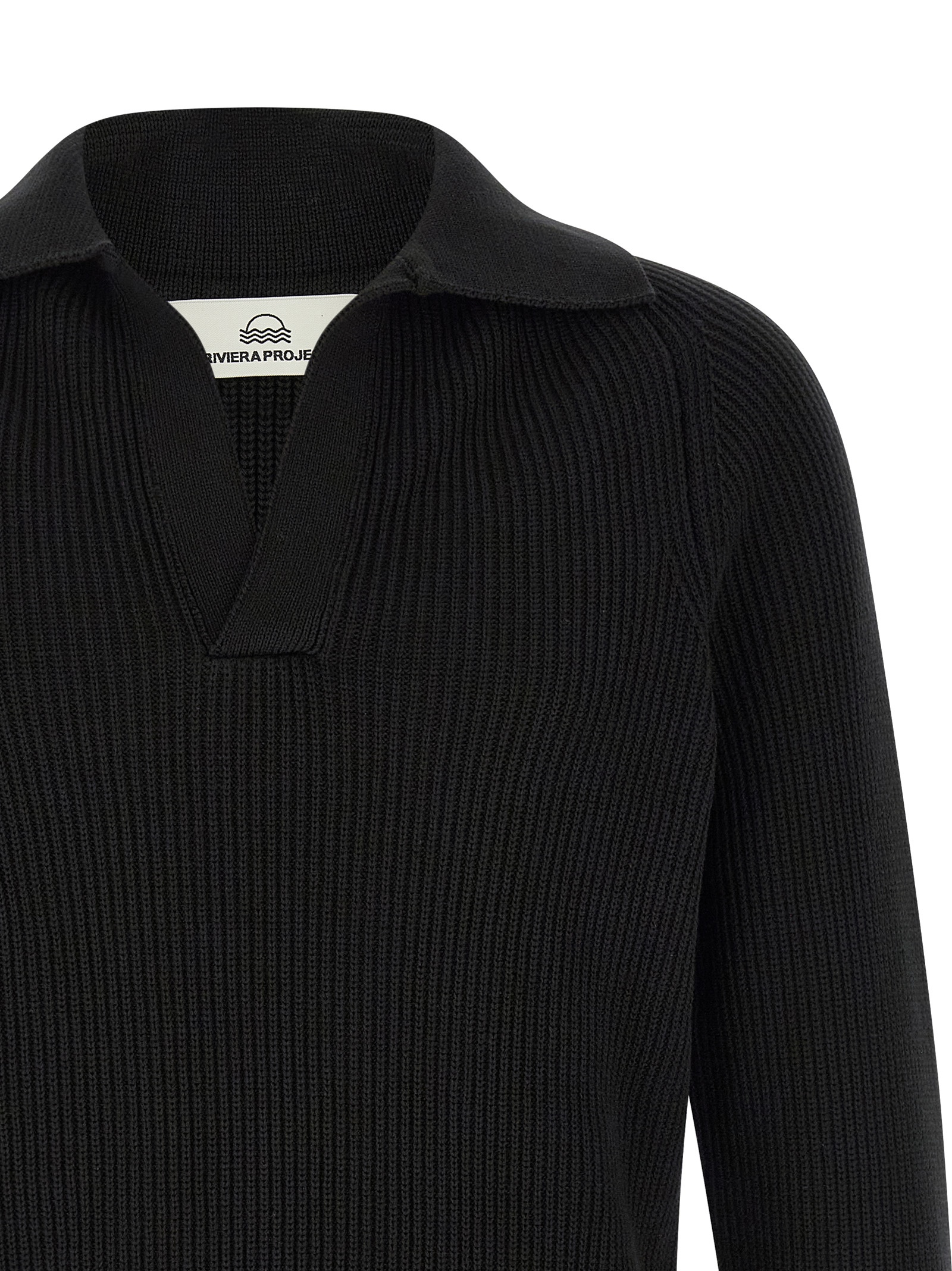 Ribbed knit cotton sweater, polo shirt collar, long raglan sleeves with cuffs.