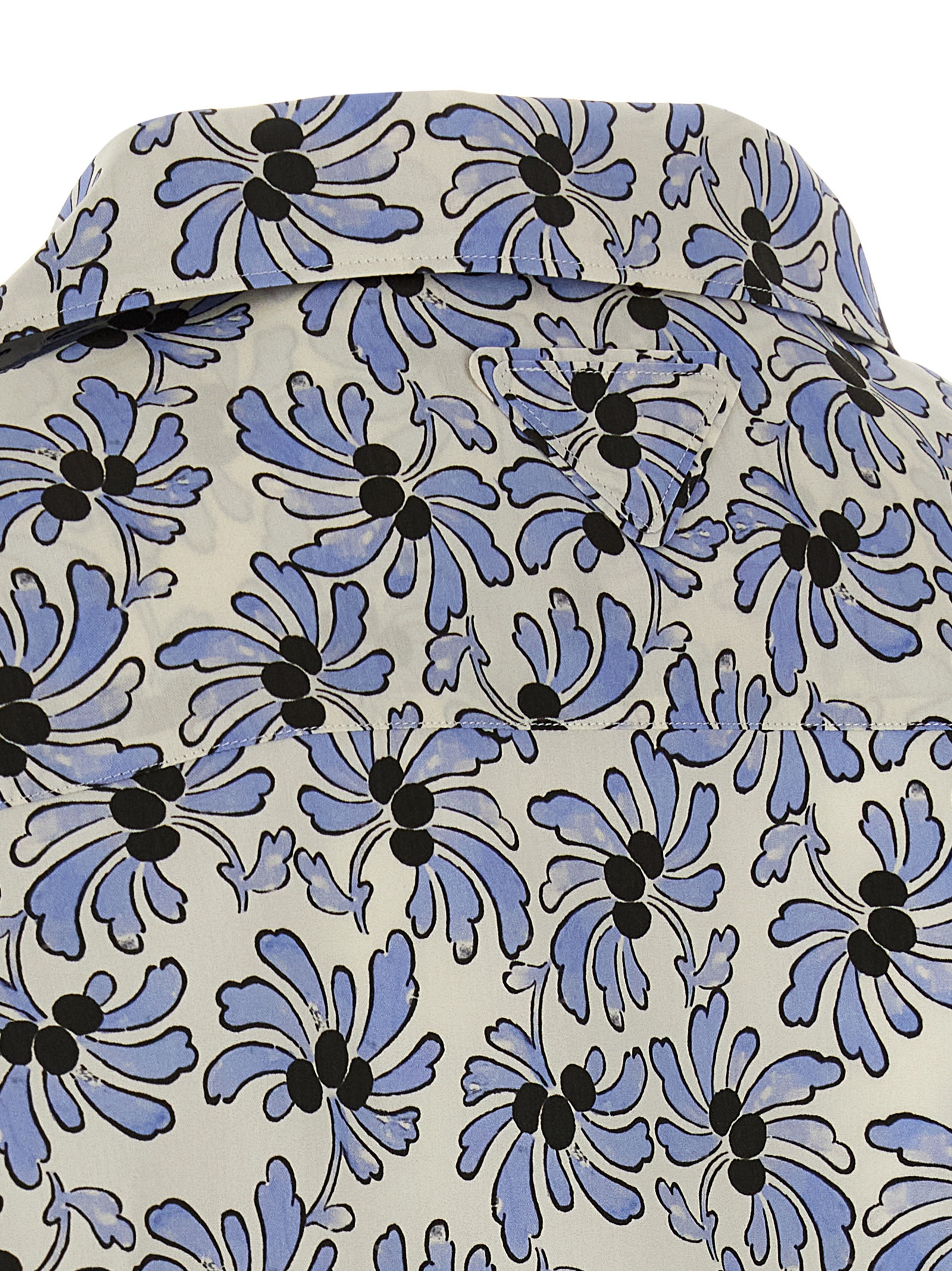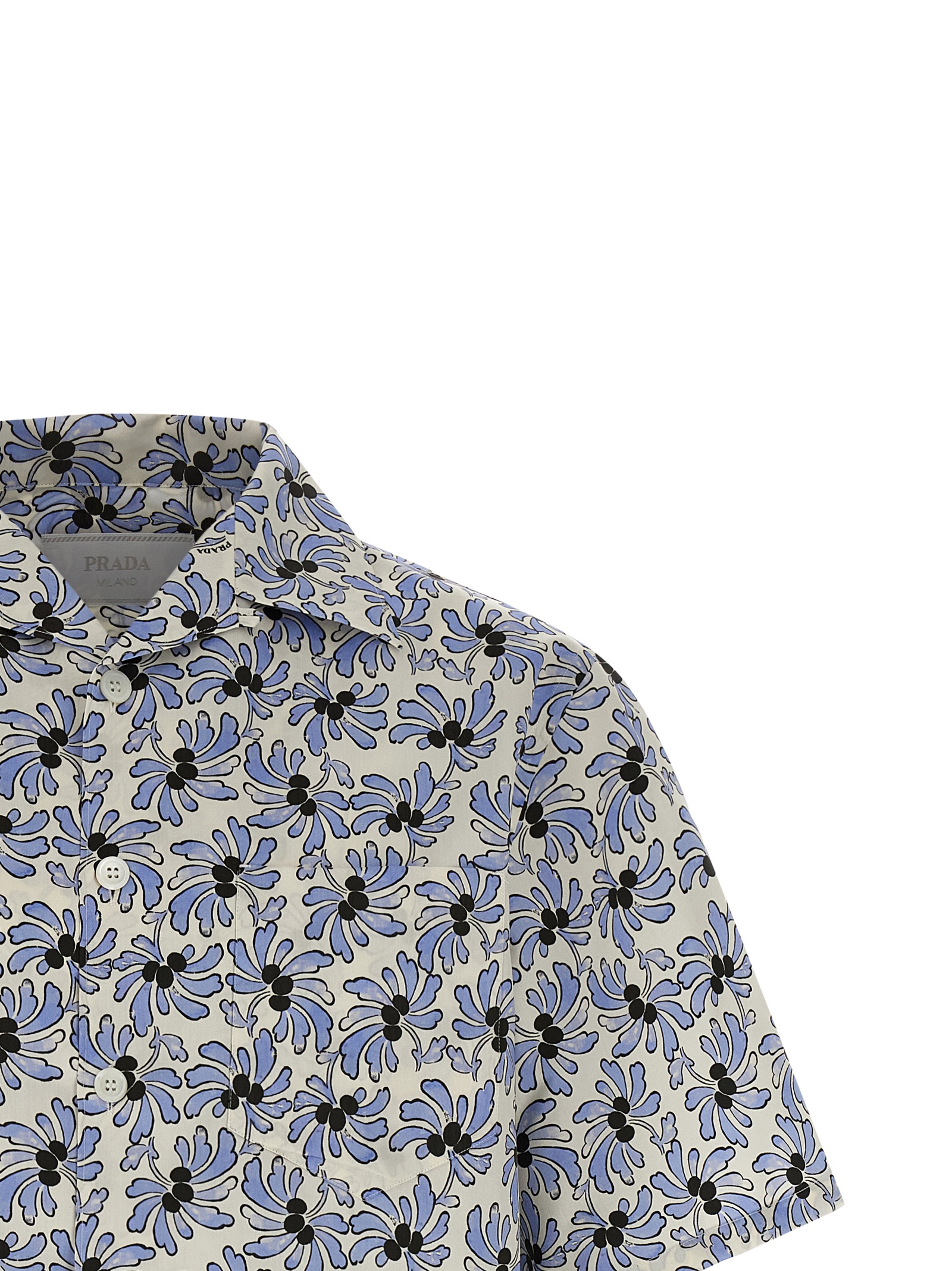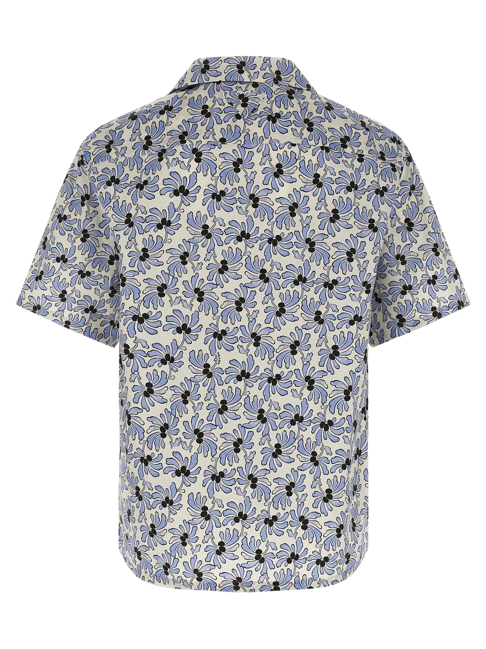 All-over ‘Fresia’ print cotton and silk blend pongé shirt with bowling style, tone-on-tone triangle fabric logo on the back, breast pocket, front mother-of-pearl button closure, short sleeves, side slits on the hem.
