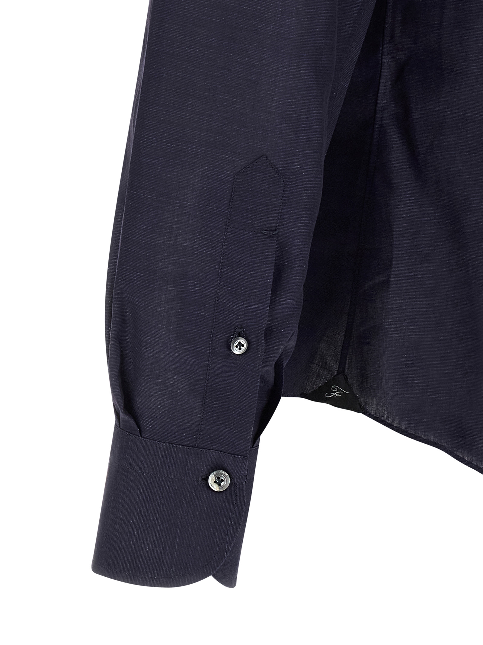 ‘Porto’ cotton and linen blend blouse, ‘Achille’ collar, breast pocket, front mother-of-pearl button closure, long cuffed sleeves, rounded hem with satin logo detail on the side slits.