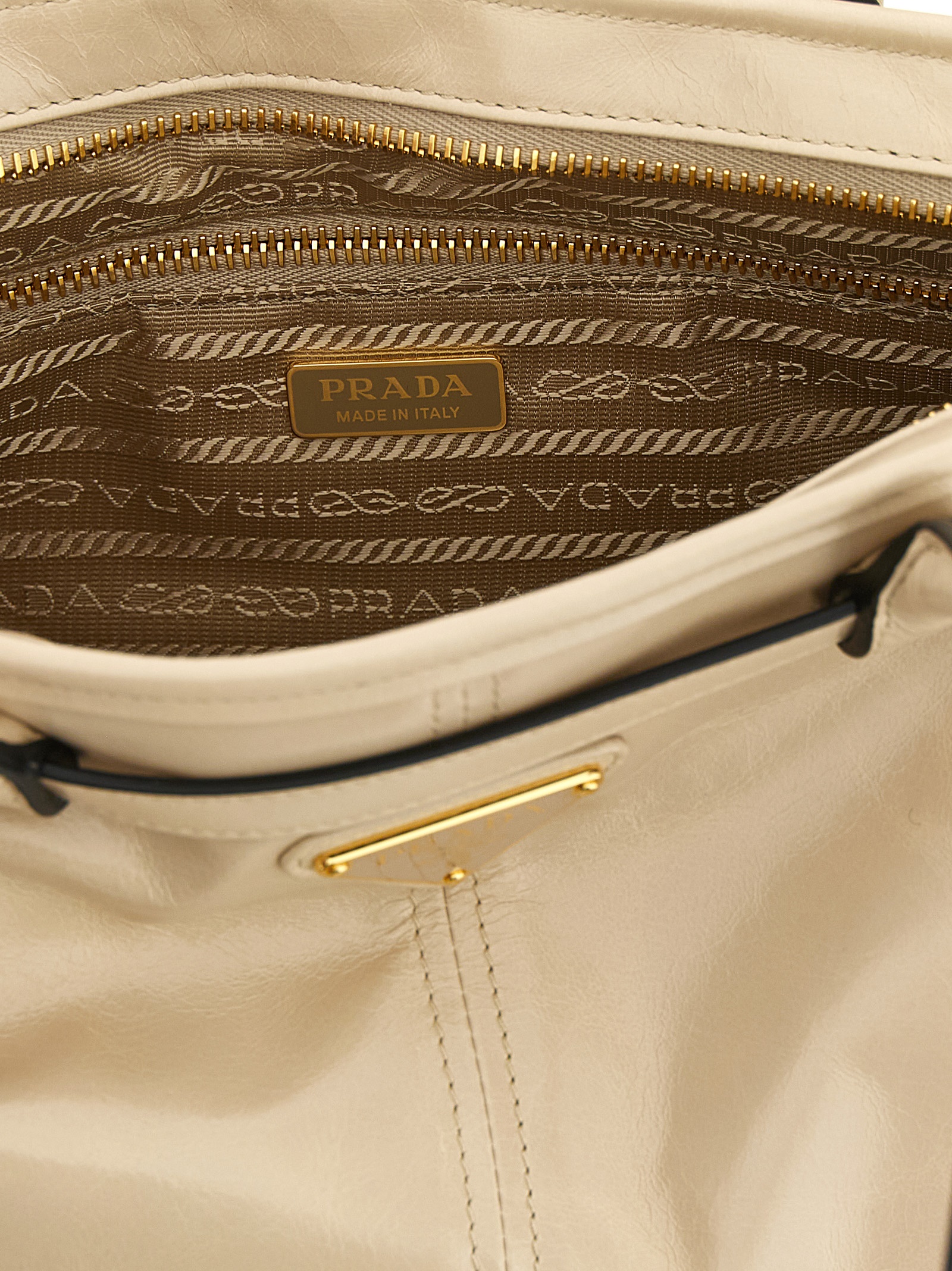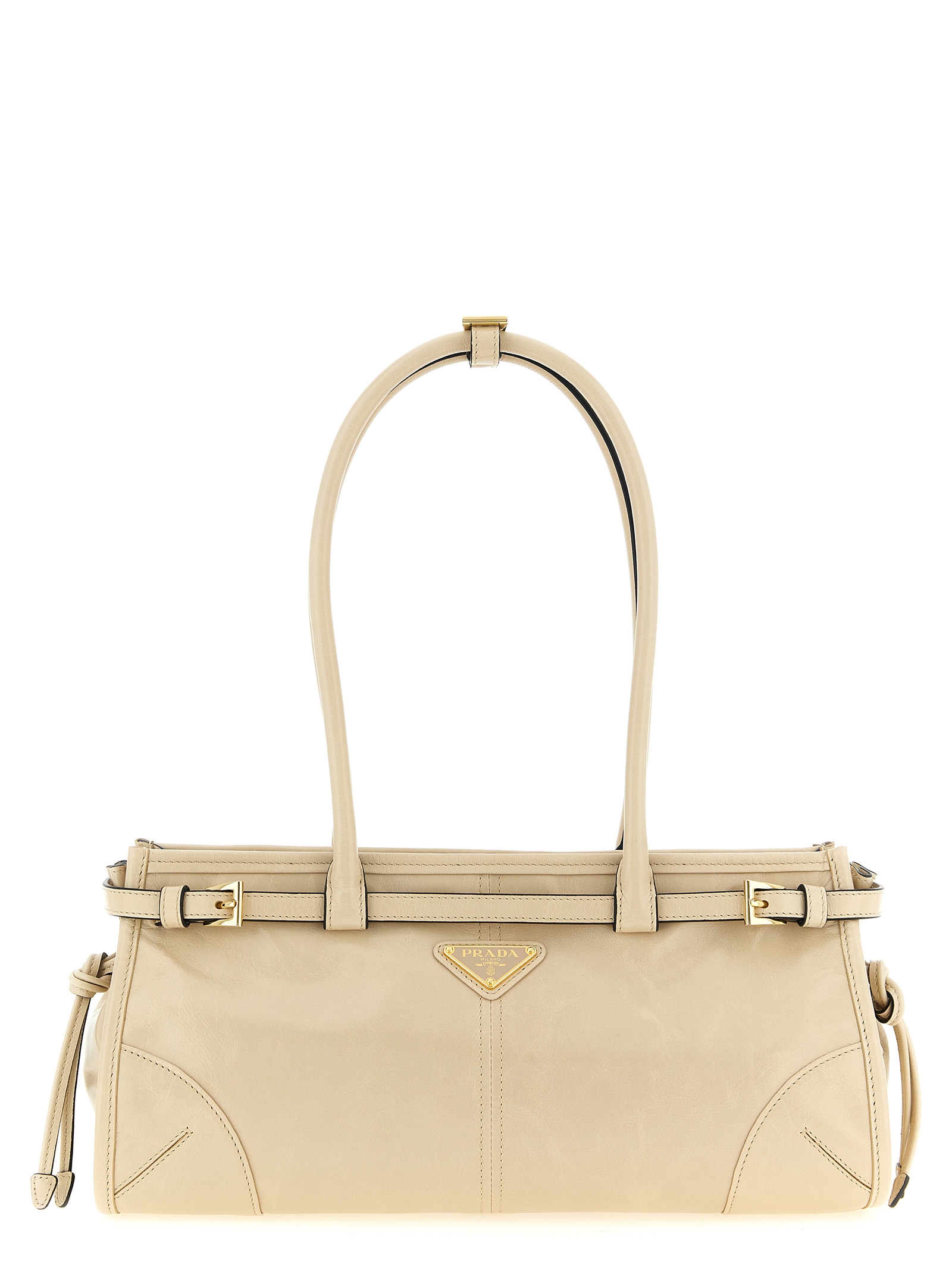 ‘Prada Bonnie’ leather handbag with polished finish, rectangular silhouette, front enameled metal triangle logo, adjustable strap detail, side drawstrings, double fixed tubular handle, top zip closure, nappa and nylon lining, adjustable and removable shoulder strap.