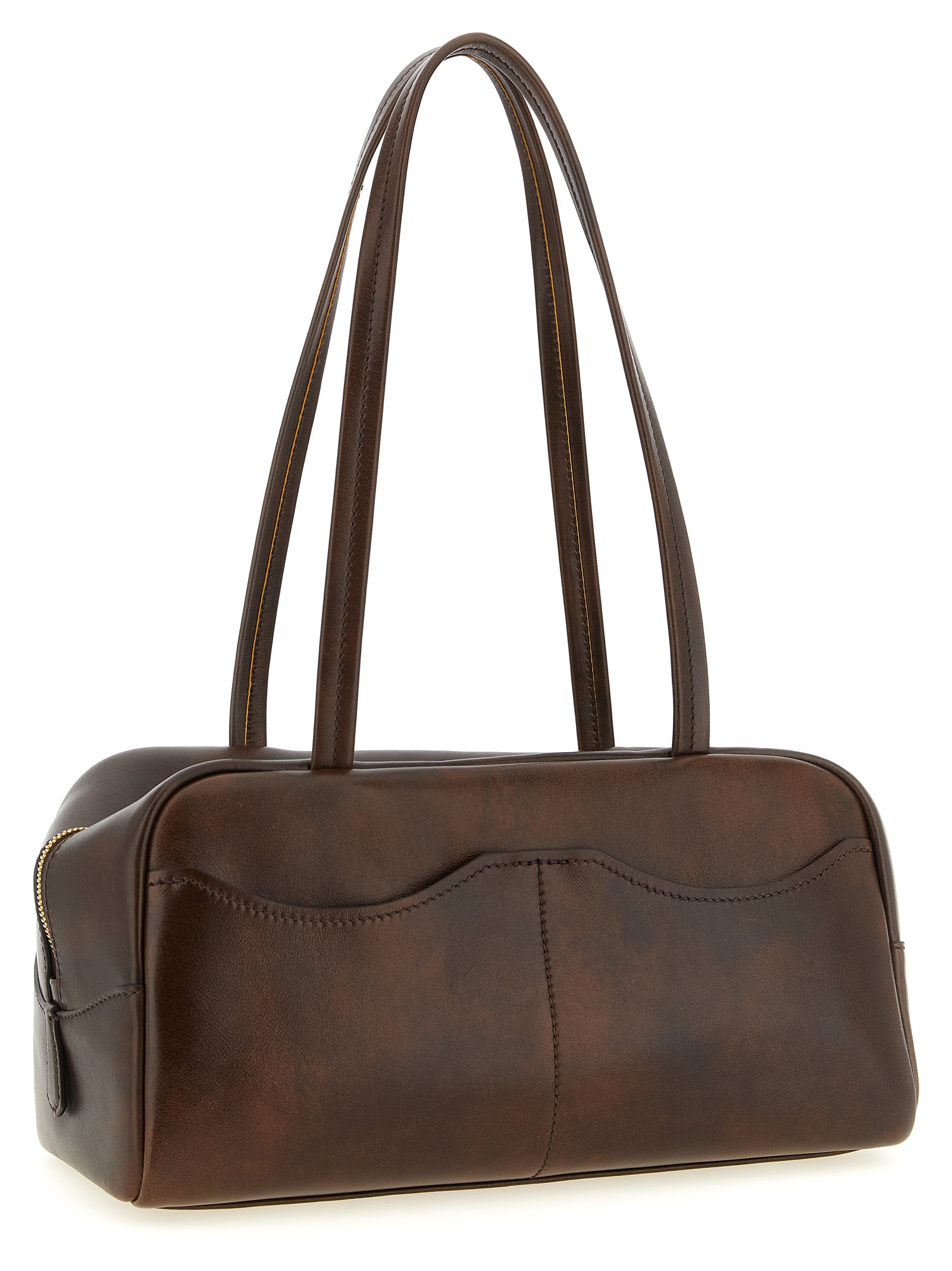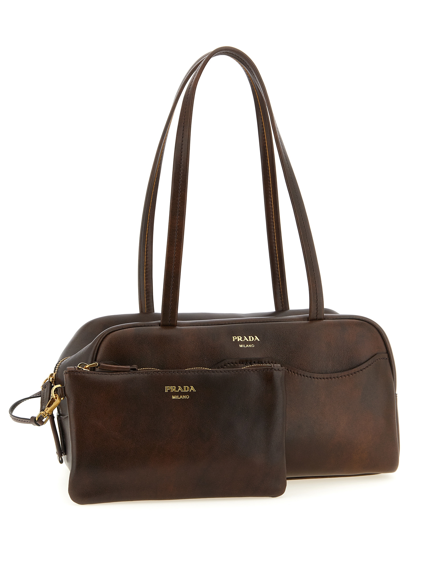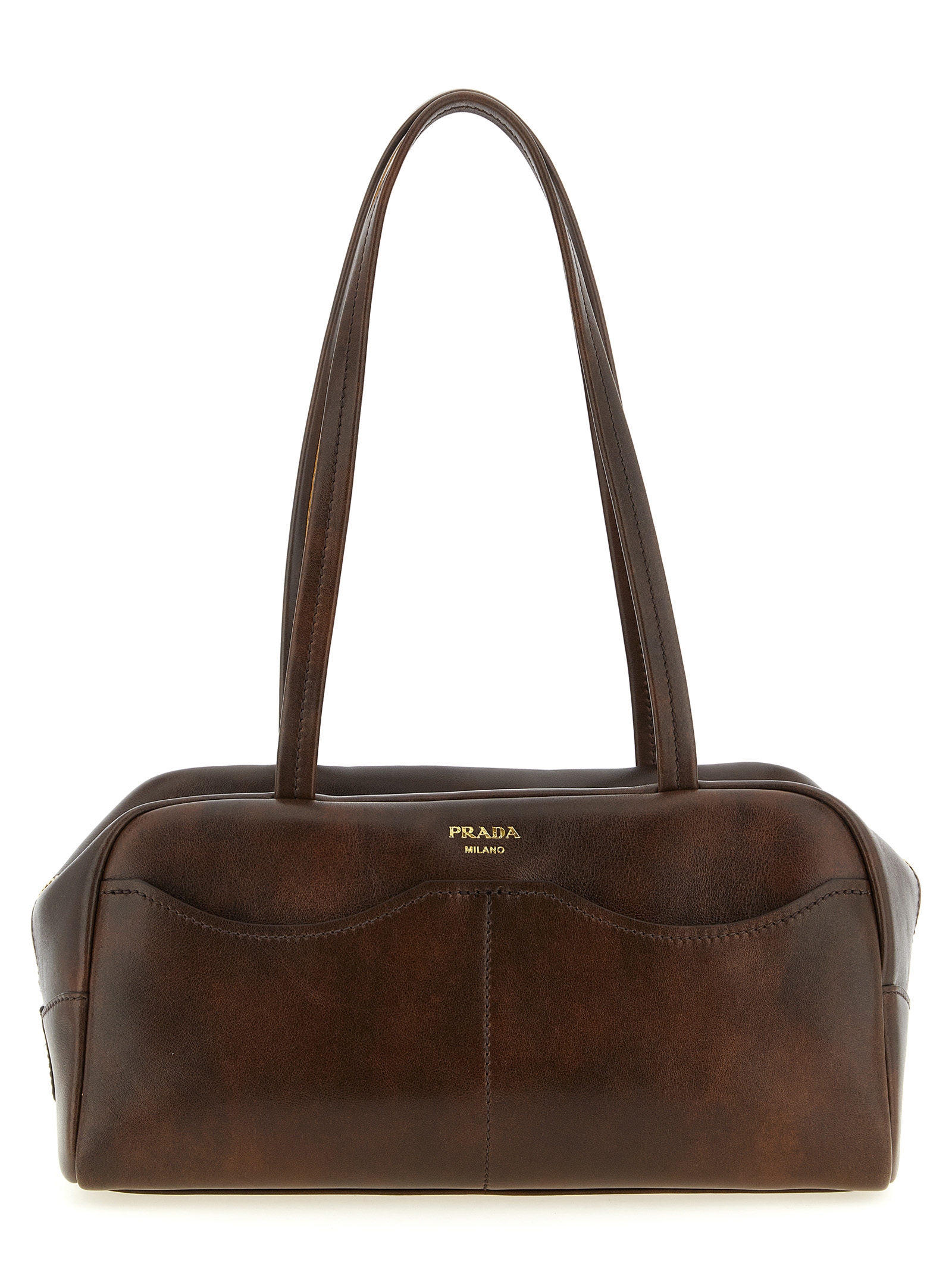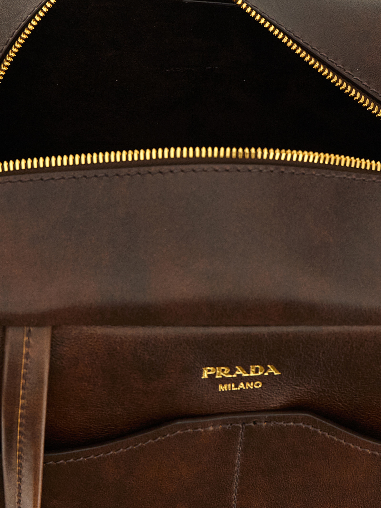 ‘Prada Carry’ large top case in antique leather, embossed logo and front pockets, top zip closure, double fixed handle, suede lining, removable pouch.