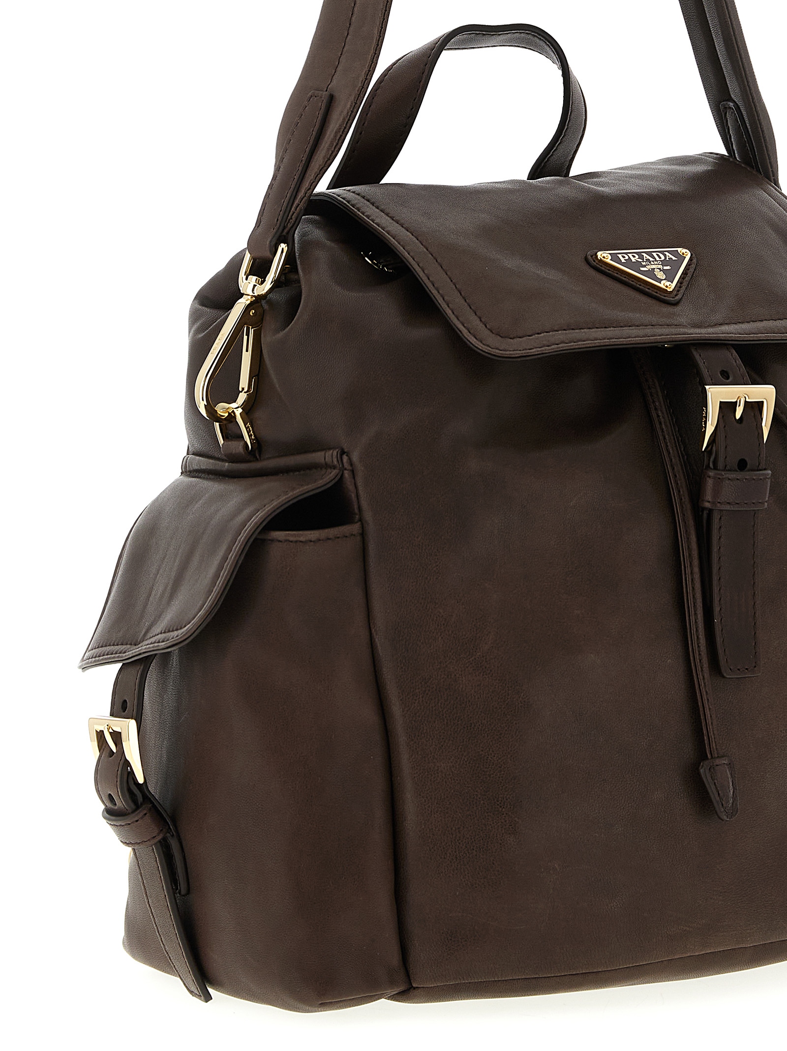 ‘Prada Explore’ nappa medium backpack, multi-pocket silhouette, front enameled metal triangle logo, magnetic flap closure with adjustable strap, fixed short handle, removable long handle, adjustable and removable logo tape shoulder straps, inner drawstring.