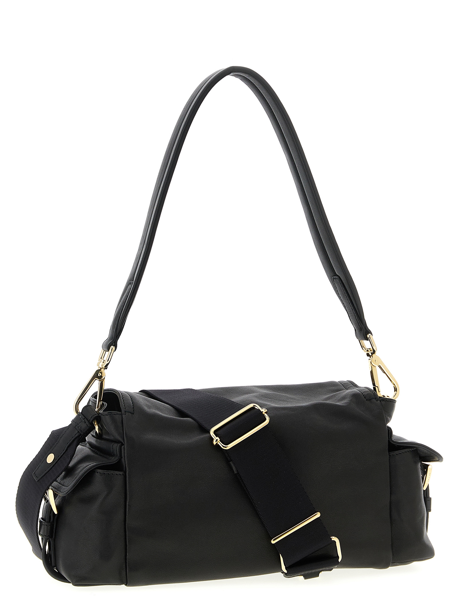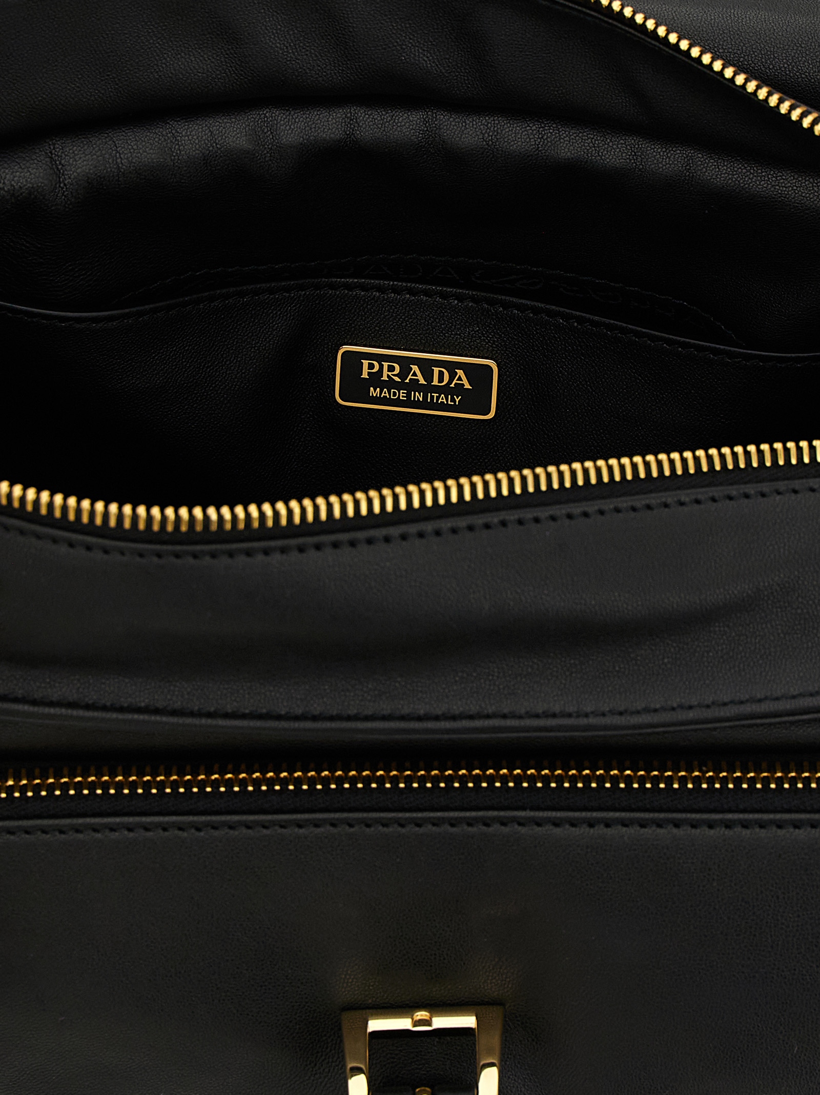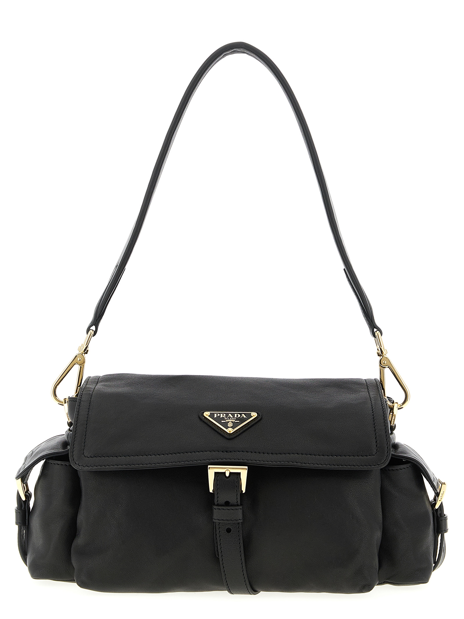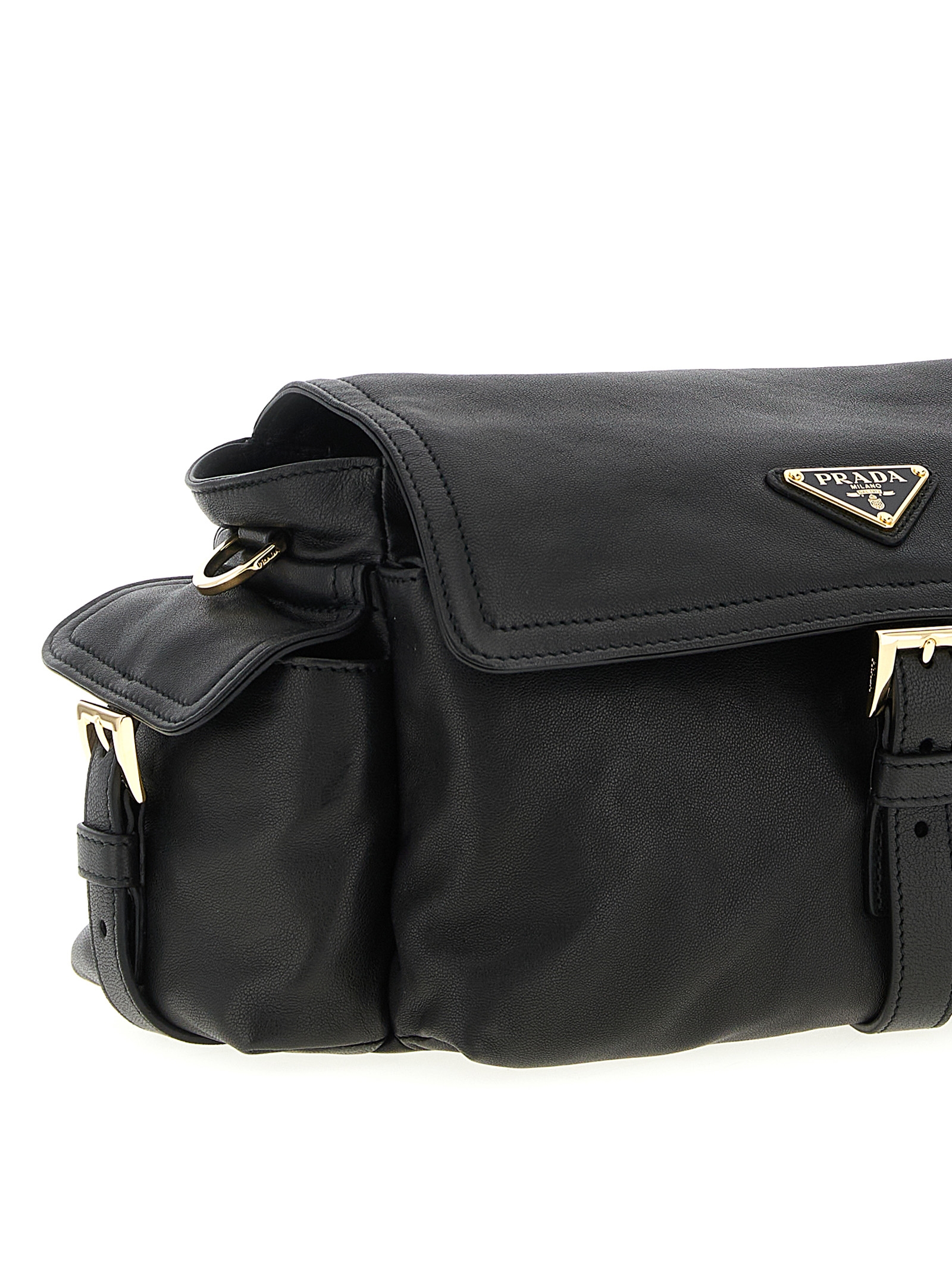 ‘Prada Explore’ shoulder bag in hand-treated nappa leather for a worn effect, multi-pocket silhouette, flap closure with adjustable strap and front enameled metal triangle logo, inner zip closure, removable handle, adjustable and removable logo tape shoulder strap, logo nylon lining.