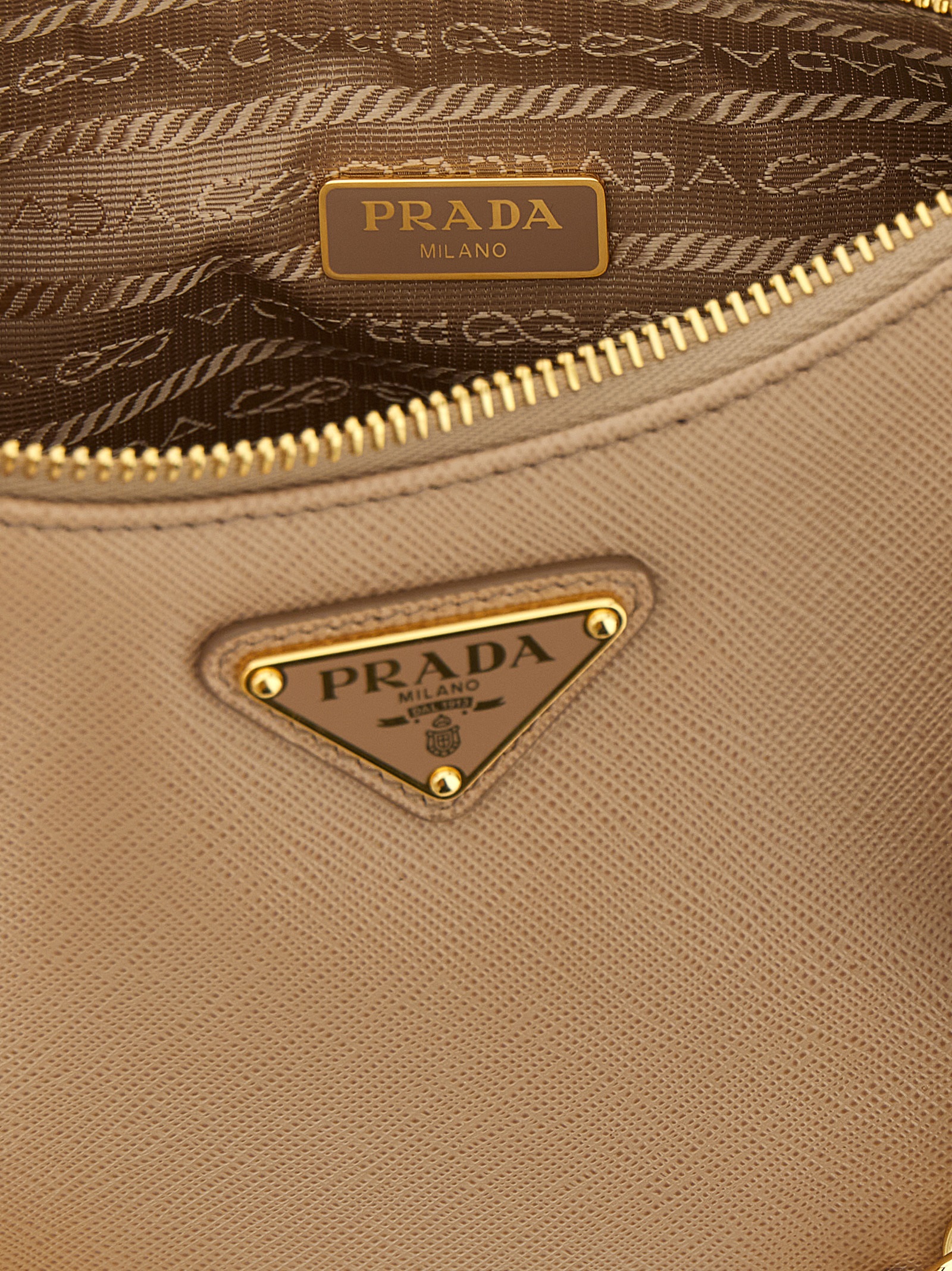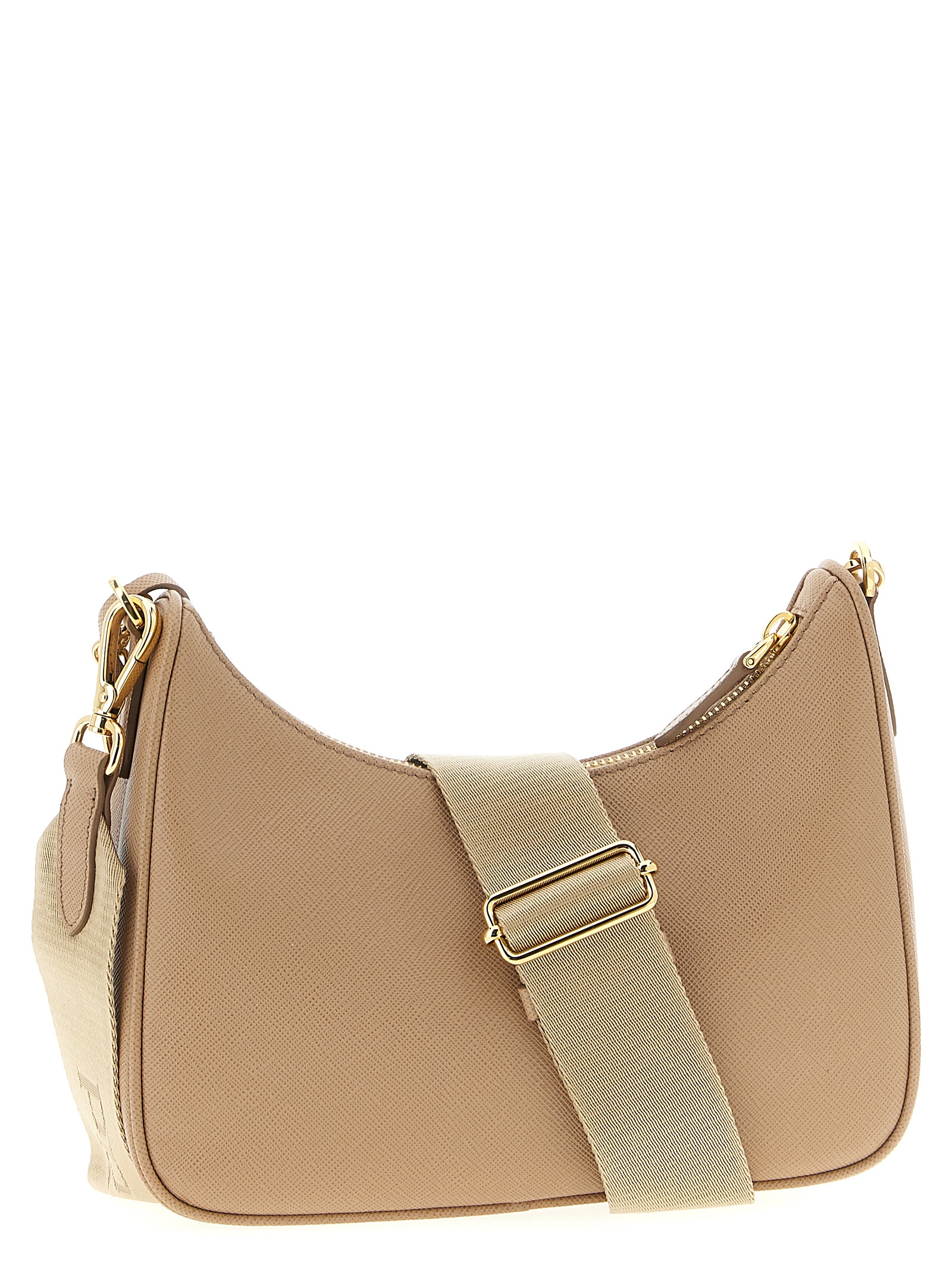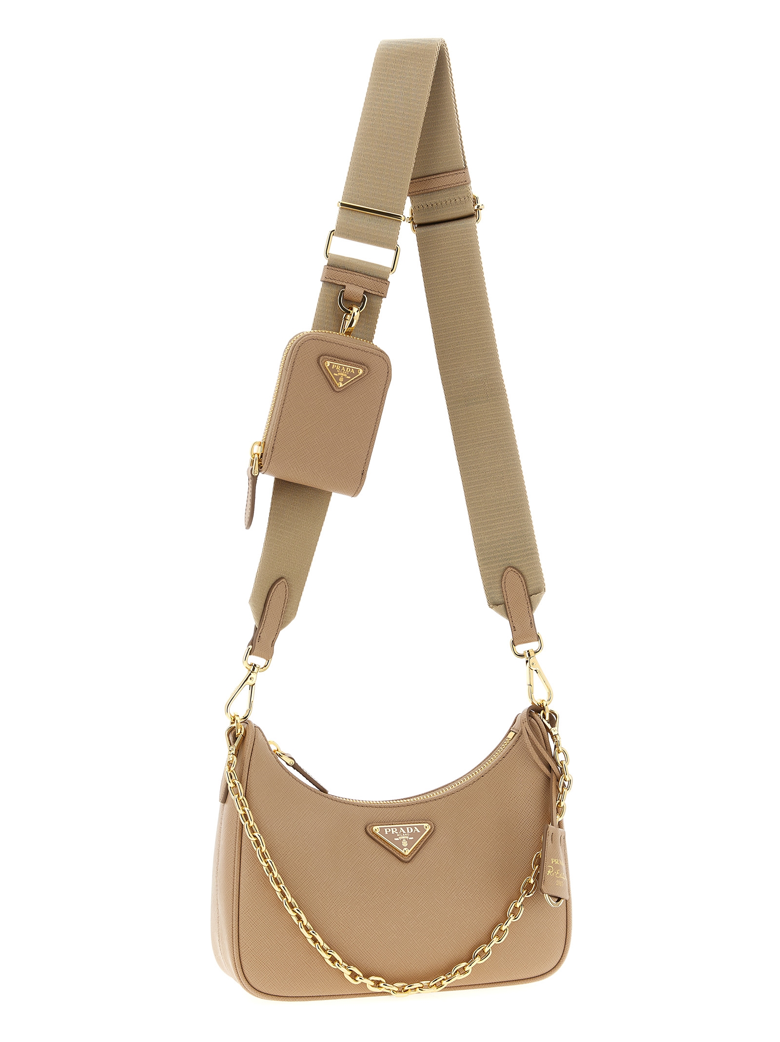 ‘Prada Re-Edition 2005’ shoulder bag in Saffiano leather with front enameled metal triangle logo, top zip closure, fabric shoulder strap with adjustable and removable jacquard logo, removable chain handle, removable pouch, removable leather and metal key ring.