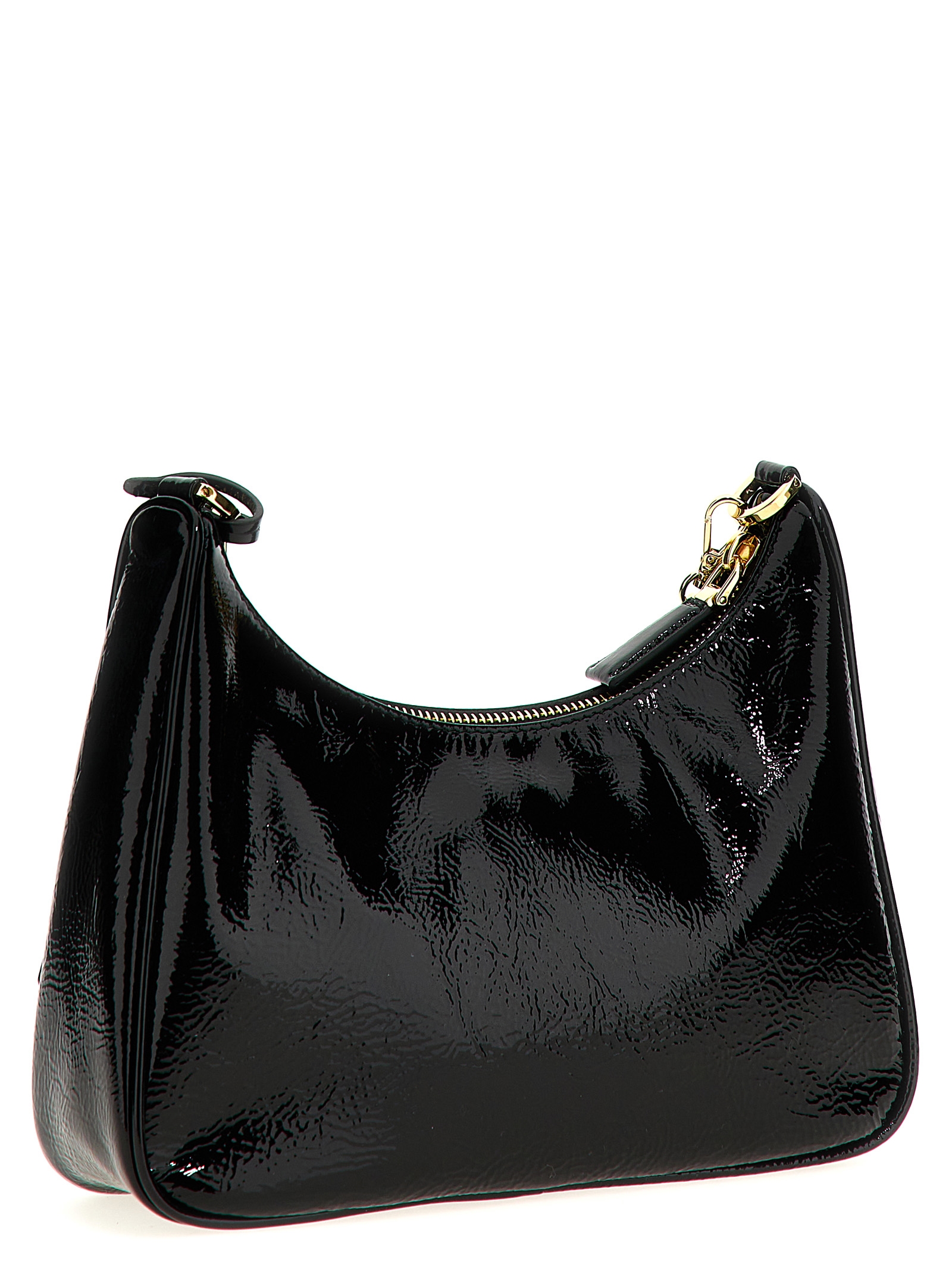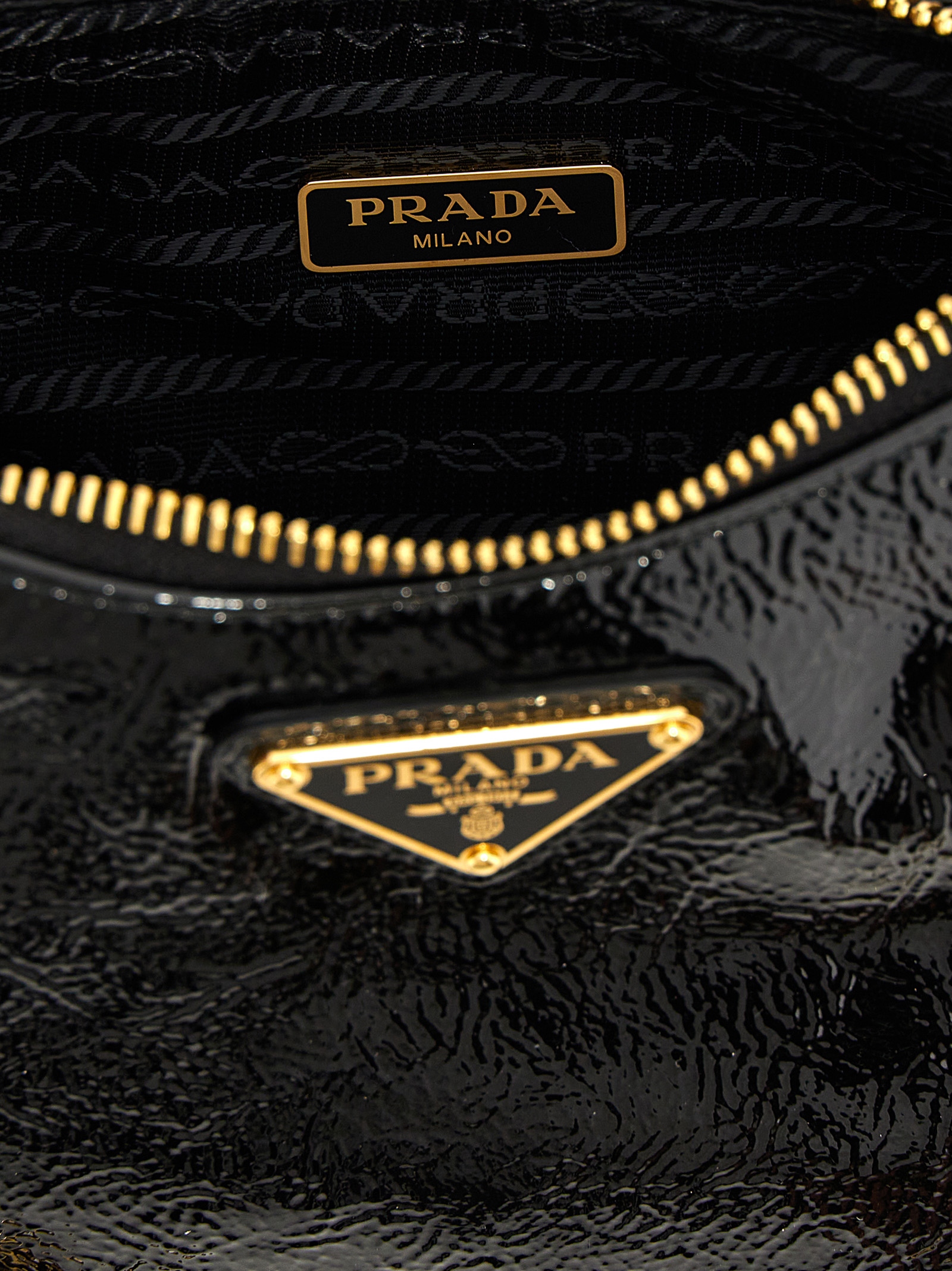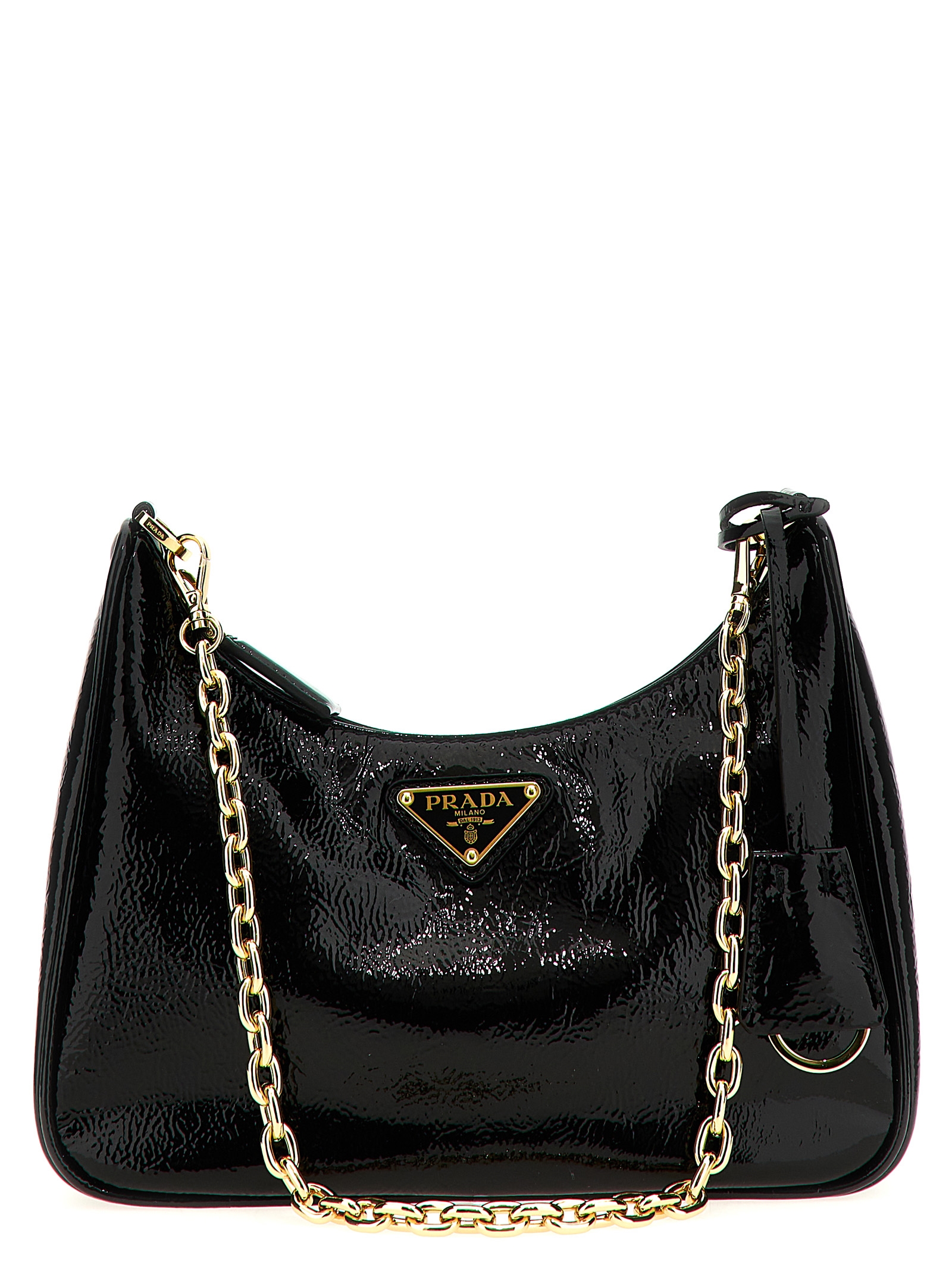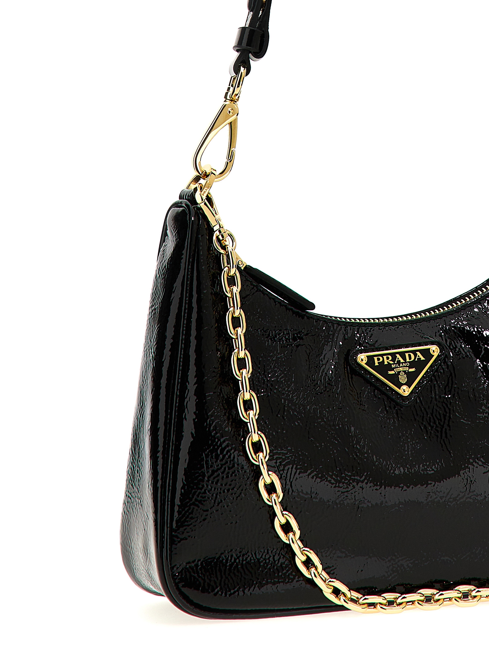 ‘Prada Re-Edition’ mini naplak patent leather handbag, front enameled metal triangle logo appliqué, zip closure, removable chain handle, adjustable and removable leather handle.
